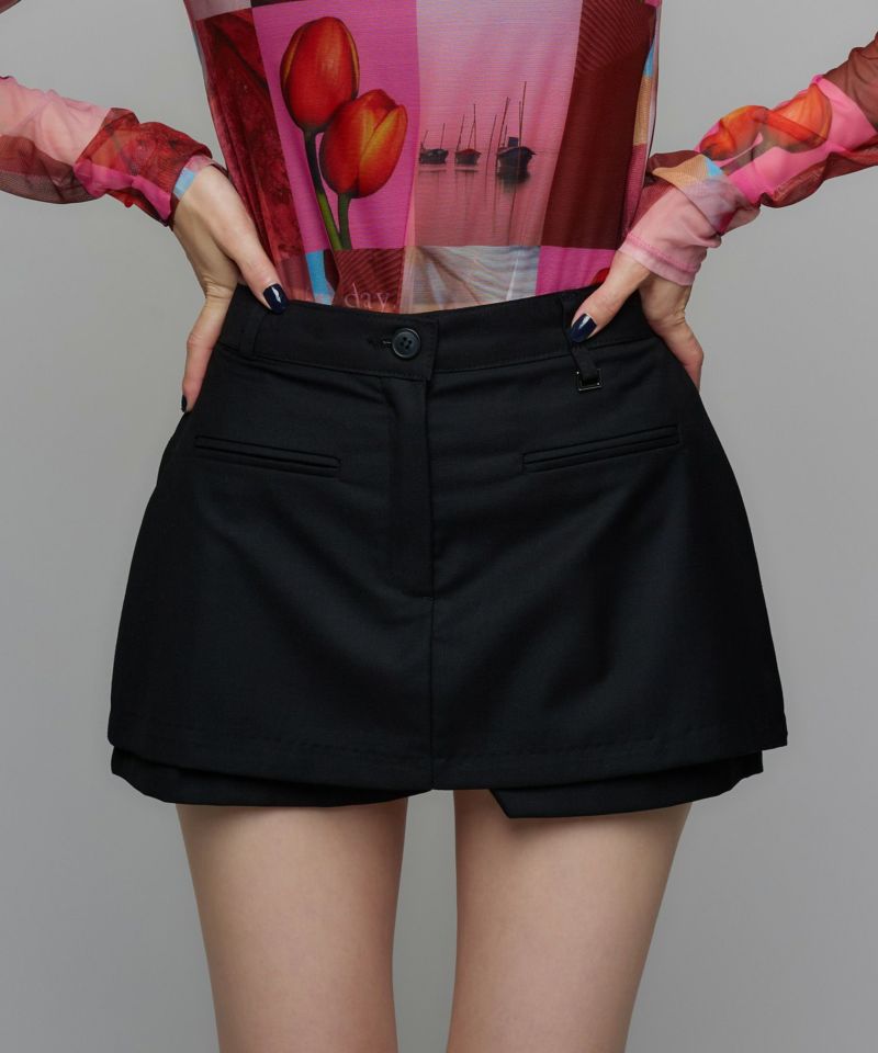 裾からのぞくパンツがアクセントになった、一枚でスタイリングが決まるスカート。フロントのフェイクポケットを高めに配置することで、ハイウエストデザインと相まって足長効果を演出し、スタイルアップを叶えます。ベルトループ付きで、好みに合わせてウエストを調整できるのも魅力です。