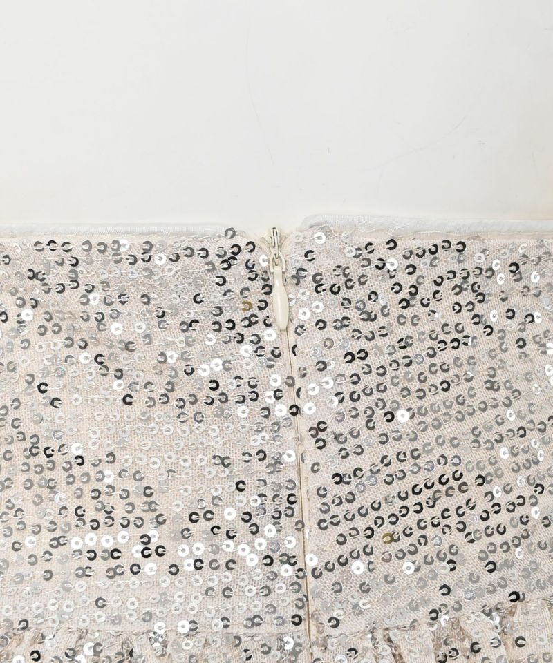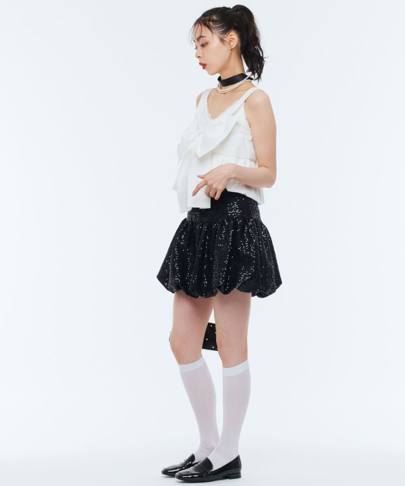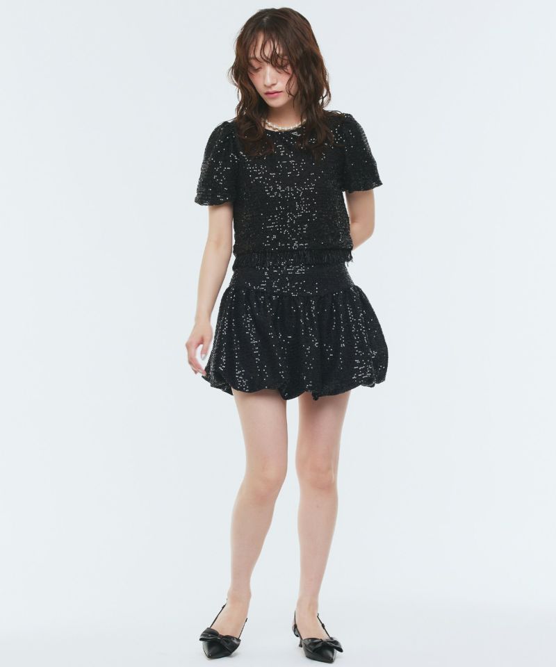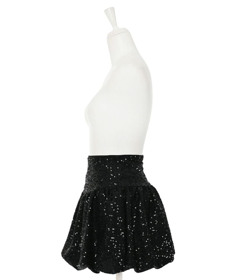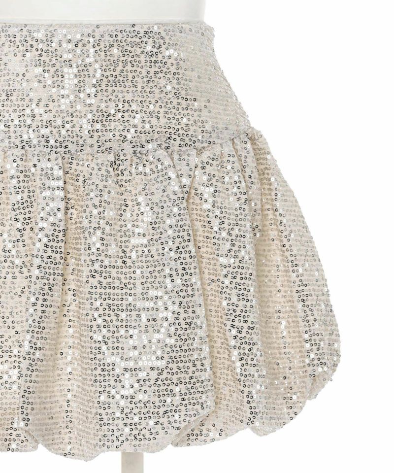 トレンドのバルーンスカートに、スタイリングのアクセントになるスパンコールを全面に使用した存在感抜群のアイテム。ジップ付きで着脱しやすく、ペチパンツ付きなので安心して着用できる。【model】165㎝ / H160 B80 H85