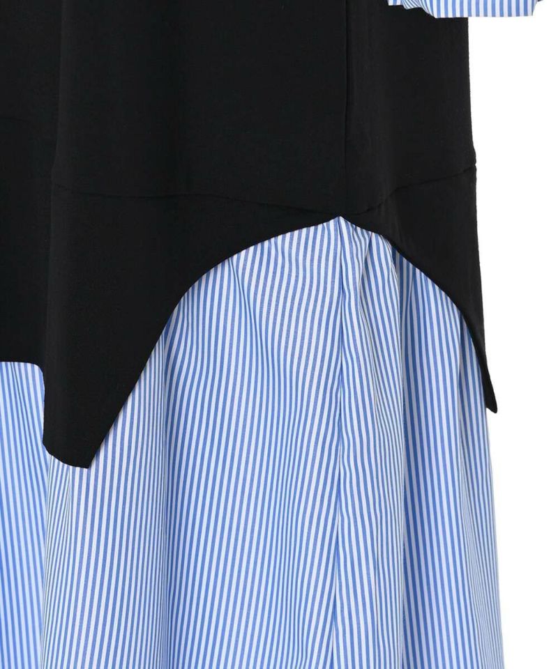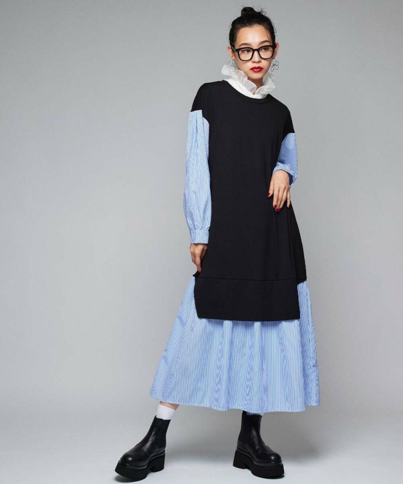 異素材をドッキングしたシャツワンピース。薄手で着心地と風通しの良い素材感なので、ロングシーズン着用できるのが嬉しいポイント。1枚でカジュアルにもフェミニンにも仕上がる、こなれ感のあるドッキングデザイン。【model】H163 B78 H84