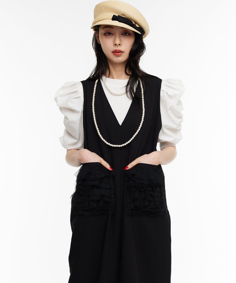 フロントに施されたチュールフリルポケットが目を惹くデザインオールインワン。一見ミニマルなシルエットに、立体感のあるチュールディテールが華やかさをプラスし、シンプルながらも存在感のある一着に仕上げています。甘さとモード感を絶妙にミックスした、大人のためのデザインアイテム。
