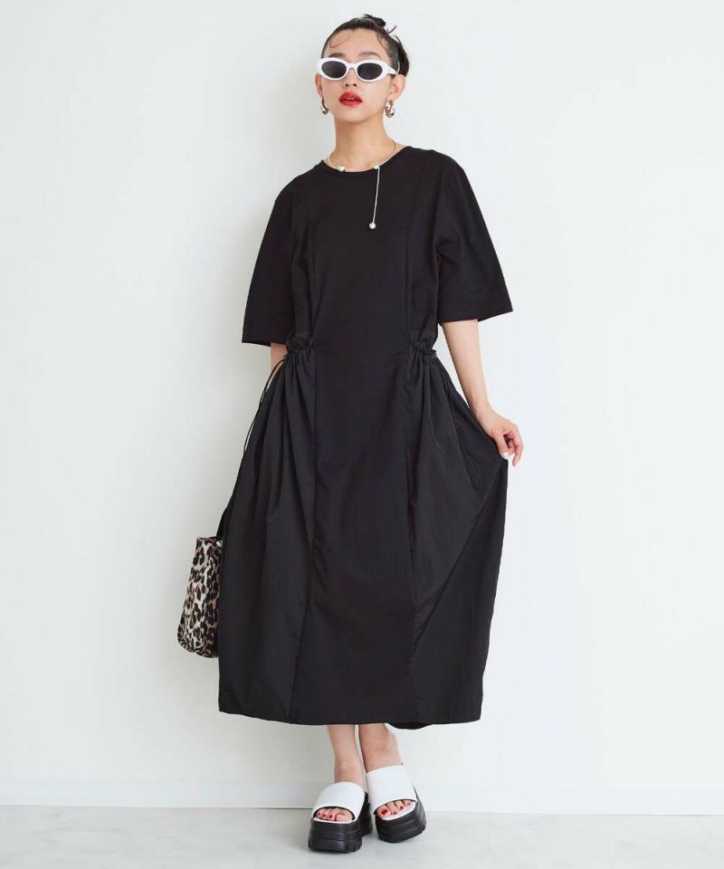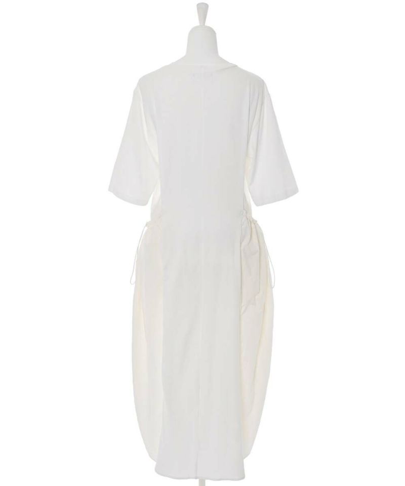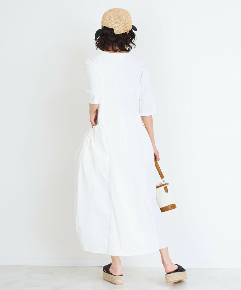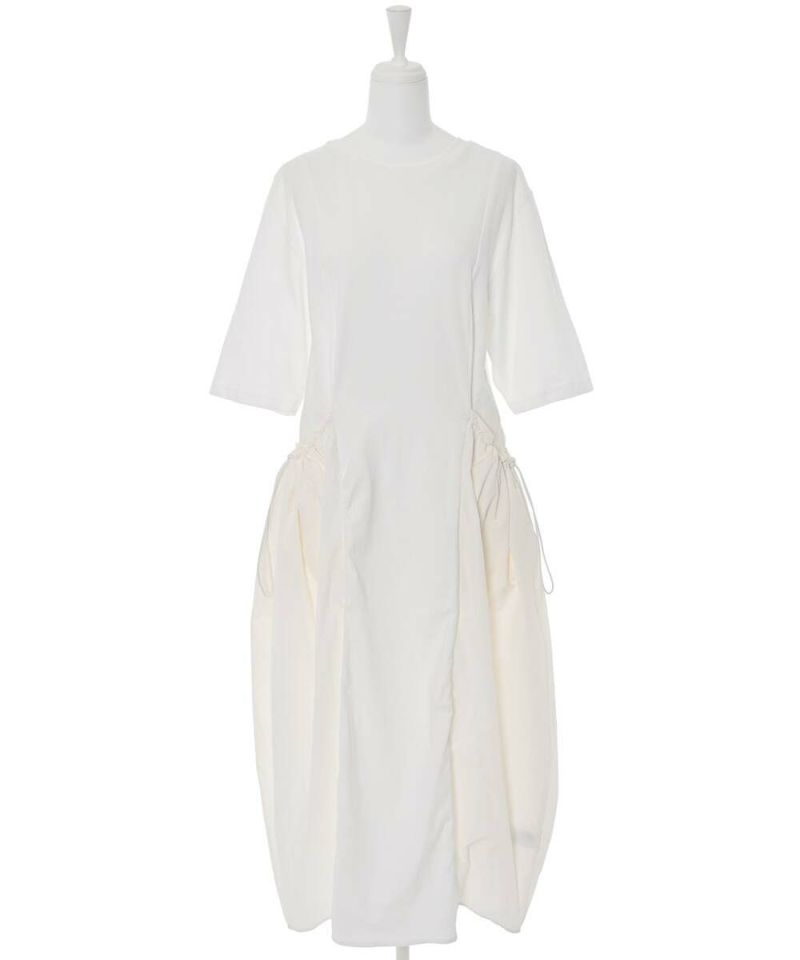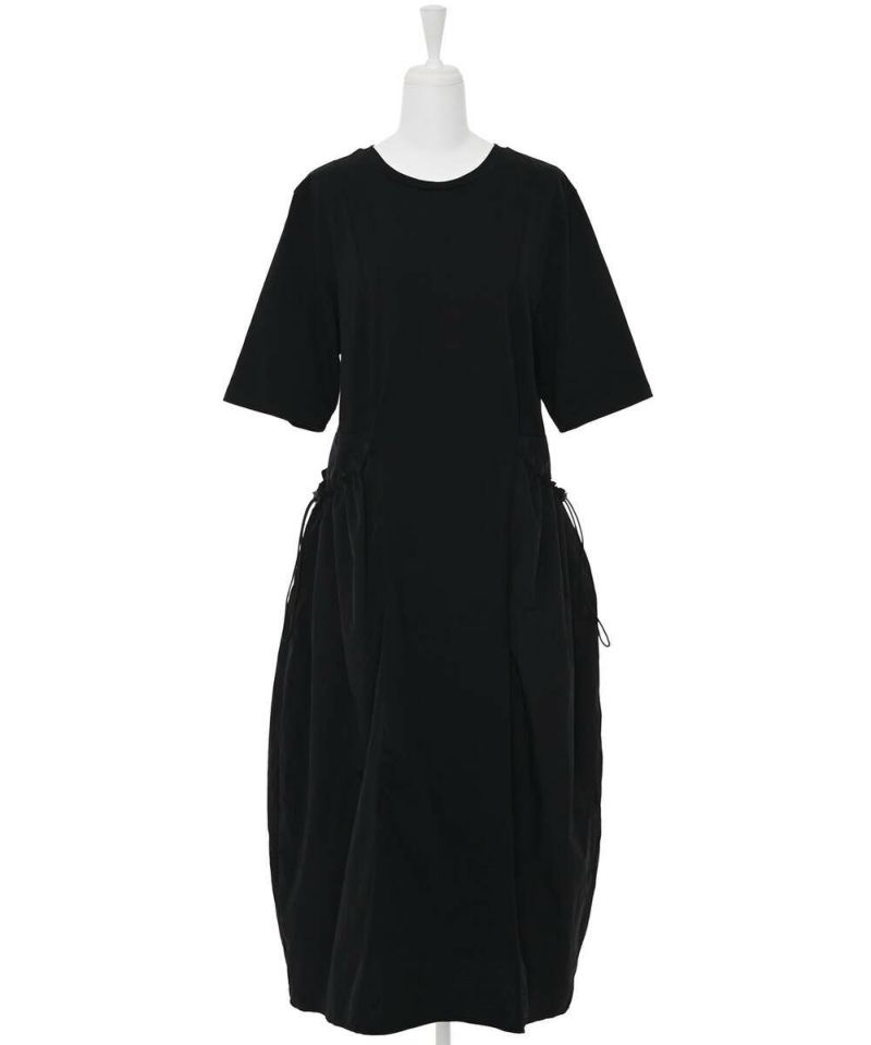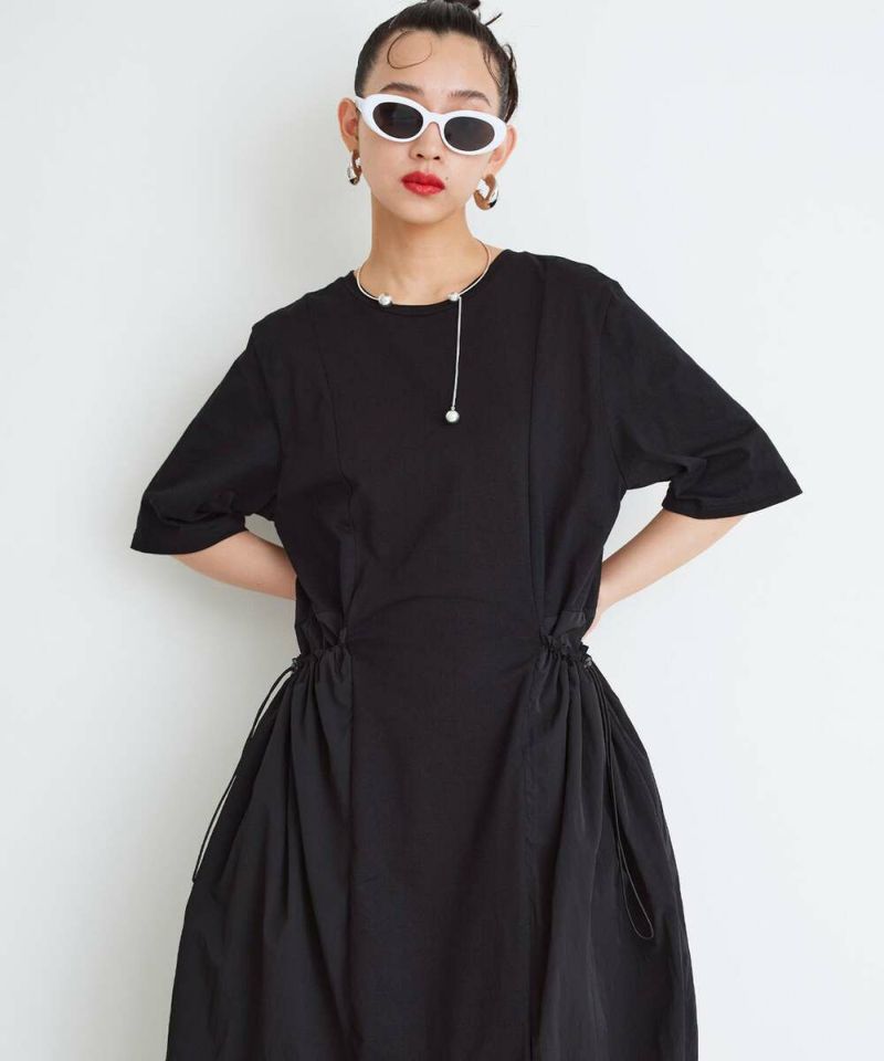 ボディラインを拾わないゆるっとしたシンプルなコクーンシルエットに、ドロストコードを採用し、スポーティー要素をプラスしたワンピース。1枚で着映えする異素材MIXがポイント。ドロストコードでお好みのシルエットに調節可能。【model】H163 B78 H84