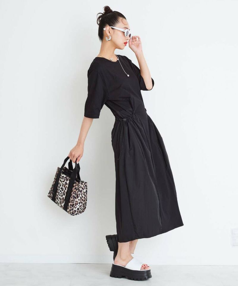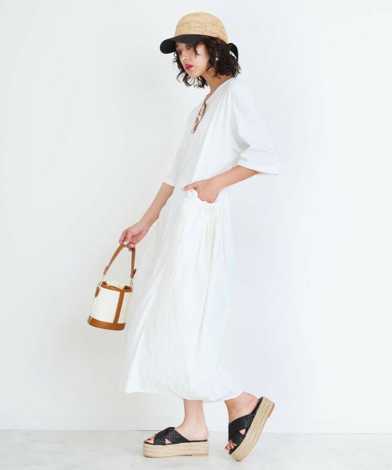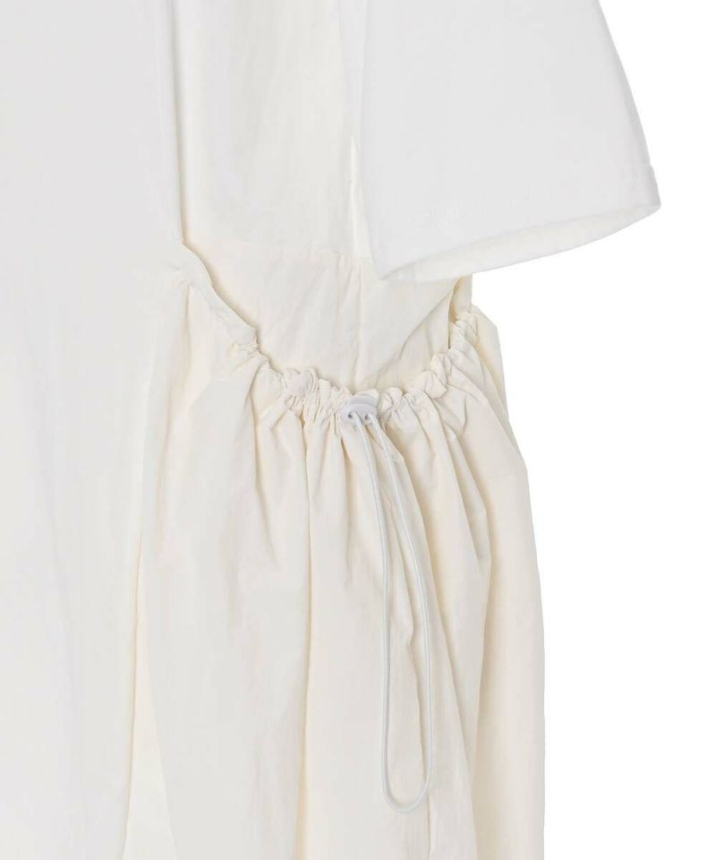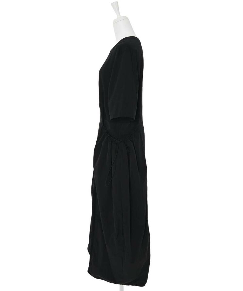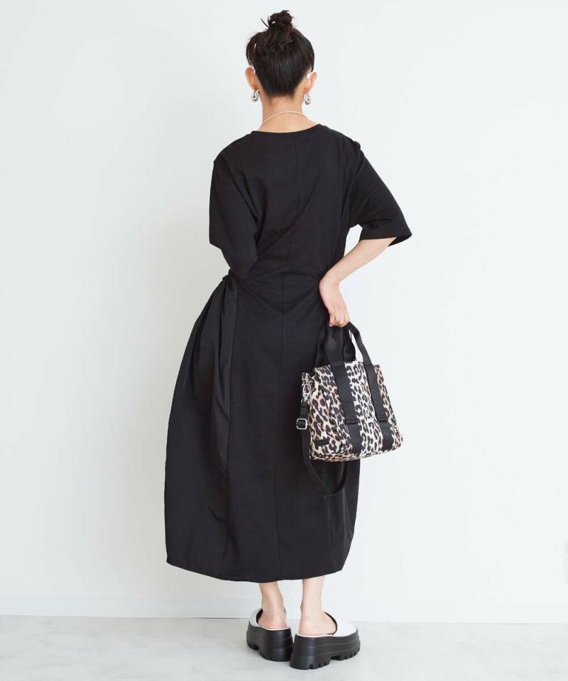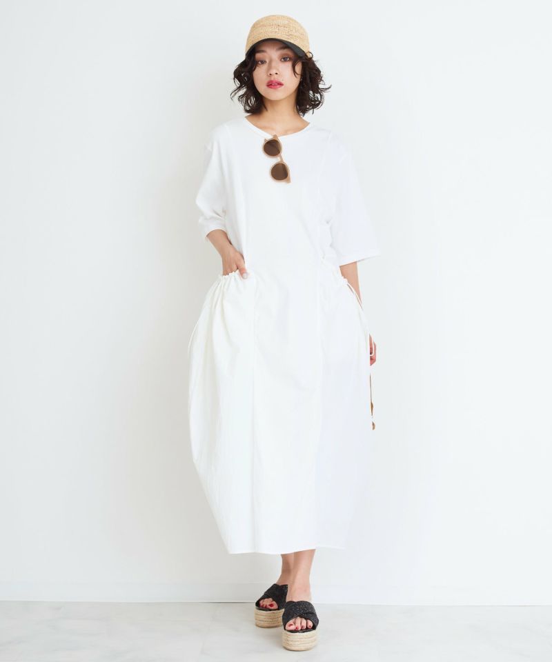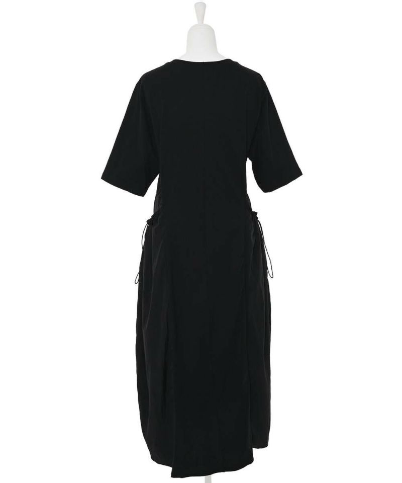 ボディラインを拾わないゆるっとしたシンプルなコクーンシルエットに、ドロストコードを採用し、スポーティー要素をプラスしたワンピース。1枚で着映えする異素材MIXがポイント。ドロストコードでお好みのシルエットに調節可能。【model】H163 B78 H84