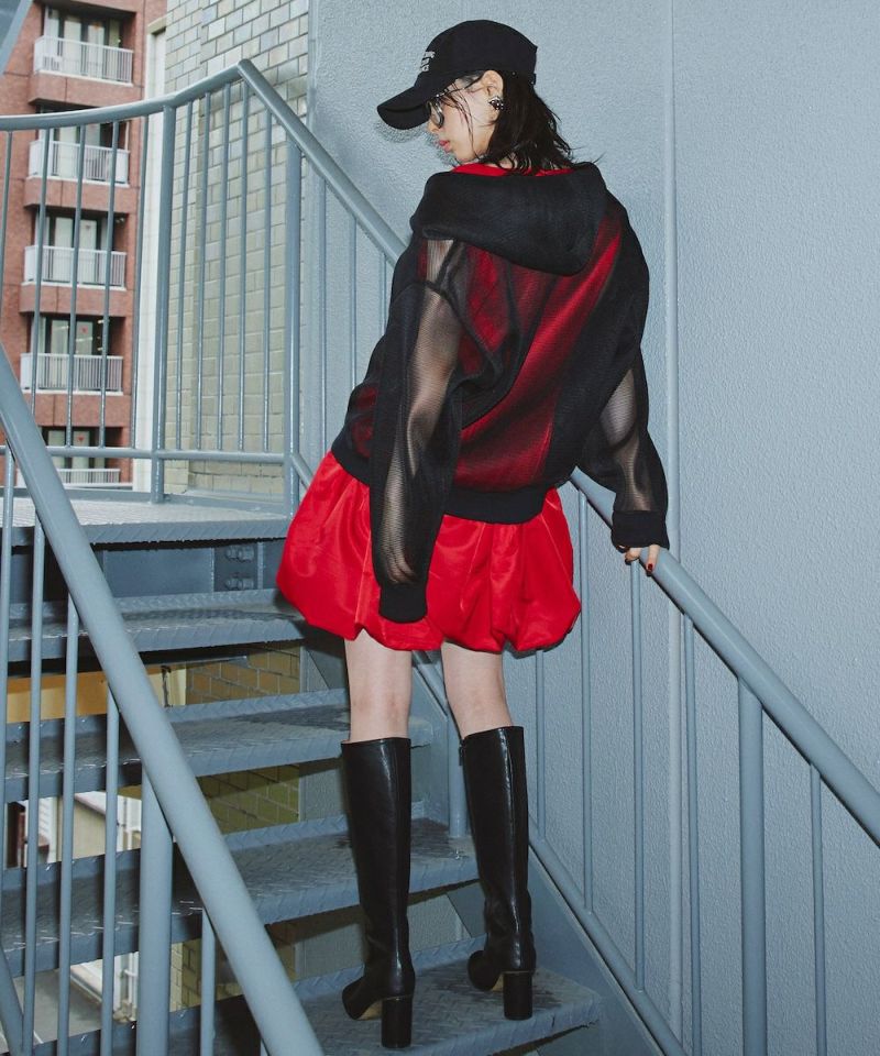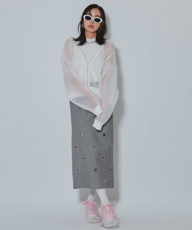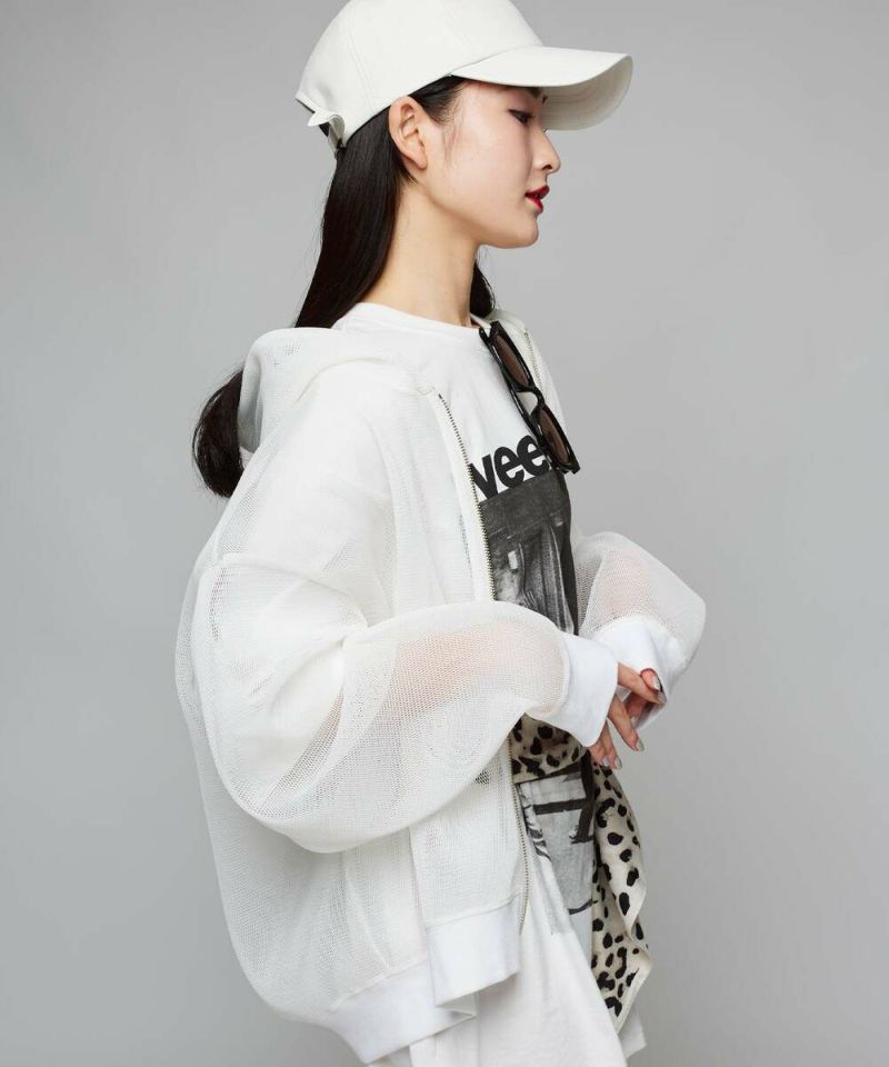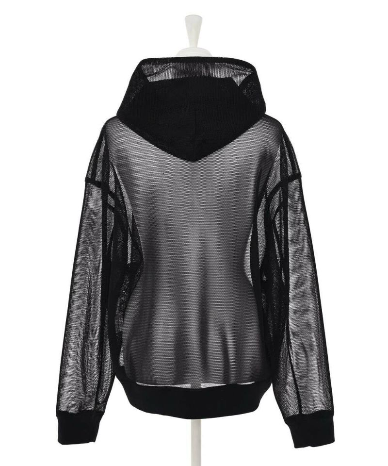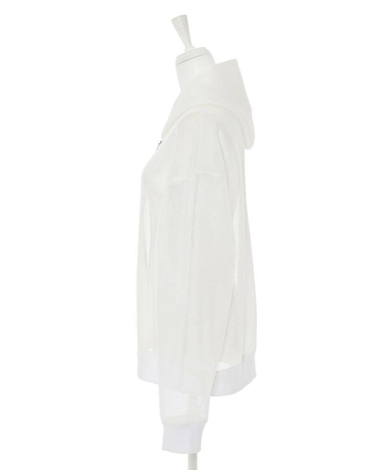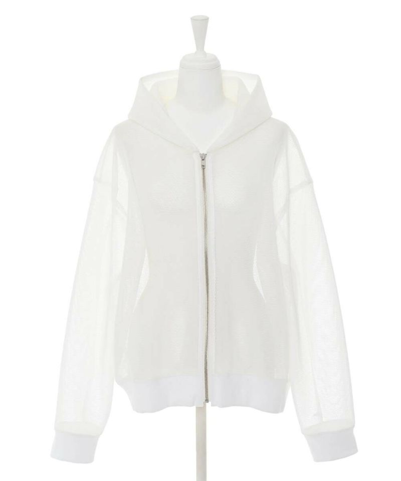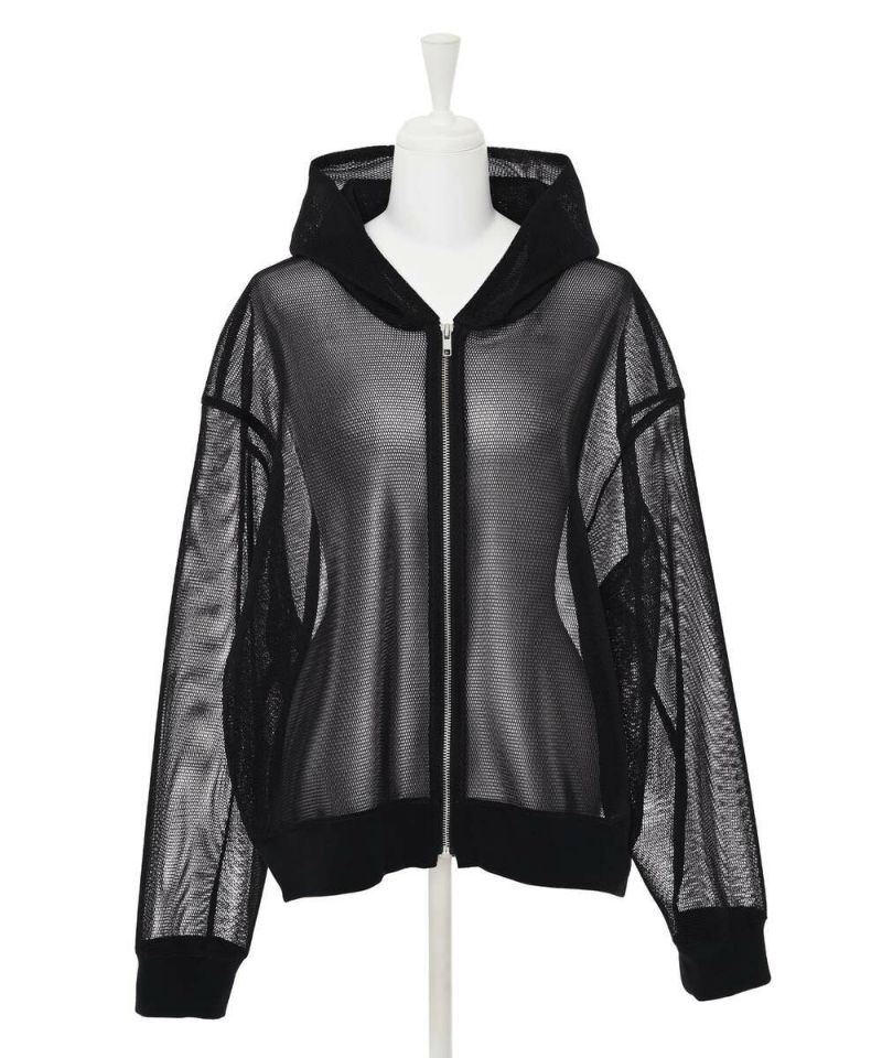 ハリ感のあるボンディング素材を使用したメッシュデザインのジップパーカー。ゆとりのあるサイズ感がレイヤードスタイルにピッタリで、キャミソール・タンクトップ、肌寒い時期にはロングTシャツ・ニット等、インナー次第でロングシーズン活躍できるアイテム。袖口と裾にリブを採用することで高級感を。【model】H156H165 B78 H83