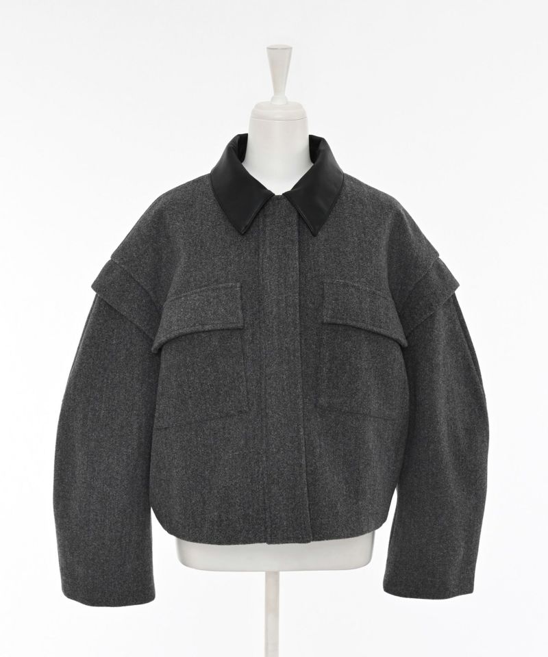2WAY仕様のフェイクレザーカラーが目を惹くショートジャケット。袖口のファスナーでボリュームやシルエットのニュアンスを変えられる、デザイン性の高い一着です。