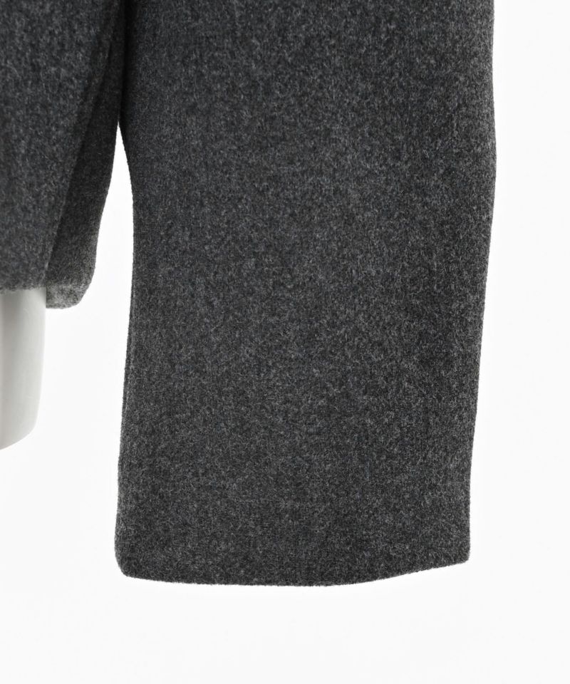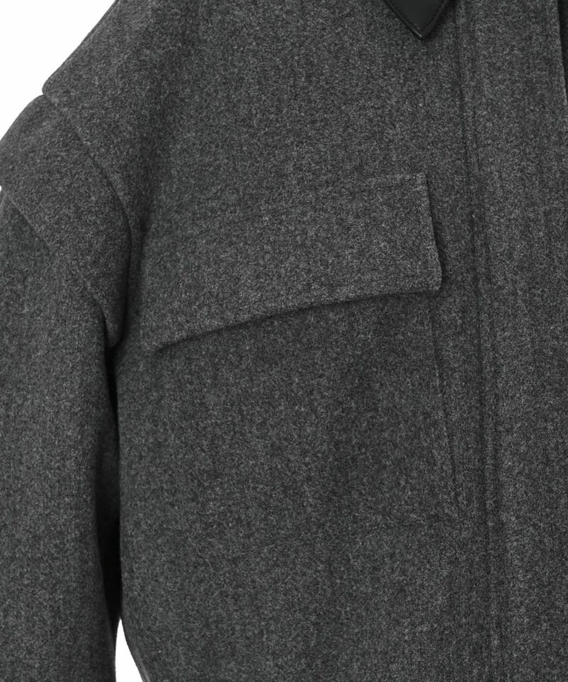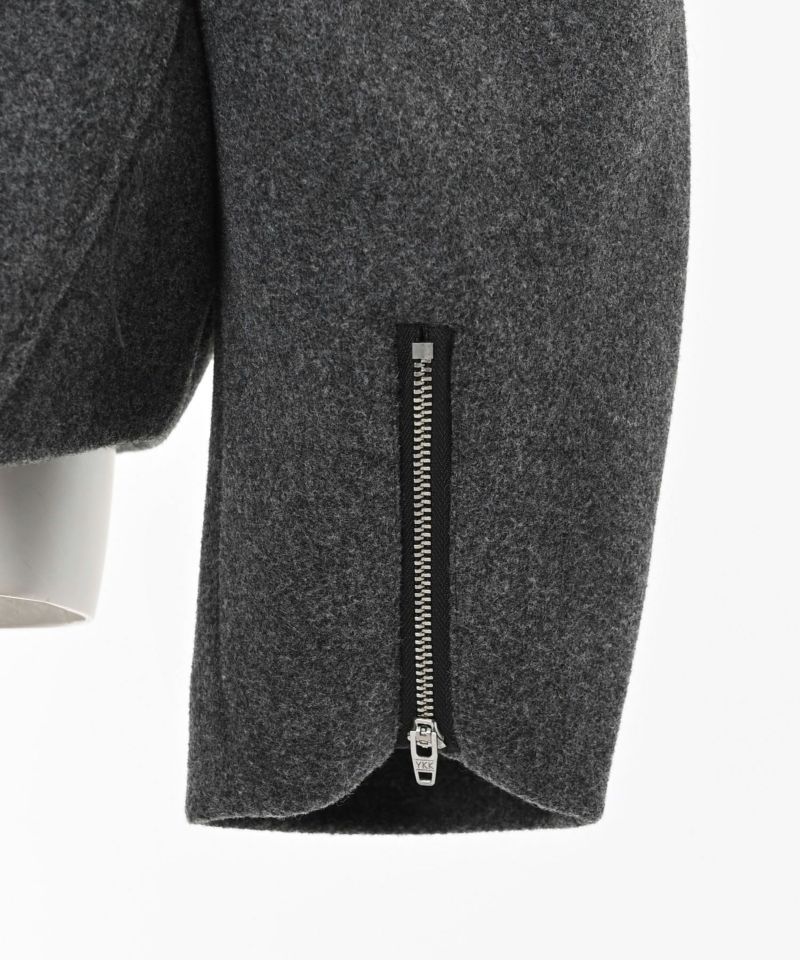 コンパクトな丈感と丸みのあるスリーブがバランスよく、立体的なフォルムを演出。フロントのフラップポケットがアクセントになり、シンプルながらも存在感のあるデザインに。また、ボタンで取り外し可能な襟は、スタイルに合わせて抜け感のあるノーカラージャケットにも変化する2WAY仕様です。フロントは、ジップとスナップボタンを使用した比翼仕立てですっきりとした上品な印象に。袖口のファスナーを開閉することでシルエットに動きをプラスできるのもポイント。