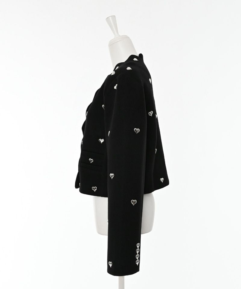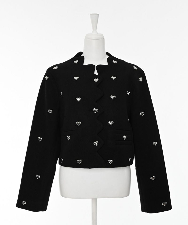 ジャケット全体にハートモチーフの金具を散りばめた、存在感のある一着。遊び心のあるディテールが洗練されたムードを引き立て、羽織るだけでコーディネートの主役になります。