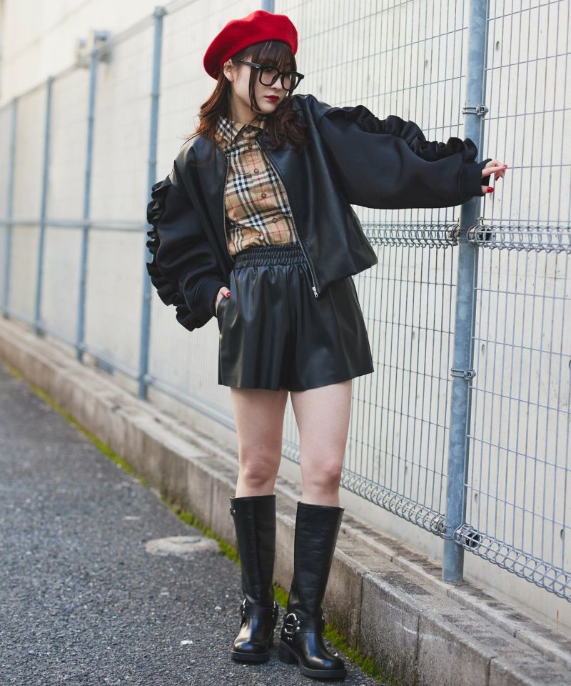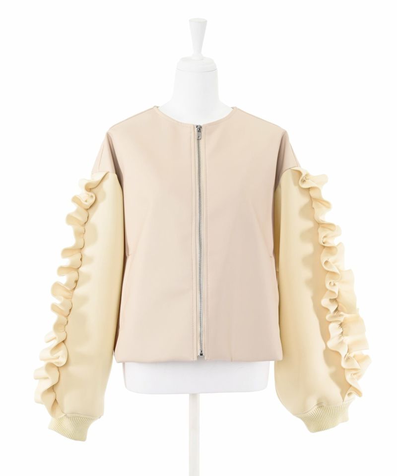 フリルデザインとレザーのコントラストがポイントのショートブルゾン。袖はボンディング素材でフリルのボリュームに対し、ライトな着心地。ノーカラーデザインでワードローブに取り入れやすい一枚。モデル身長:156cm