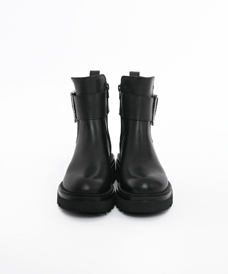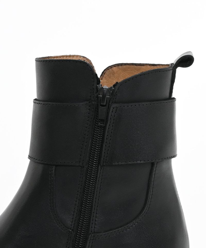 バックルにあしらわれたストーンが上品な輝きを放つショートブーツ。シンプルな中に華やかさを添えるデザインで、足元からコーデを格上げします。サイドファスナー付きで着脱がスムーズなのも嬉しいポイント。デイリーから特別なシーンまで、幅広く活躍する一足です。