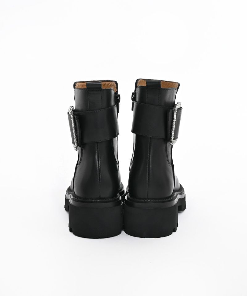 バックルにきらめくストーンをあしらい、上品さと華やかさをプラス。程よい高さのショート丈でバランスが取りやすく、シンプルながらも存在感のあるデザインが魅力です。