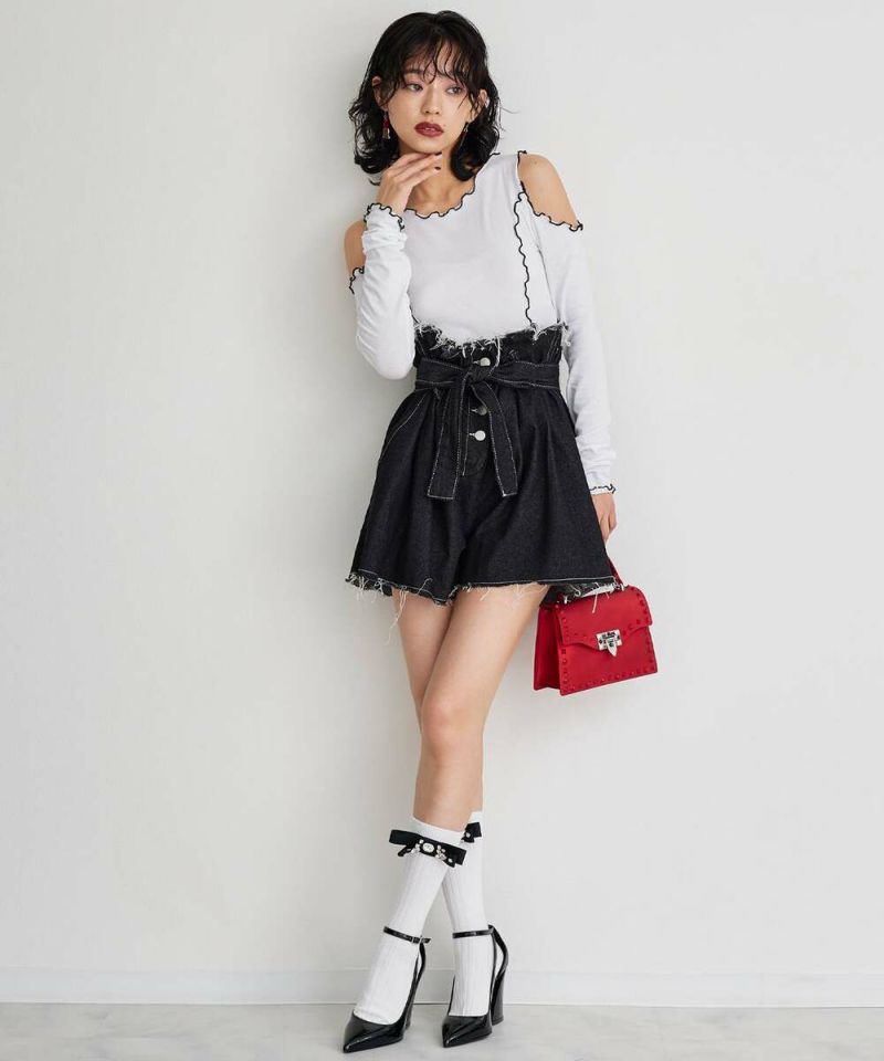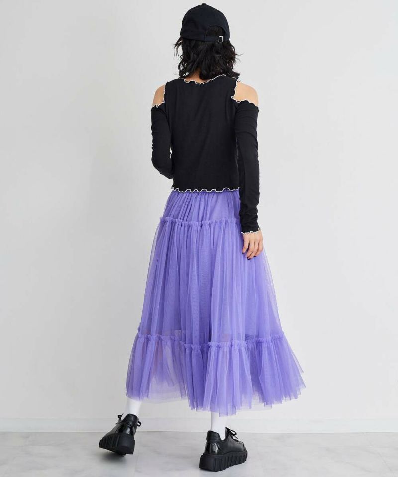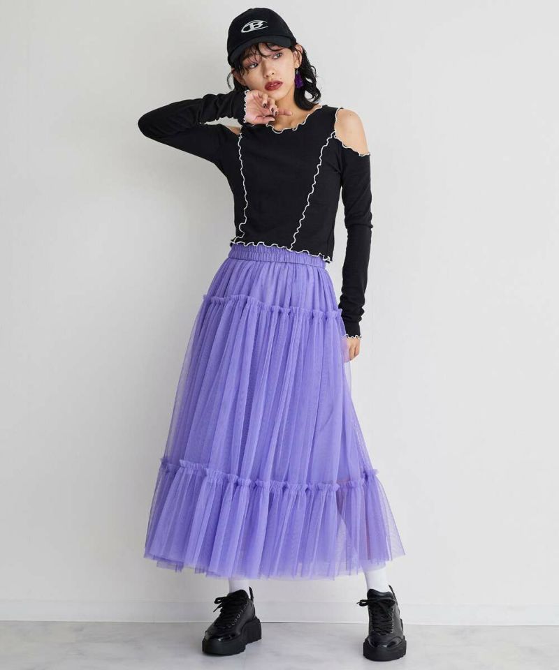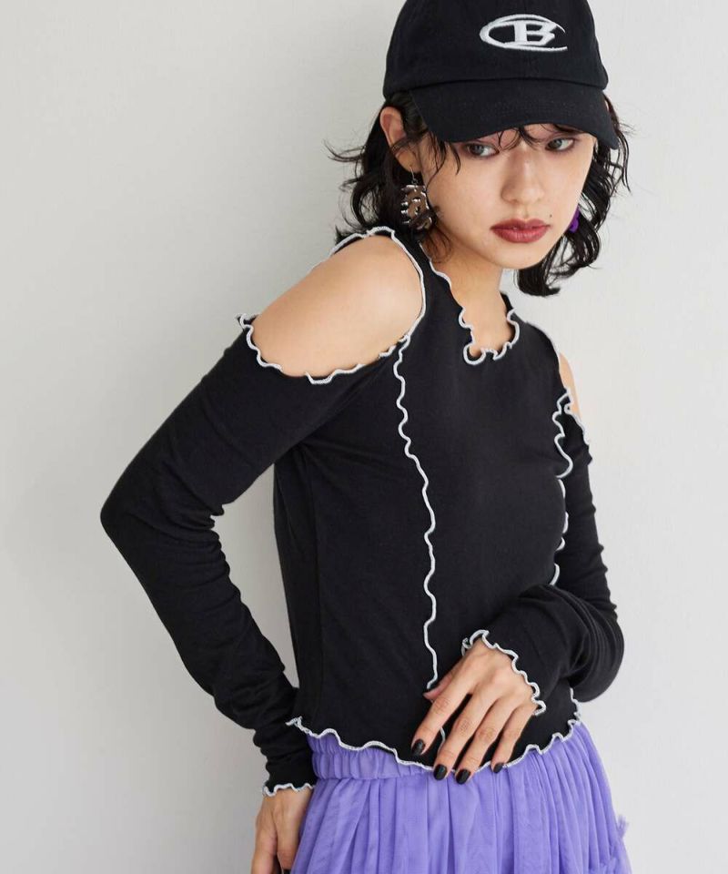 アクセントになるメロウの配色が旬のトップス。程よい肩の肌みせでヘルシーさをプラス。モダール混の肌当たりの良い素材感で着心地も◎【model】H163 B78 H84