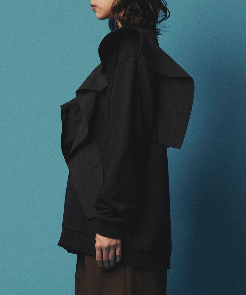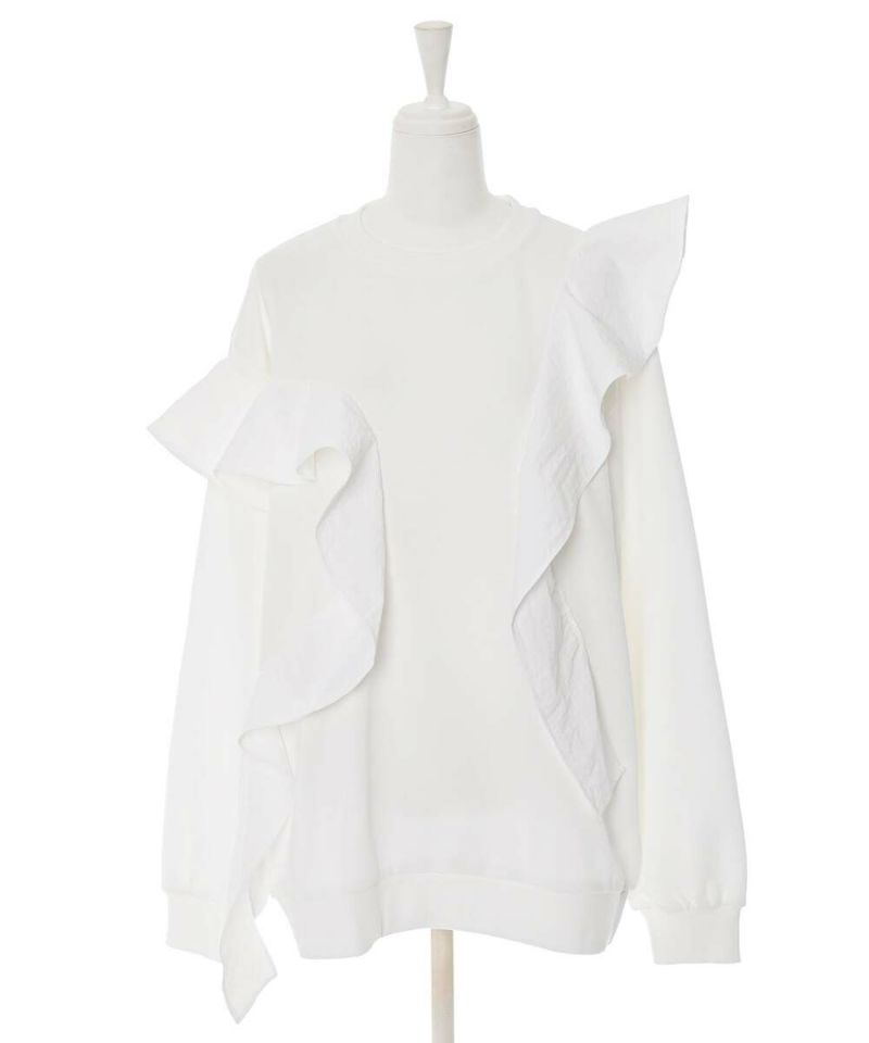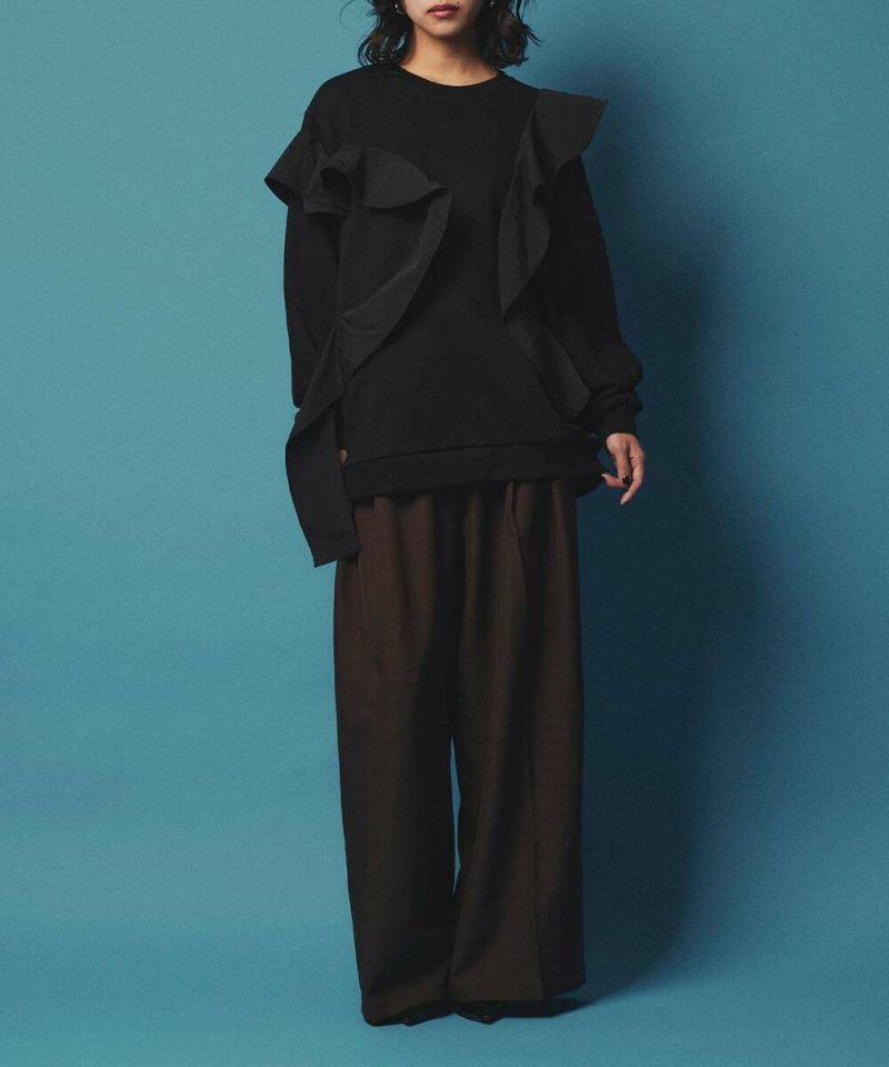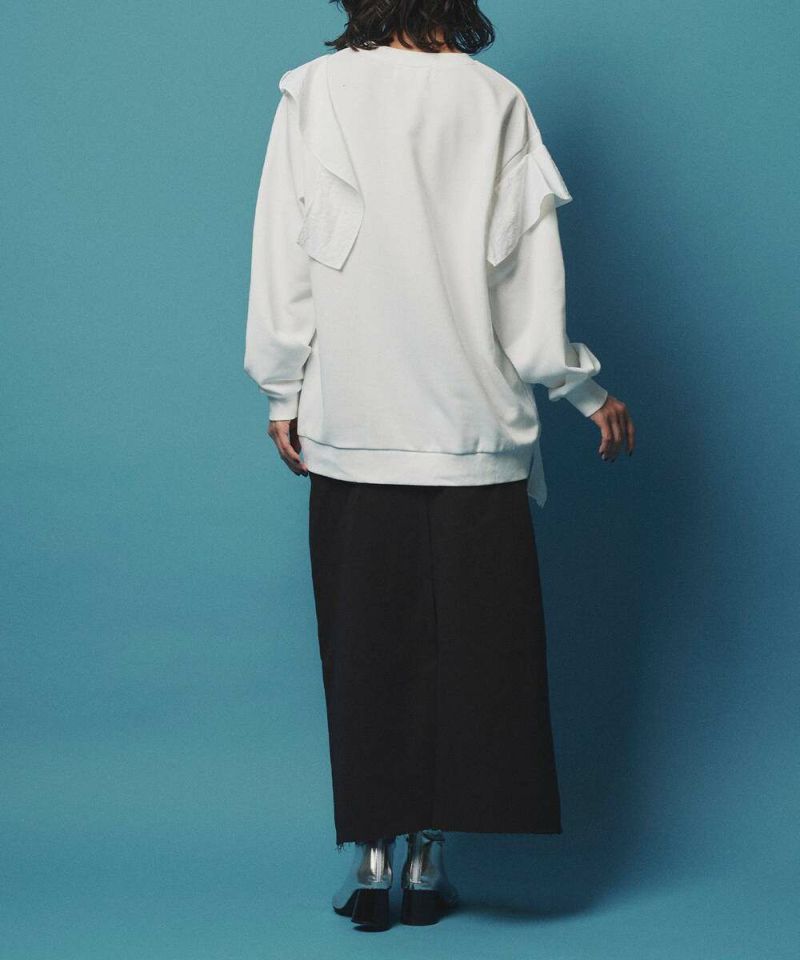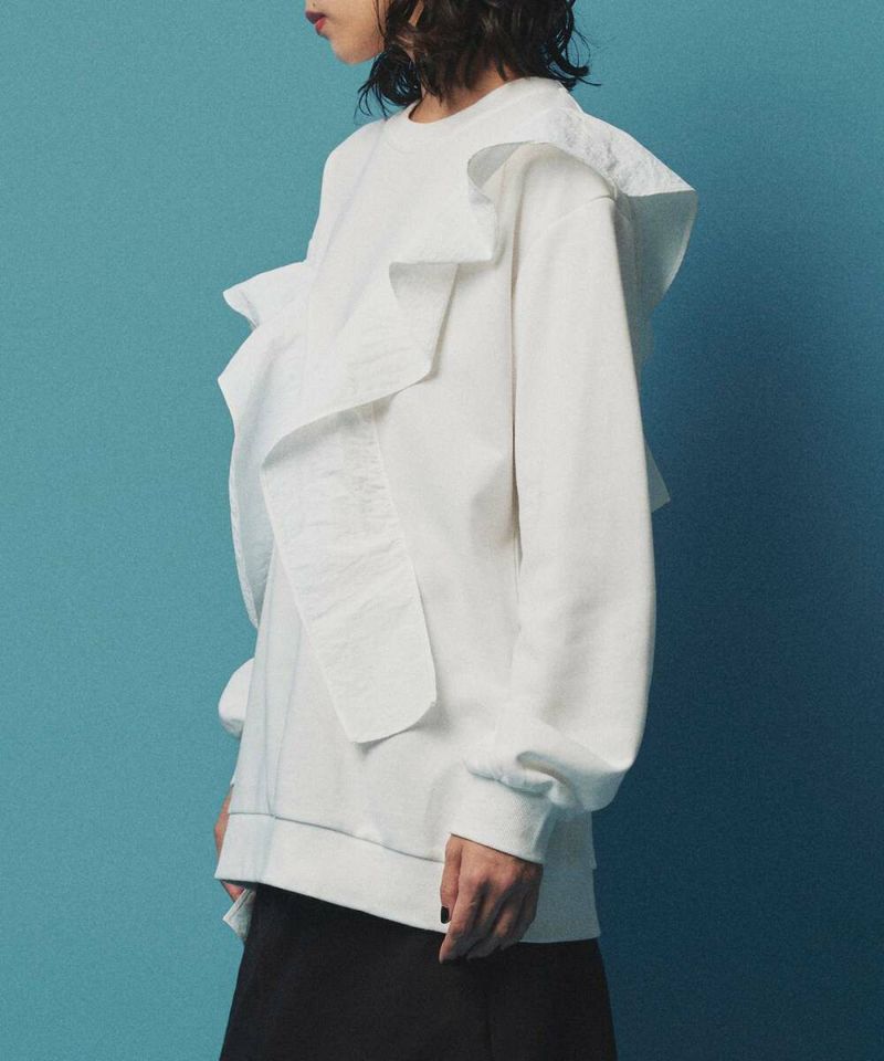 ■ POINTトレンドライクなドッキングデザインが特徴のフリルトップス。左右アンバランスで配置したラッフルフリルはハリ感のある異素材を使用。薄手のスウェット裏毛素材でロングシーズンで着用いただけます。ほどよいオーバーサイズで着心地が良く、体型カバーも期待できるアイテムです。■ STYLINGタイトスカートやスキニーなど細身のボトムでモードなレディスタイルや、デニムやミニ丈ボトムでフェミニンなカジュアルスタイル等、どんなボトムにも合う着回しの効くアイテム。1枚で着映えするデザイン性のあるトップスはシンプルな着こなしでも華やかにみせてくれます。【model】H163 B78 H84