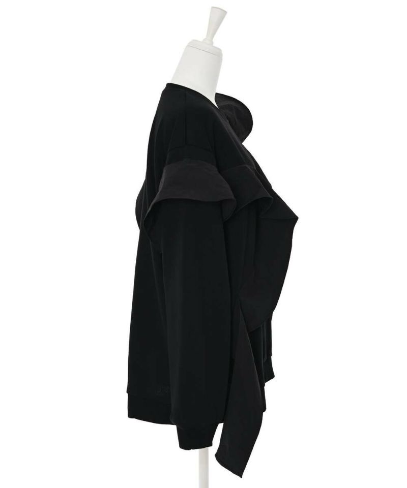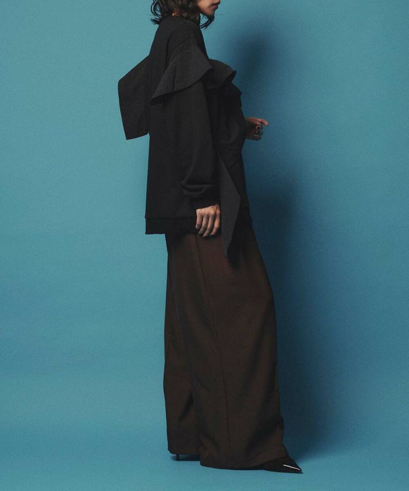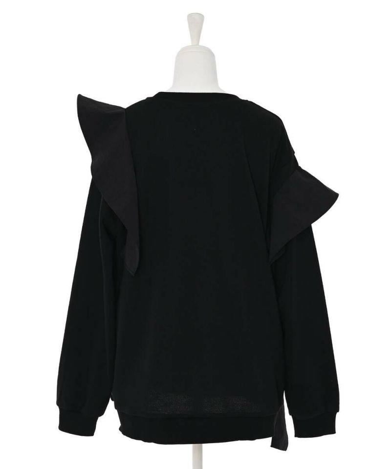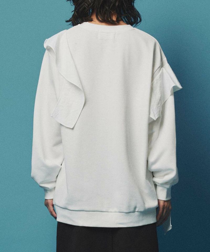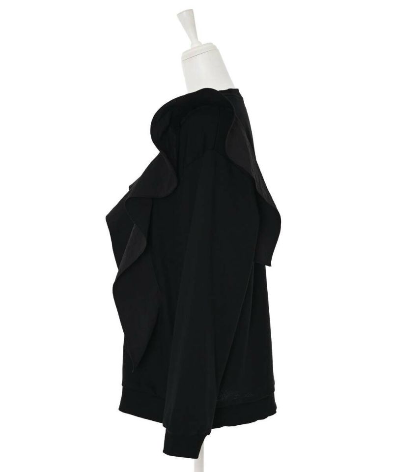 ■ POINTトレンドライクなドッキングデザインが特徴のフリルトップス。左右アンバランスで配置したラッフルフリルはハリ感のある異素材を使用。薄手のスウェット裏毛素材でロングシーズンで着用いただけます。ほどよいオーバーサイズで着心地が良く、体型カバーも期待できるアイテムです。■ STYLINGタイトスカートやスキニーなど細身のボトムでモードなレディスタイルや、デニムやミニ丈ボトムでフェミニンなカジュアルスタイル等、どんなボトムにも合う着回しの効くアイテム。1枚で着映えするデザイン性のあるトップスはシンプルな着こなしでも華やかにみせてくれます。【model】H163 B78 H84