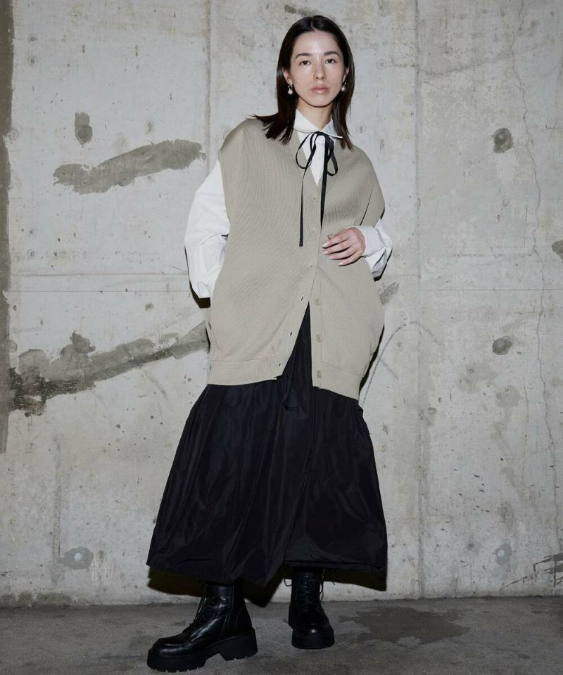 ヒップが隠れるコクーンシルエットに拘った、シンプルながらも洗練されたデザインのニットベスト。ややドライタッチで、触り心地の良いしっかりとしたニット素材。肩幅や二の腕を華奢見えさせてくれるドロップショルダーを採用し、アームを大きめに設定することで、季節に合わせて様々なレイヤードが楽しめる優秀なアイテムです。サイドポケットが立体感をプラスし、深めのVネックで抜け感を演出しました。※素材の性質上、サイズ感に多少誤差がございます。ご了承のほどよろしくお願いいたします。【model】H160 B80 H85