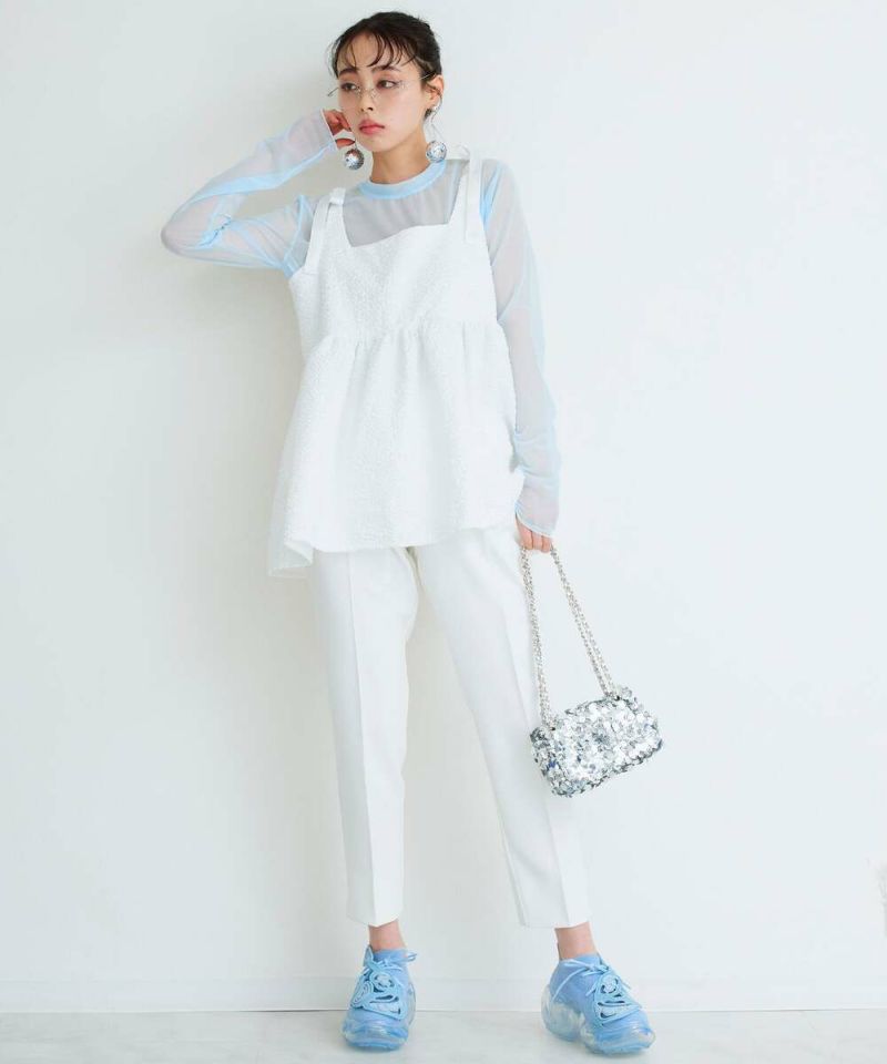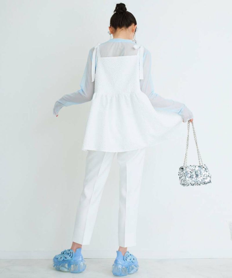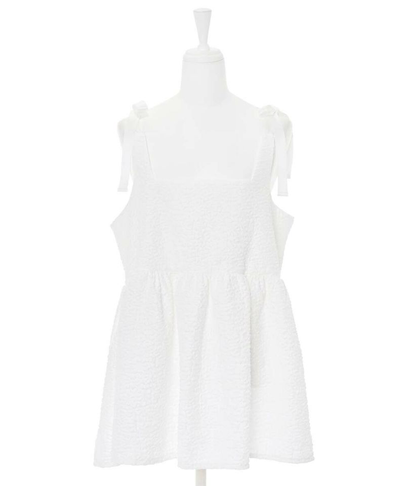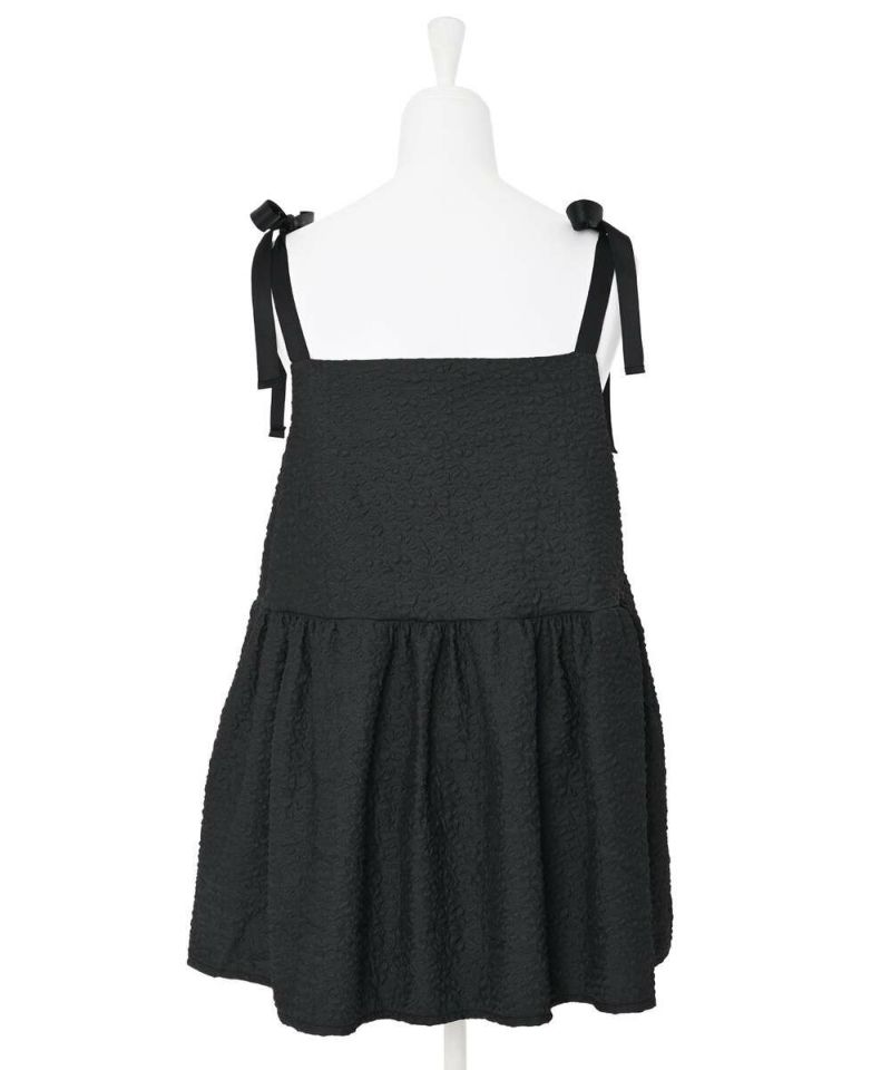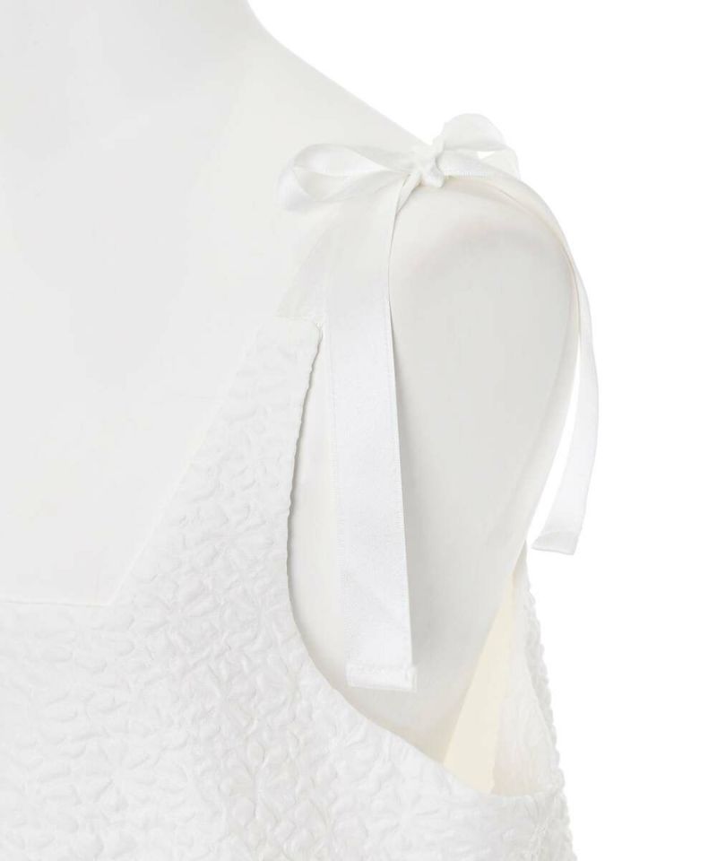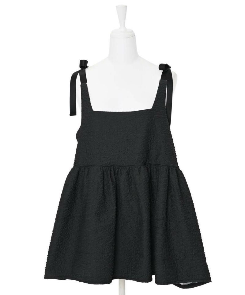 ジャガード素材を使用した、1枚でこなれコーデを叶える大人フェミニンなペプラムビスチェ。ショルダー部分のリボンが可愛らしさをプラスし、長さ調節可能。ウエストから裾にかけて広がるペプラムデザインがメリハリのある綺麗なシルエットに。【model】H165 B78 H83/156cm