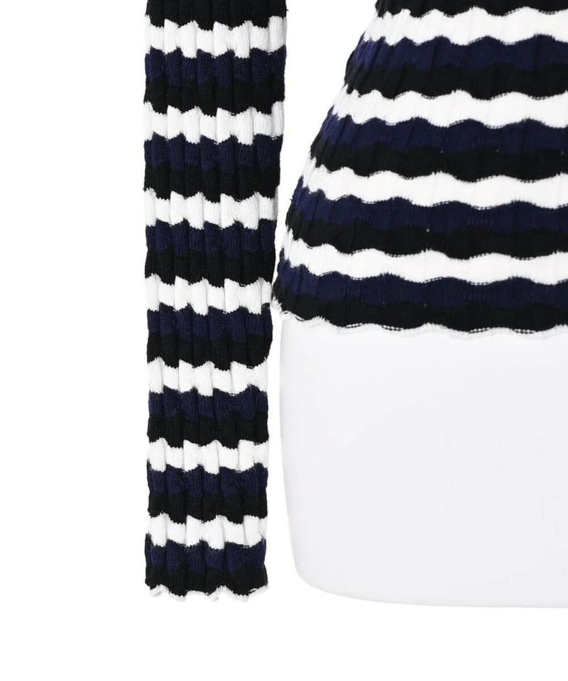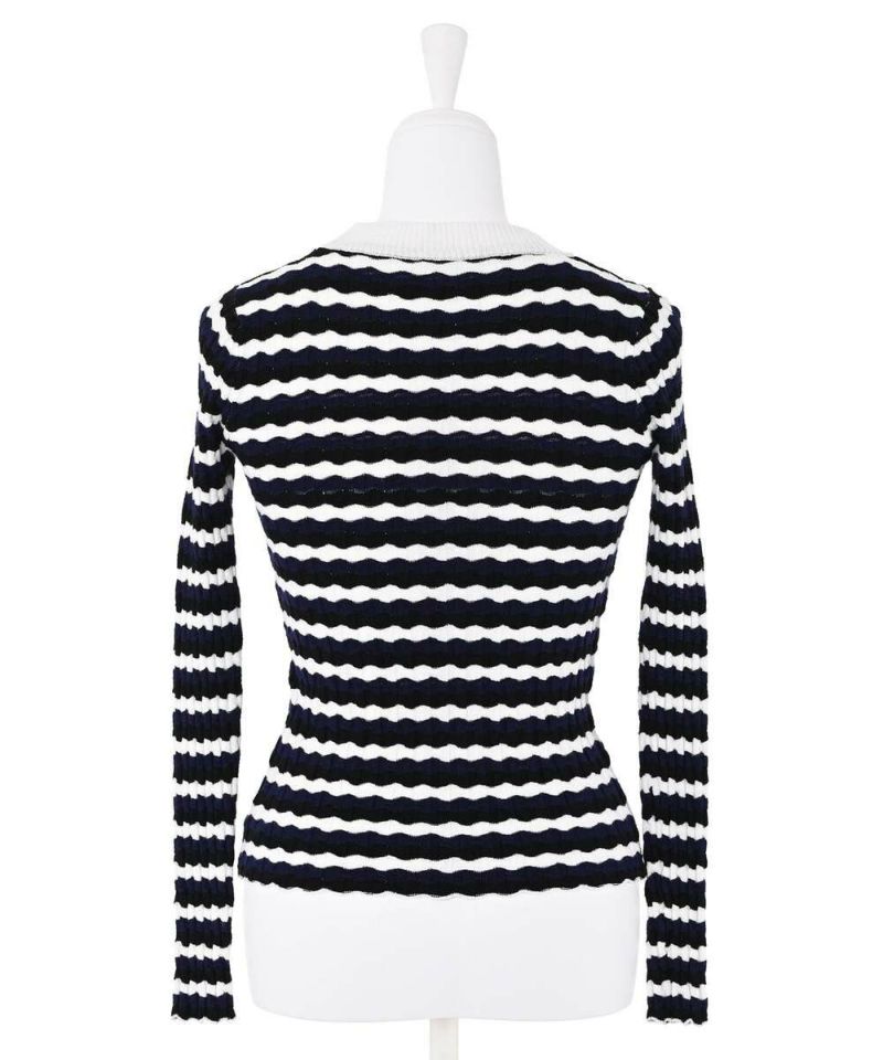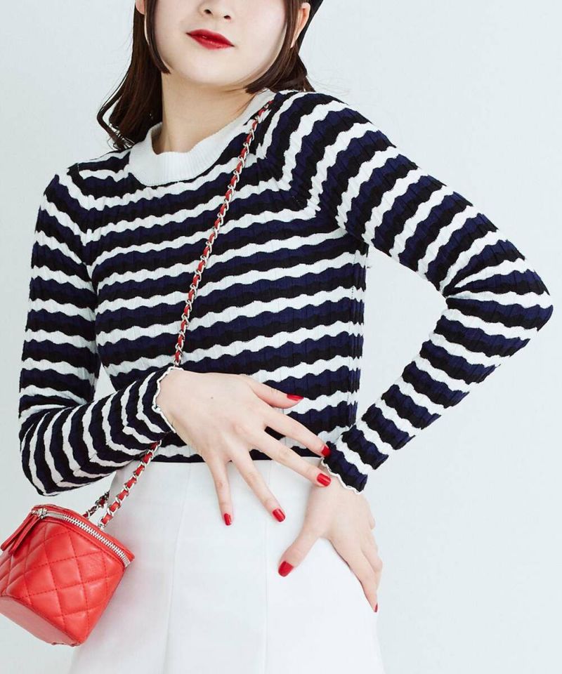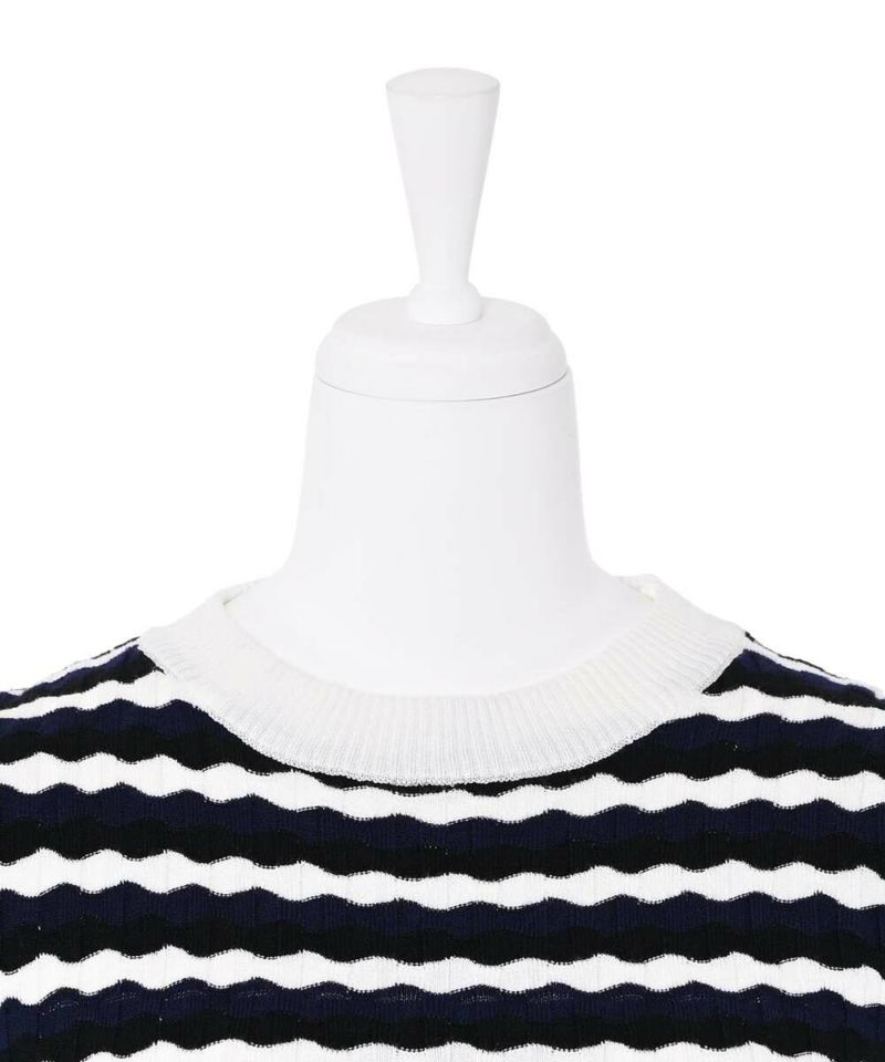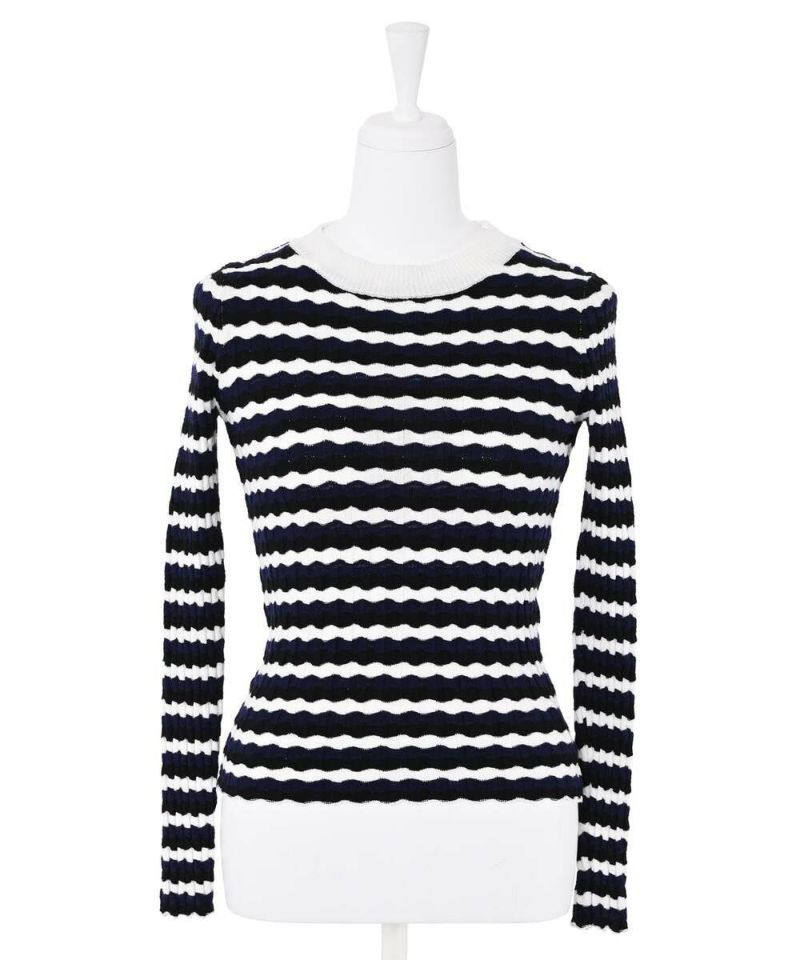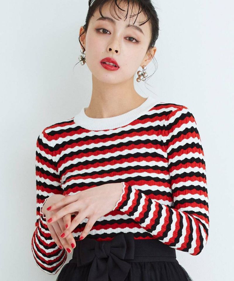 ウェーブ状のボーダー柄が特徴的なニットトップス。薄手の素材感で、ボディラインにフィットするディティールなので、アウターも着膨れすることなく羽織れる。他にはあまり見ないデザインでコーディネートの主役に。【model】H165 B78 H83/158cm