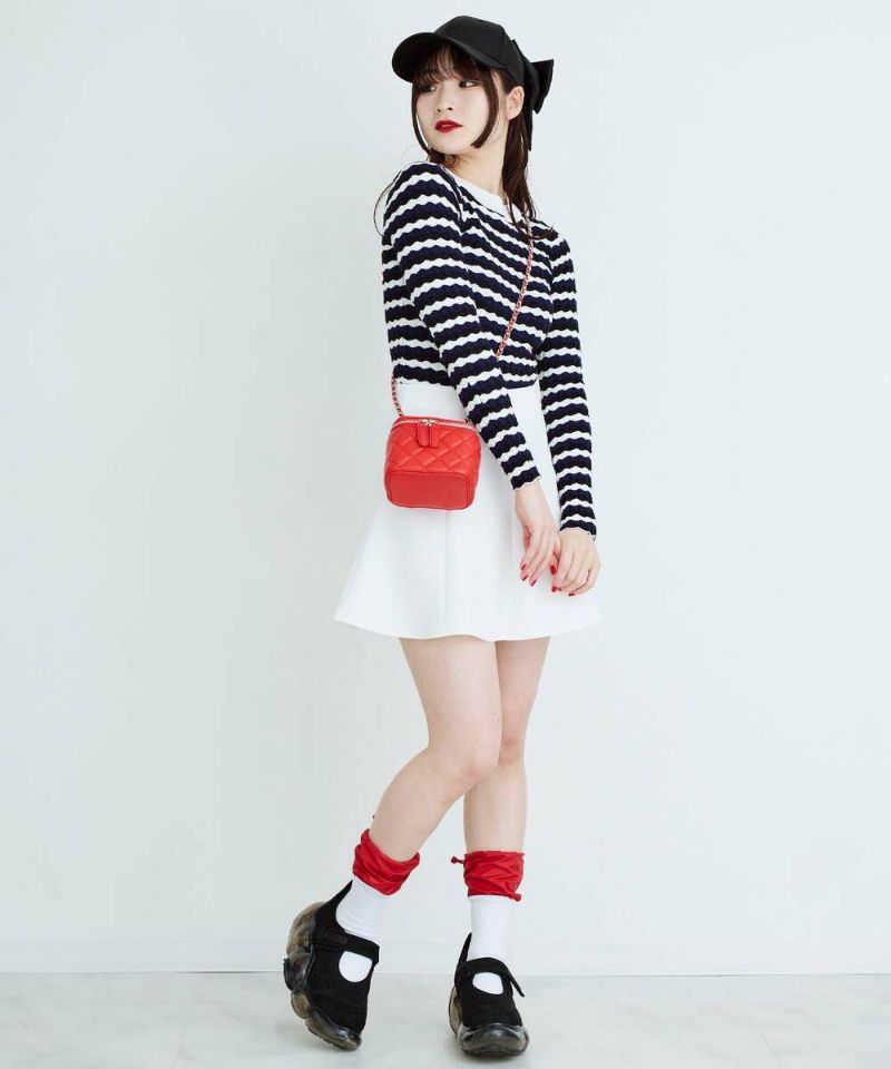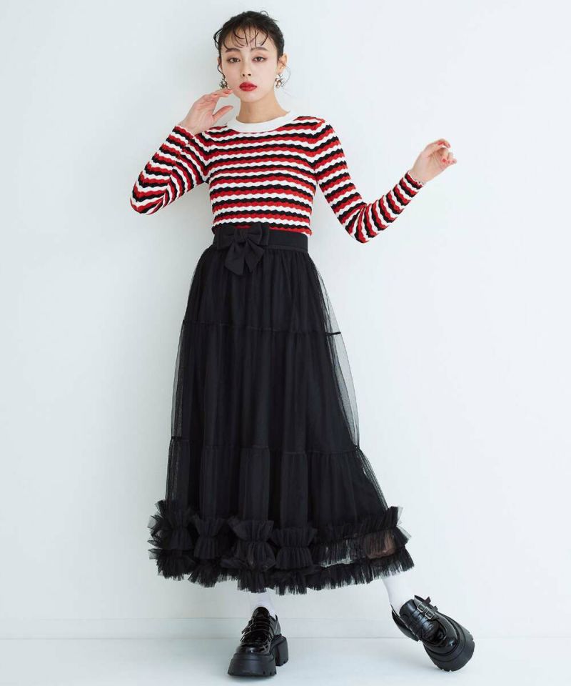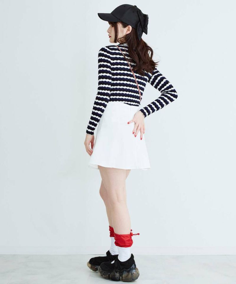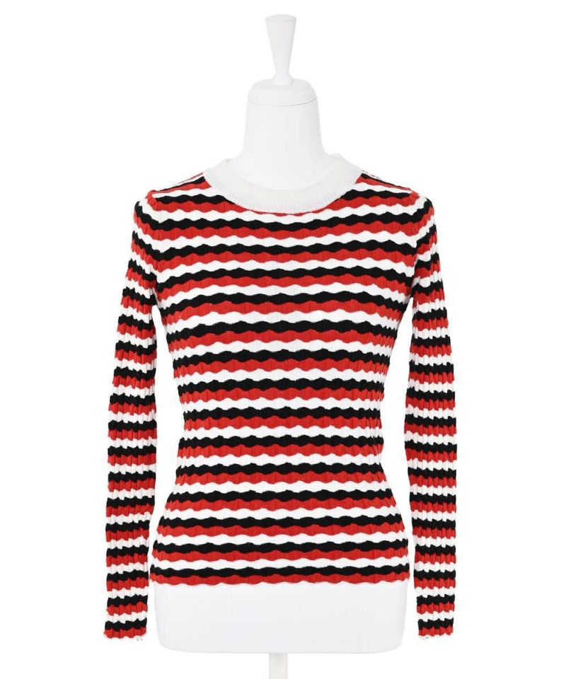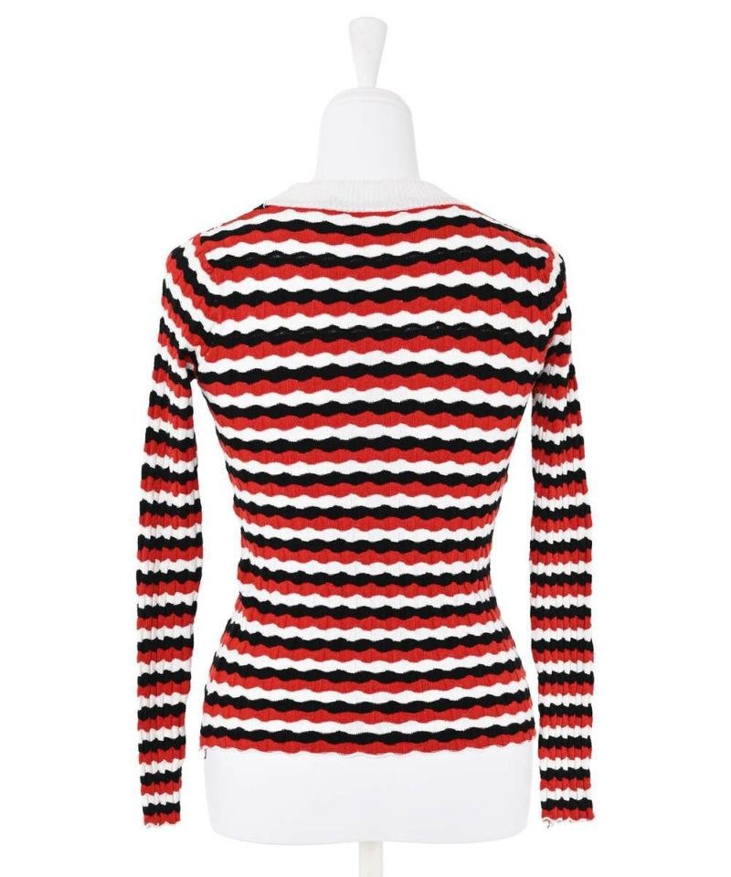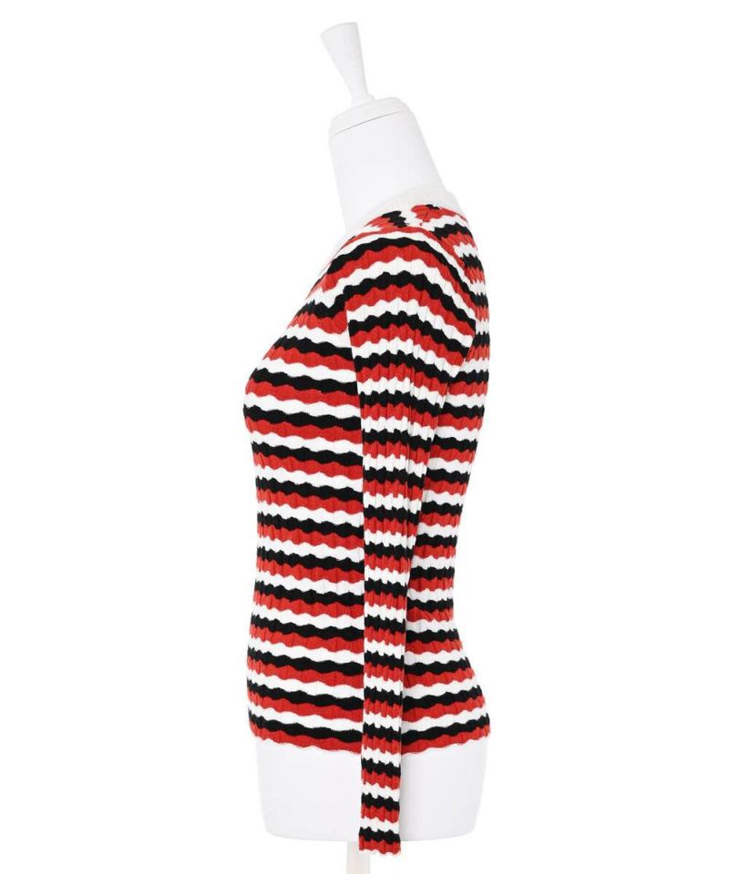 ウェーブ状のボーダー柄が特徴的なニットトップス。薄手の素材感で、ボディラインにフィットするディティールなので、アウターも着膨れすることなく羽織れる。他にはあまり見ないデザインでコーディネートの主役に。【model】H165 B78 H83/158cm
