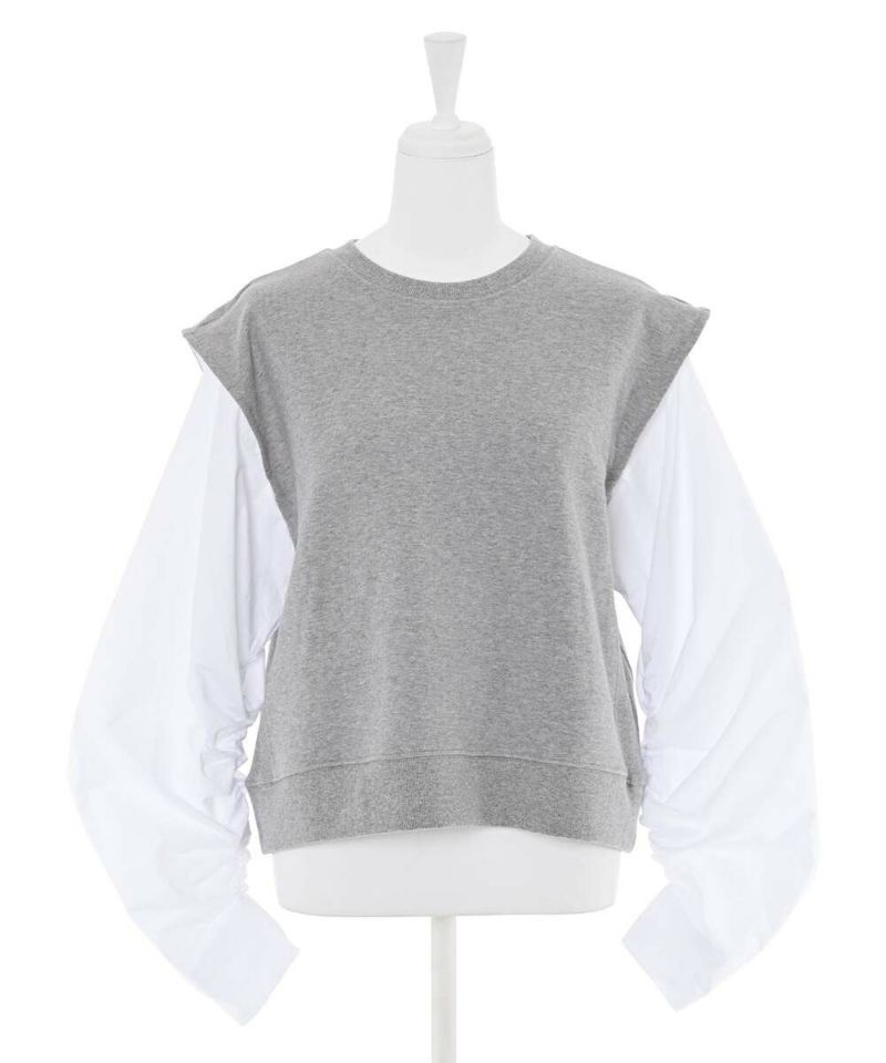 シャーリング加工をあしらったボリュームスリーブとベストがドッキングされたトップス。ベストの肩幅が広めに作られていることで、シャープな印象に。イン・アウトどちらのスタイルでもバランスよく着こなせる丈感。モデル身長:156cm