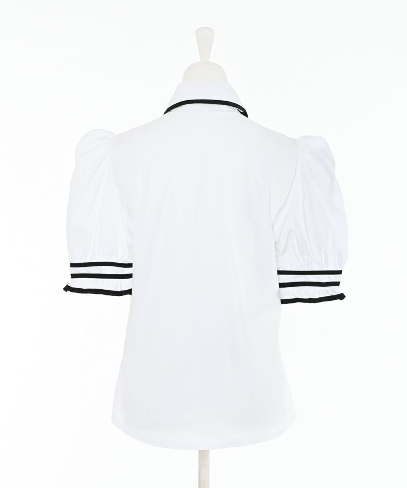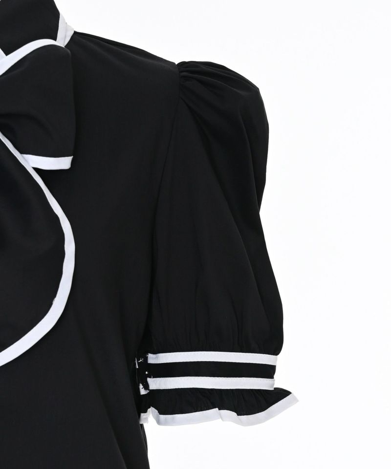 バイカラーのパイピングと取り外し可能なリボンタイが目を引く、フェミニンなブラウス。パフスリーブと袖口のさりげないフリルが可愛らしさをプラス。一枚で存在感を放ち、コーディネートの主役になるアイテムです。