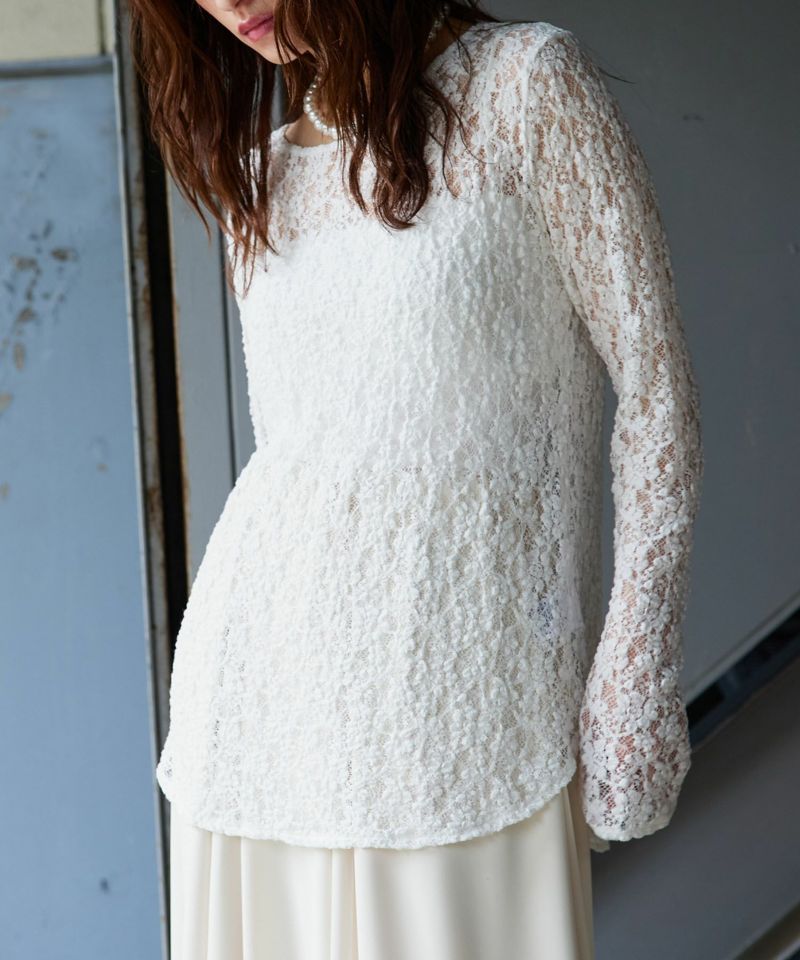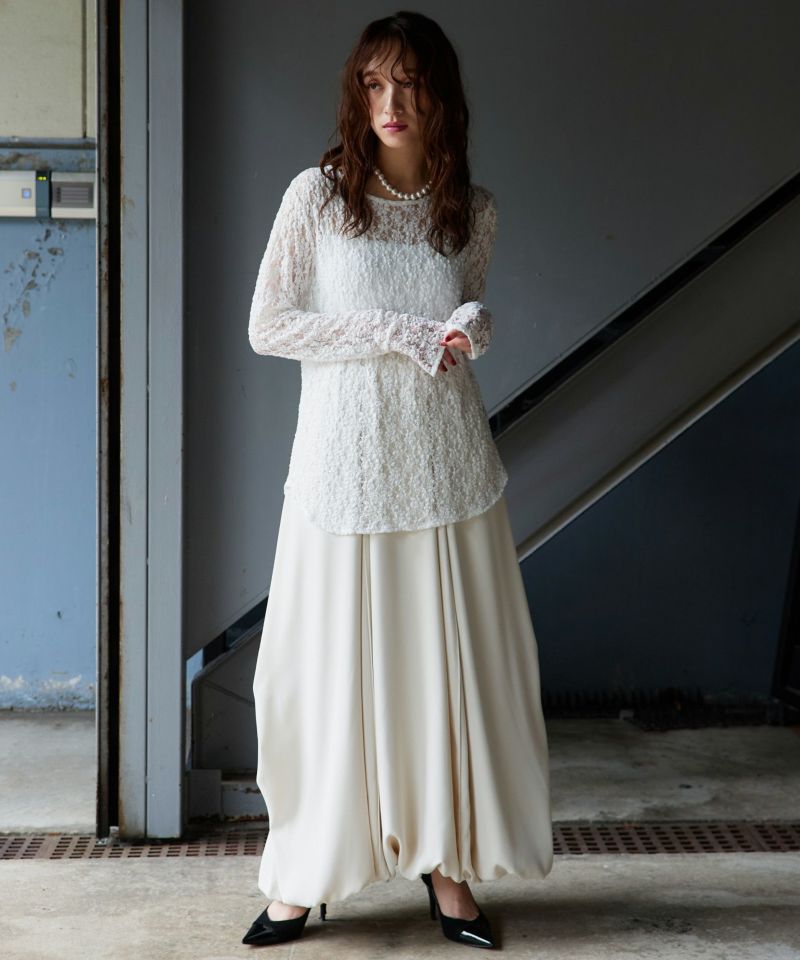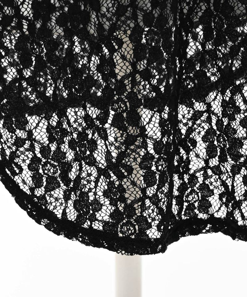 レースの中にフラワーモチーフの刺繍が施され、モードな印象の中に甘さをプラスしてくれます。アウトスタイルも様になるようラウンドヘムデザインを採用。ボディラインを拾いすぎず華奢見えするシルエットです。