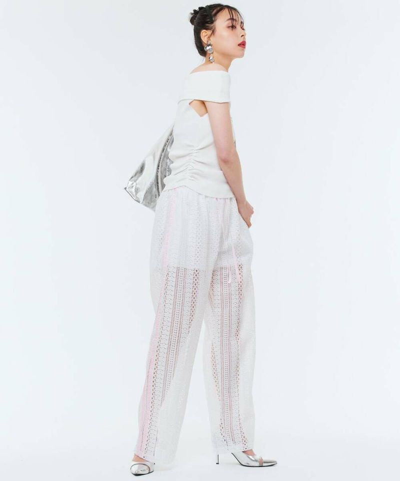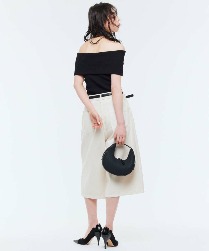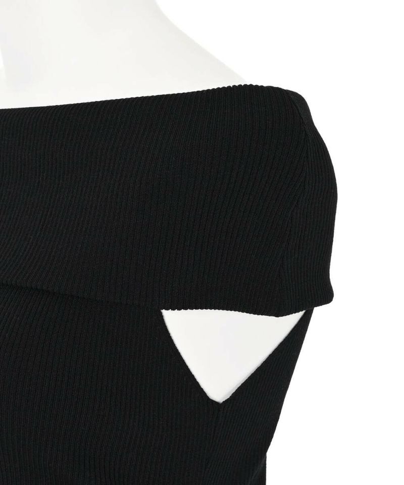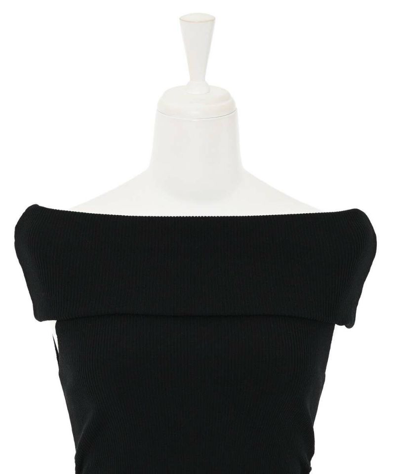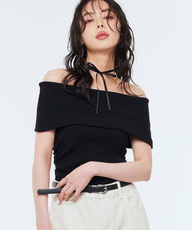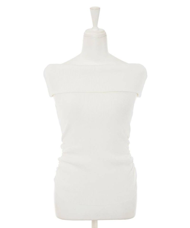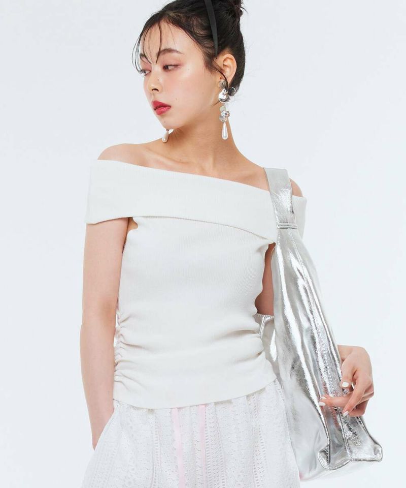 オフショルシルエットでヘルシーな肌見せができるサマーニット。折り返しデザインで鎖骨周りがスッキリ見えるデザイン。サイドのシャーリングとリブ素材が身体のラインを程良く拾い、華奢見えが叶う一枚。