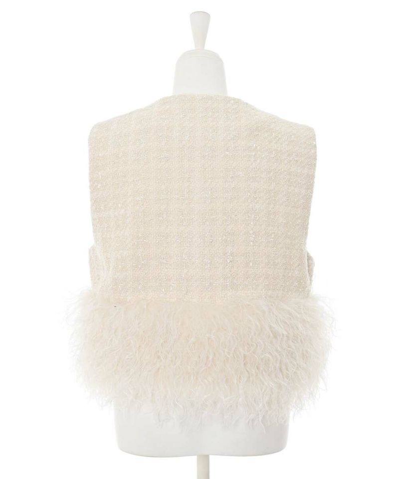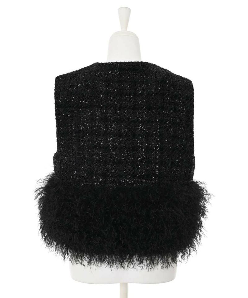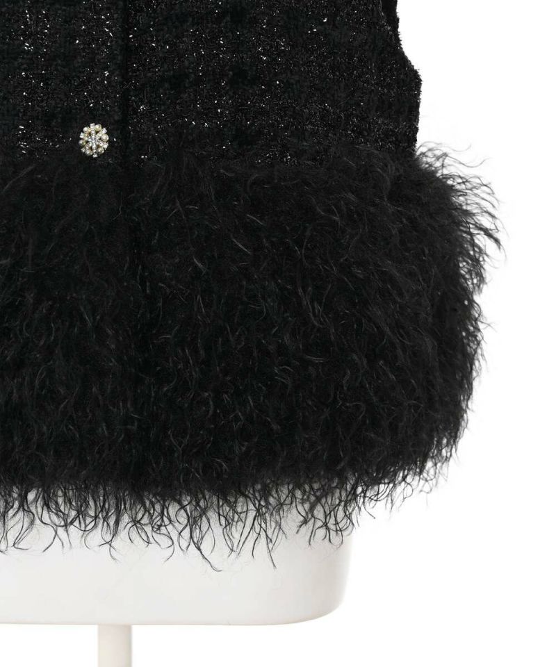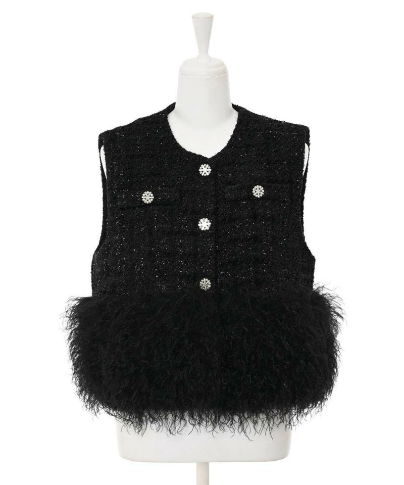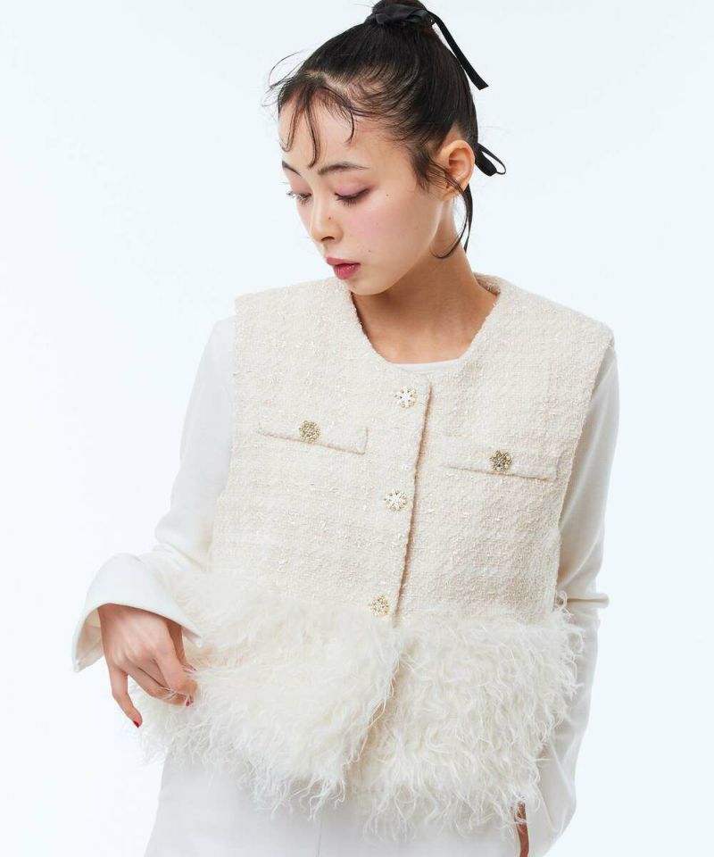 ラメ入りのツイードデザインはエレガントさがあり、上品でトレンド感のあるお洒落なベスト。裾のファー部分がシーズンライクな印象に。ビジューとパールをあしらったボタンが更に女性らしさをプラス。ボトムスとのバランスが取りやすい少し短めの丈感。