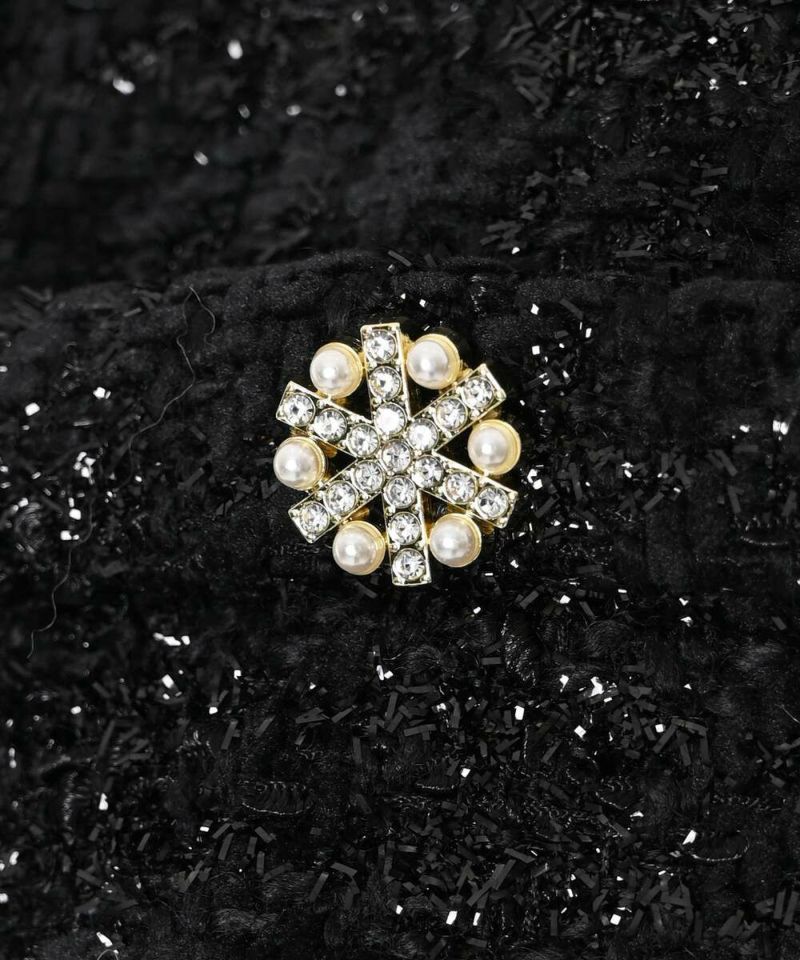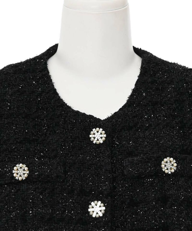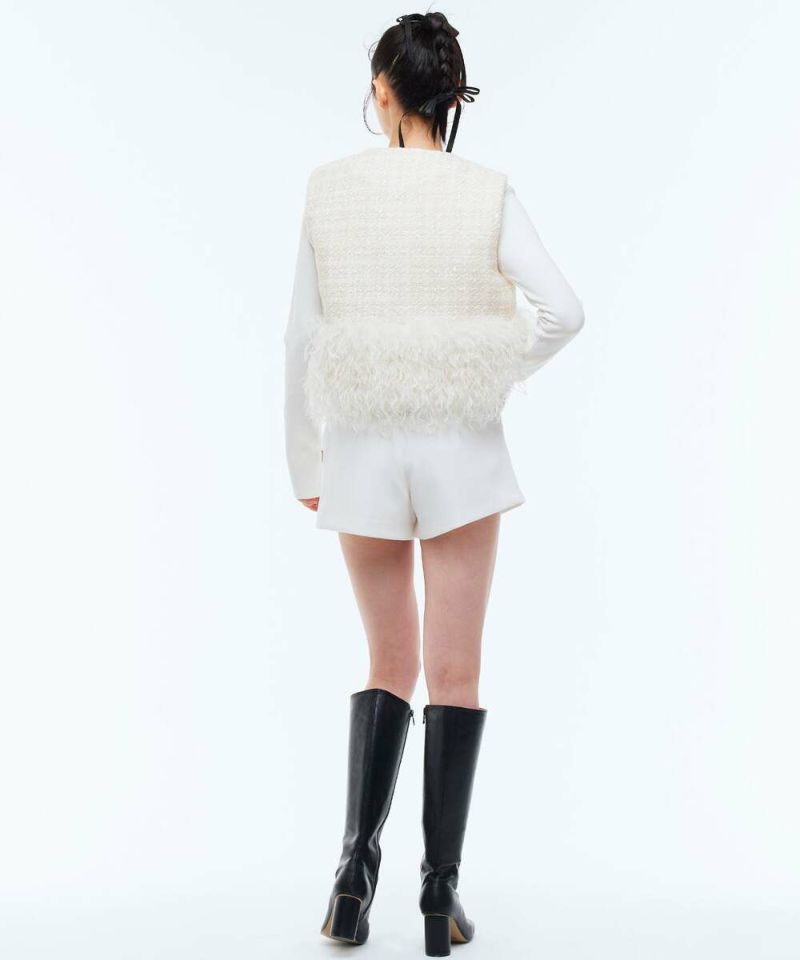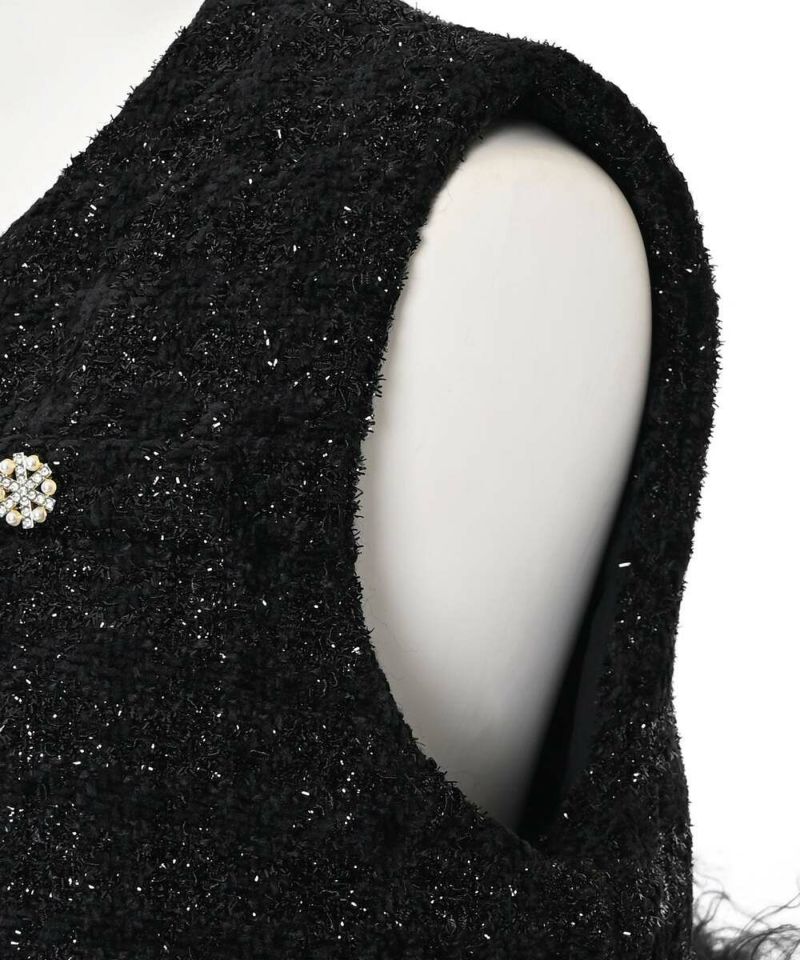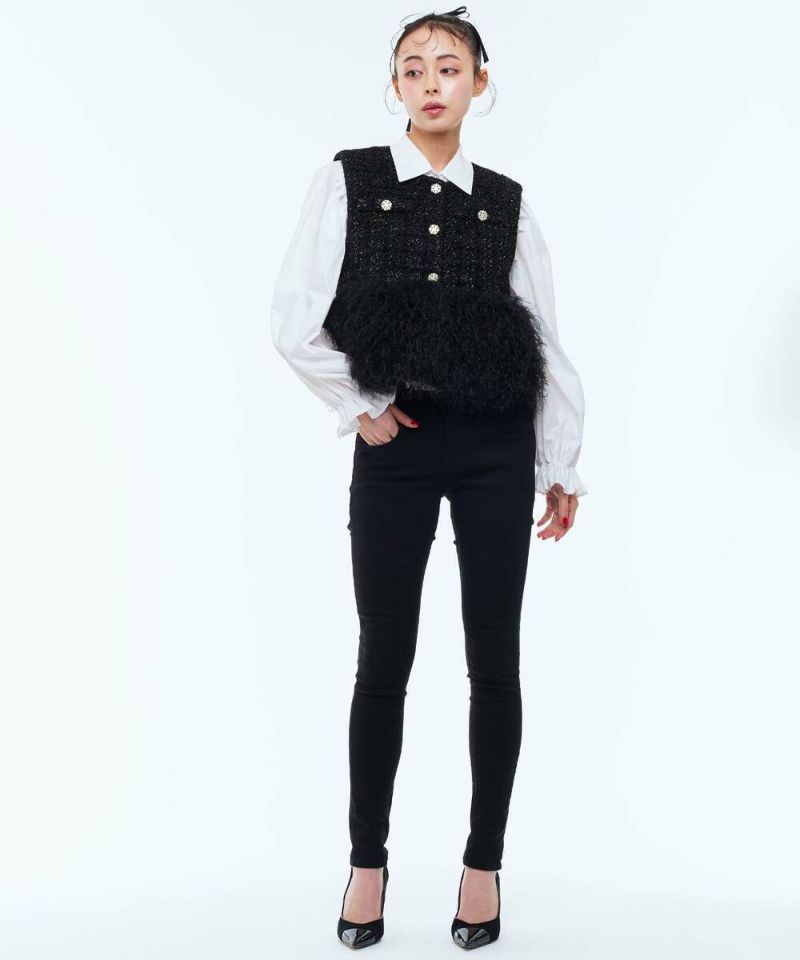 ラメ入りのツイードデザインはエレガントさがあり、上品でトレンド感のあるお洒落なベスト。裾のファー部分がシーズンライクな印象に。ビジューとパールをあしらったボタンが更に女性らしさをプラス。ボトムスとのバランスが取りやすい少し短めの丈感。