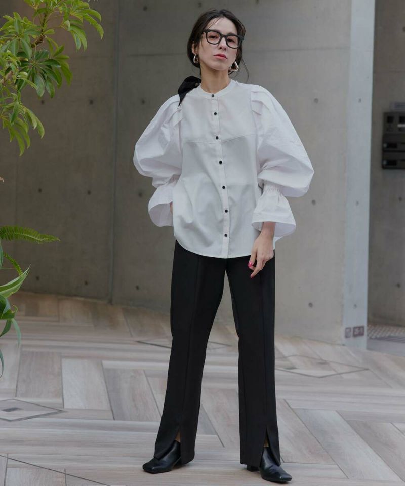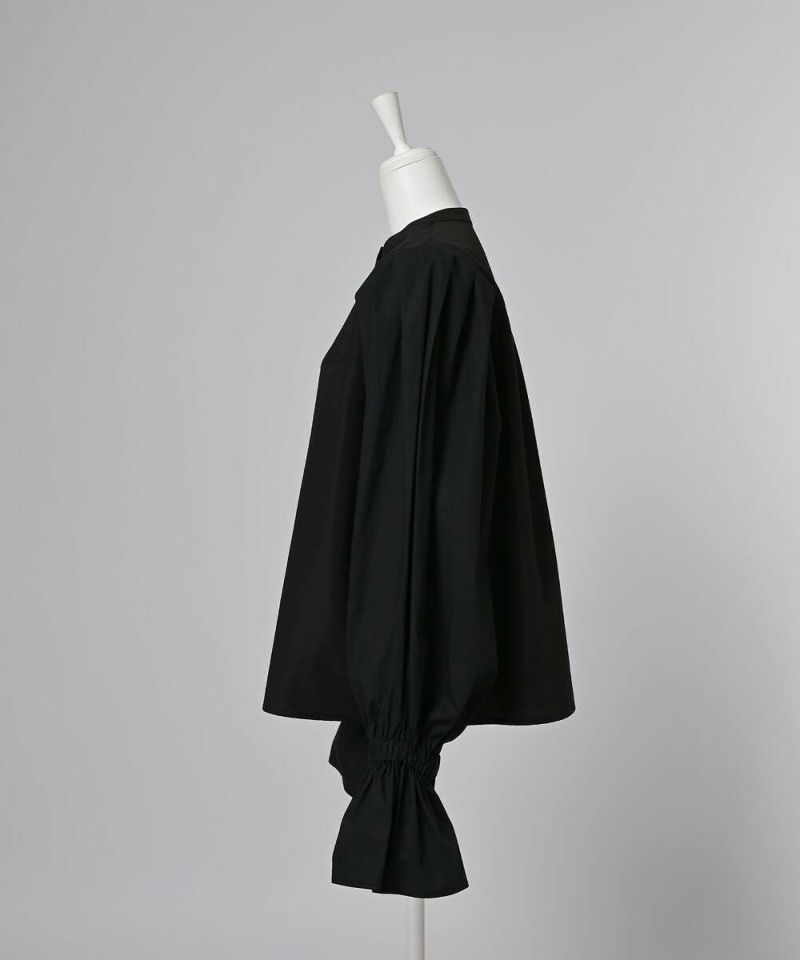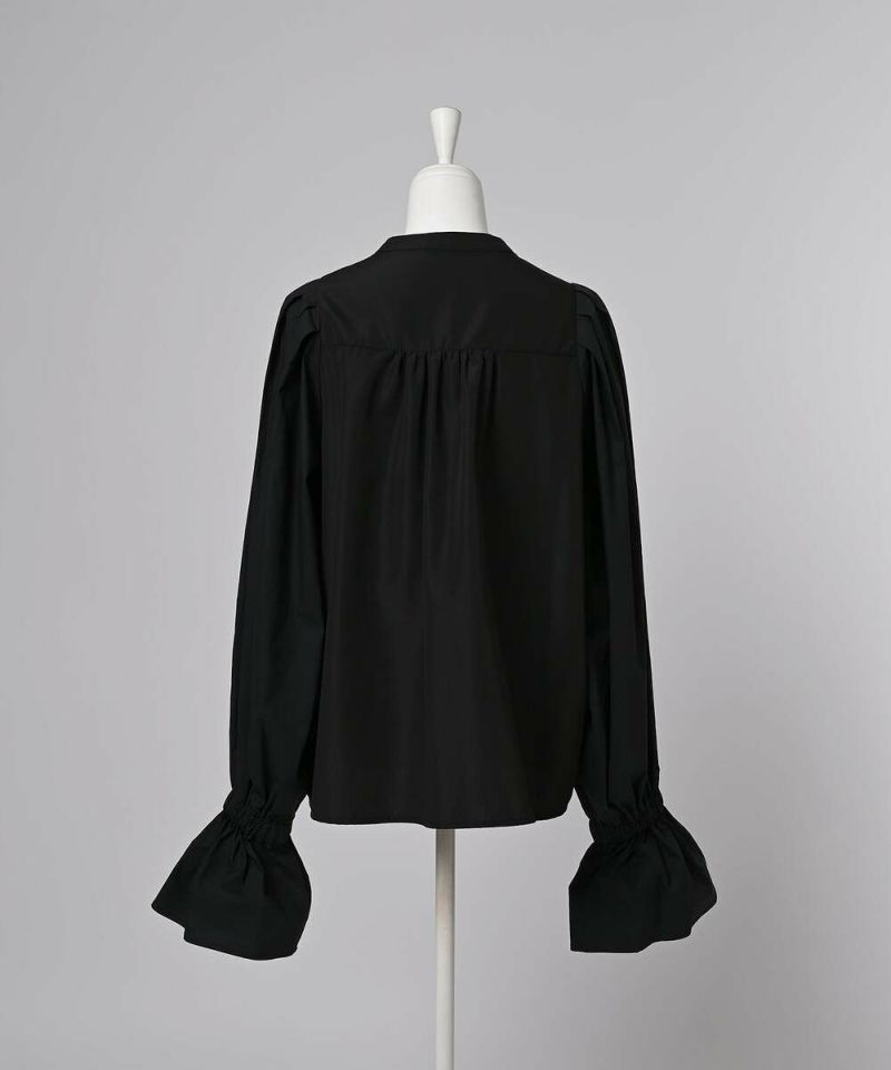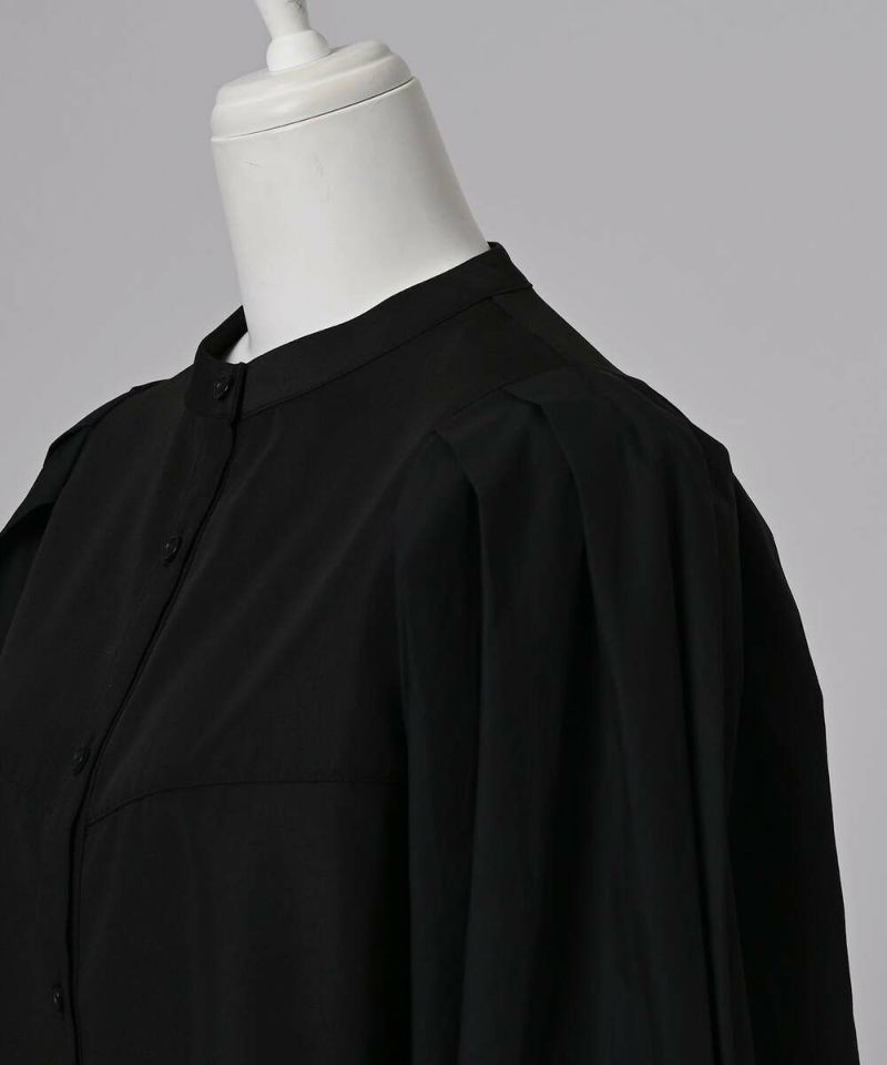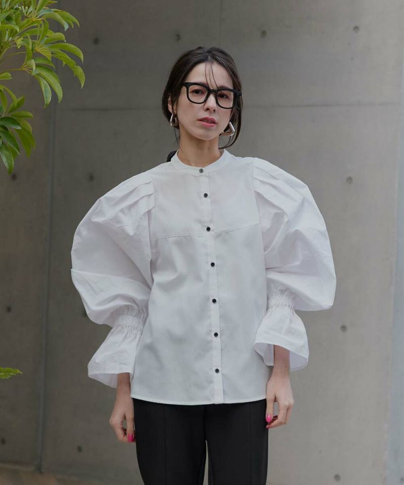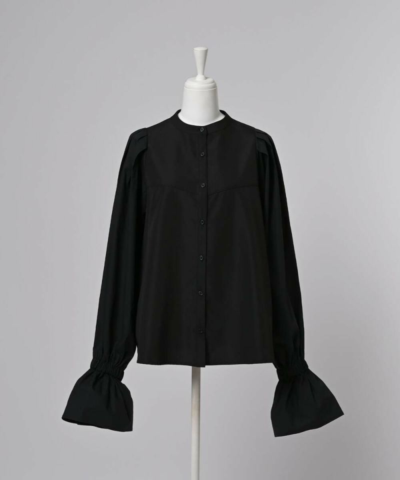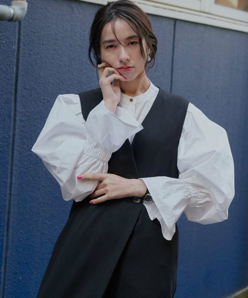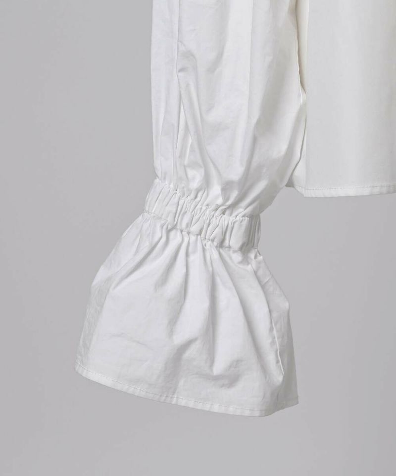 肩を覆うようにタックを施したボリュームたっぷりのスリーブデザインが魅力のブラウス。袖には軽やかでありながらシルエットをキープする素材を採用し、身頃にはふわりと揺れながらボディラインをひろわないライトな着心地の素材を採用することで、異素材をドッキングさせた理想の着心地が叶うアイテム。袖口のゴム切り替えでふわっと広がるカフスは、長袖・七分丈・半袖と袖丈を自由に調整でき、ロングシーズン着用可能。ノーカラーの上品なシルエットとのバランスを取ることで一枚ではもちろん、オールインワン・ワンピース・ベストなどのレイヤードスタイルにも取り入れやすい着回しの効くアイテムに。普段使いからオケージョンまで幅広いシーンで着用できます。【model】H160 B80 H85