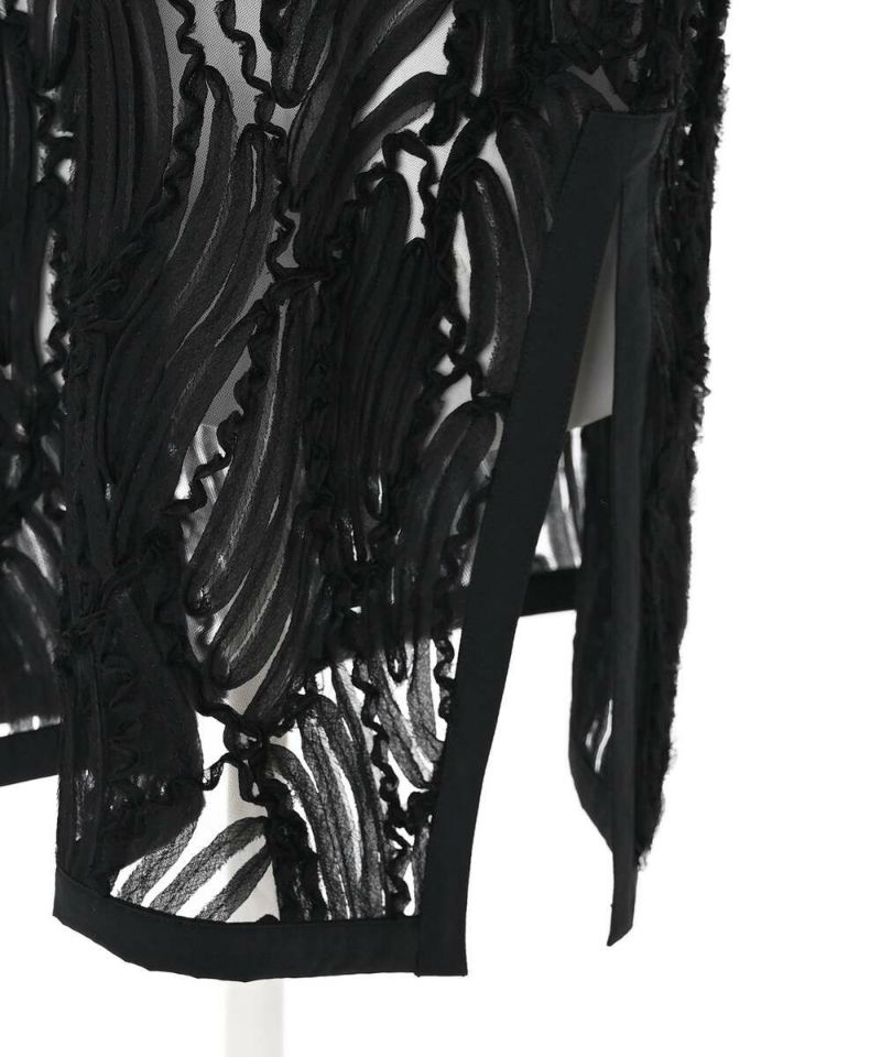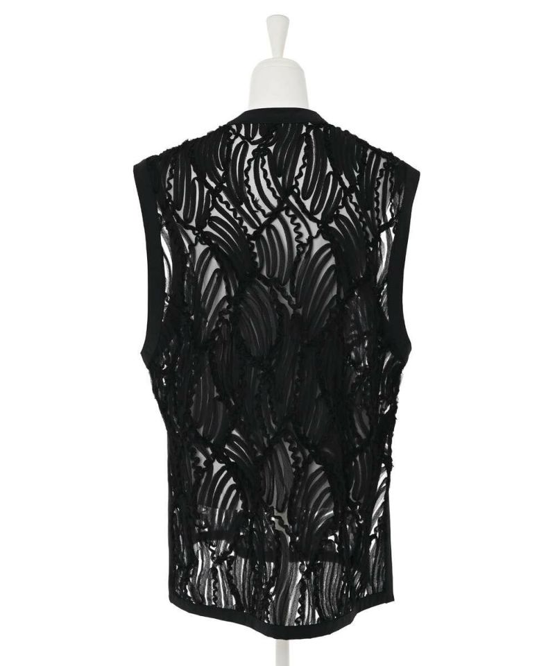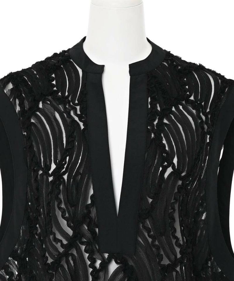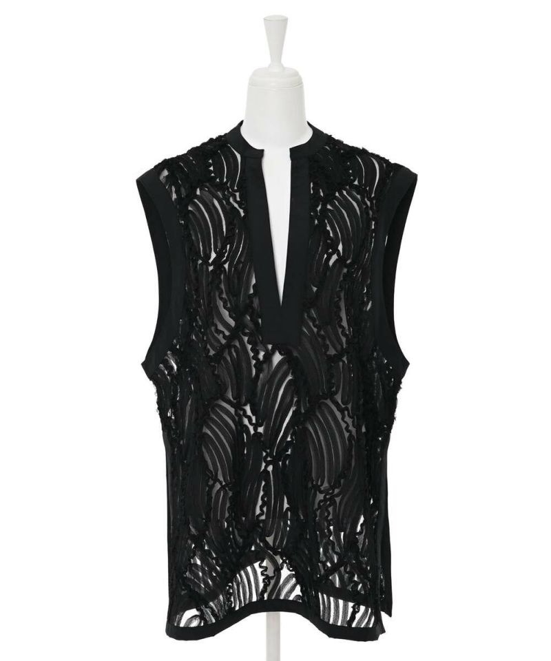 薄い布地に透かし模様の刺繍を施したエンブロイダリー素材を使用したトップス。サイドスリットが入っており、ゆったりとしたストレスフリーなサイジングでヒップラインが隠れる着丈に設定。深めのVネックとシアー素材が清涼感のある上品な印象に。シャツやTシャツ・気温が上がる時期はノースリやワンピース等とレイヤードするのもオススメ。【model】H165 B78 H83