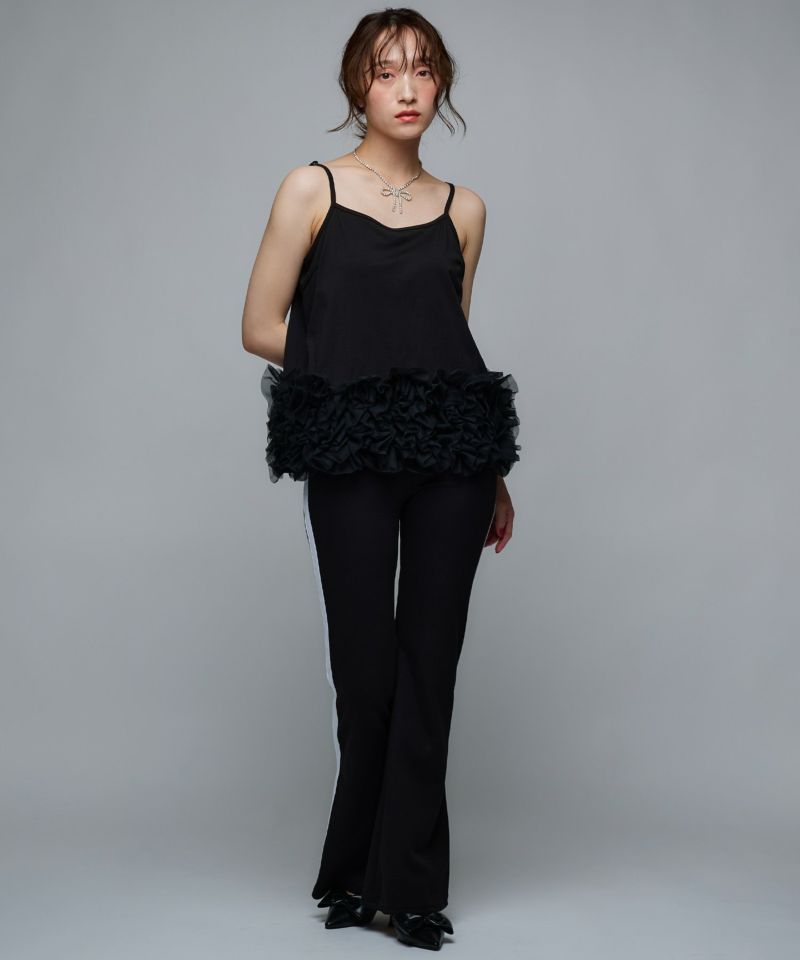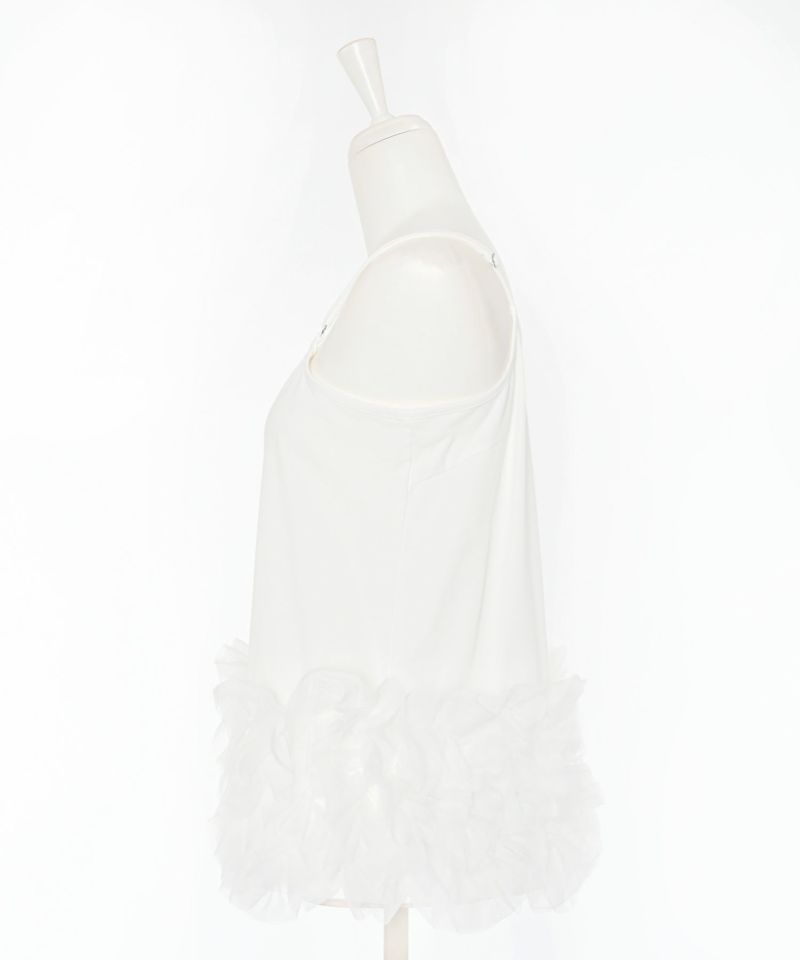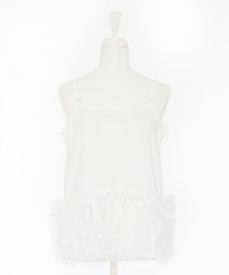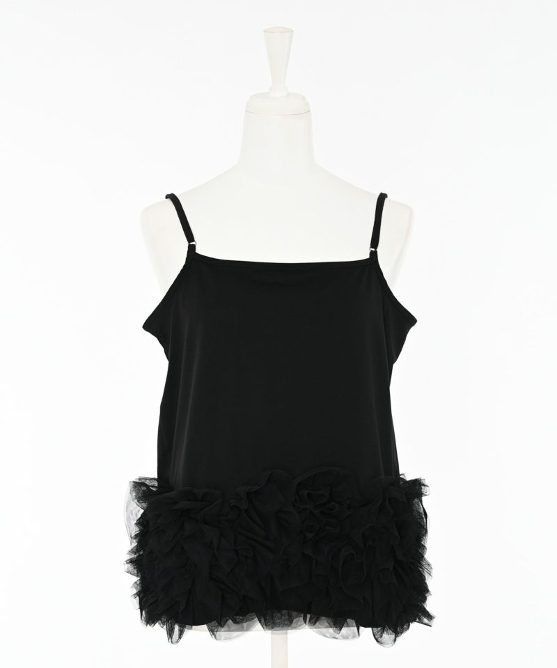 【PICCIN】心にフィットし、人を幸せにする洋服を。心まで作用するような洋服でありたいとPICCINは1990年に誕生以来、妥協せずこだわった洋服作りをしているブランド。さらっとした生地とチュールが施された可愛らしいトップス。肩紐のアジャスターで長さ調整可能。夏はデニムなど合わせてカジュアルに、秋口にかけてスウェットやカーディガン等レイヤードするのも◎春から秋口にかけて幅広くお使いいただけます。【model】H163 B78 H84 / H160 B80 H85