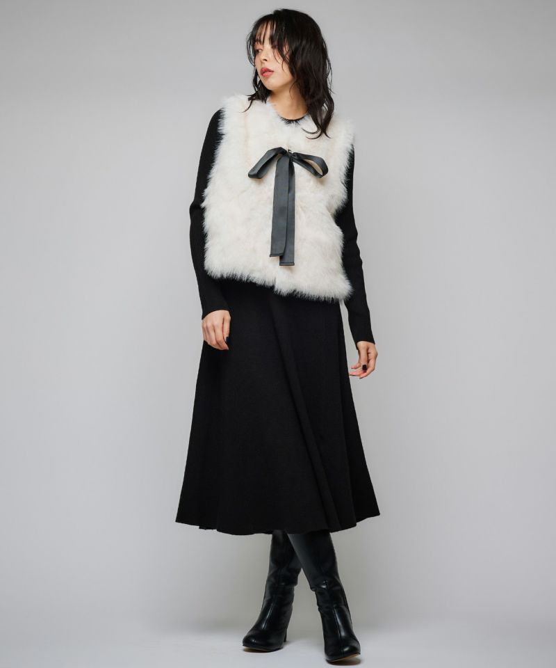 チュールスカートやワンピースでとことん甘くフェミニンスタイル。リボンを外して甘すぎないベーシックなファーベストとしても活用できます。リボンを通す部分が両サイドに設置されているので、サイドどちらかにリボンを付けることも可能です。着丈が短めなので、ハイウエストボトムとのバランスが取りやすいのが特徴。
