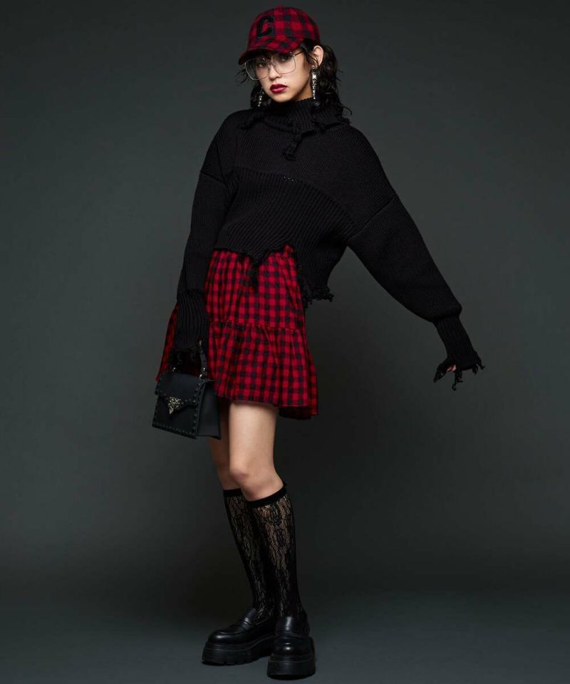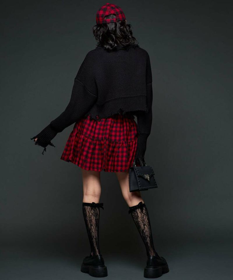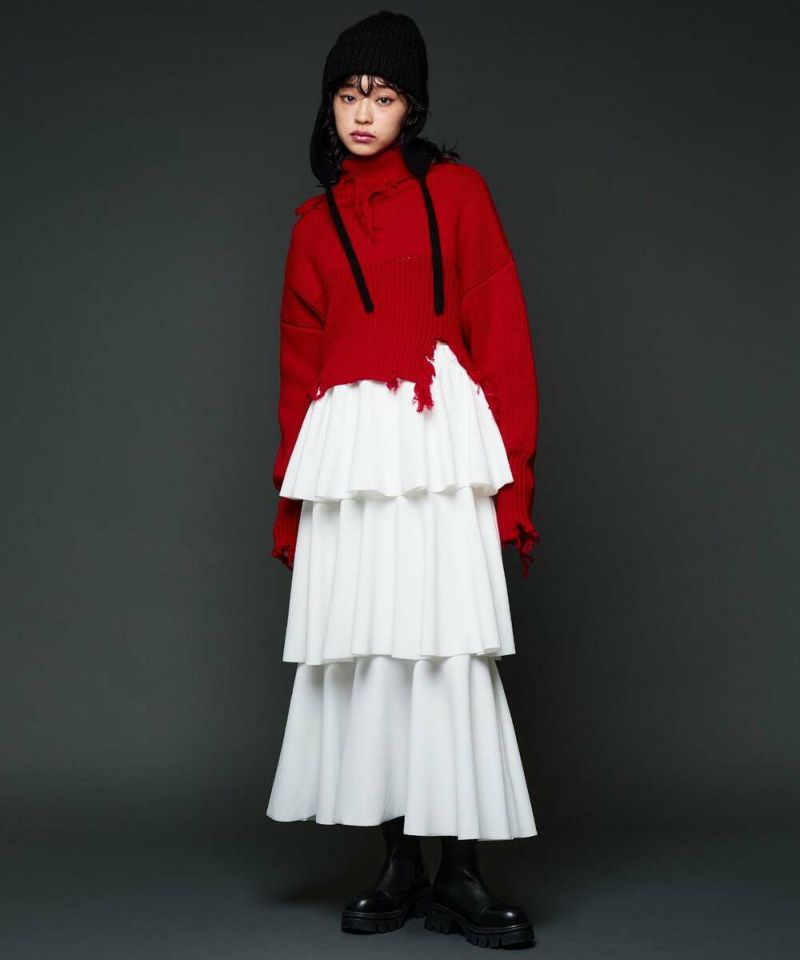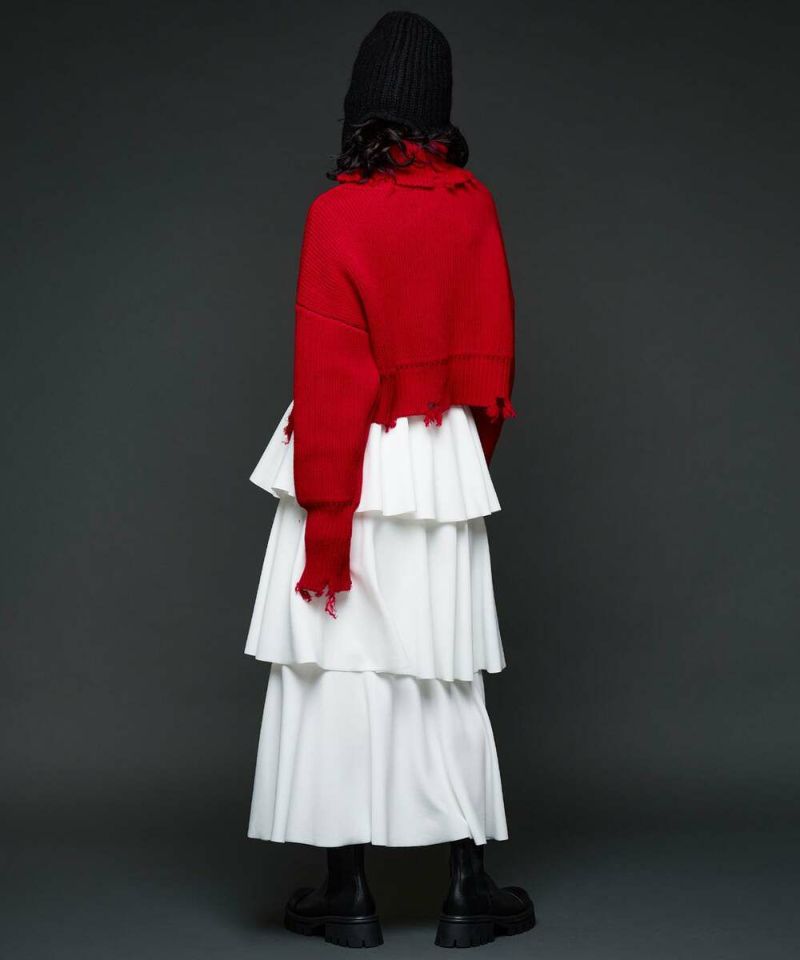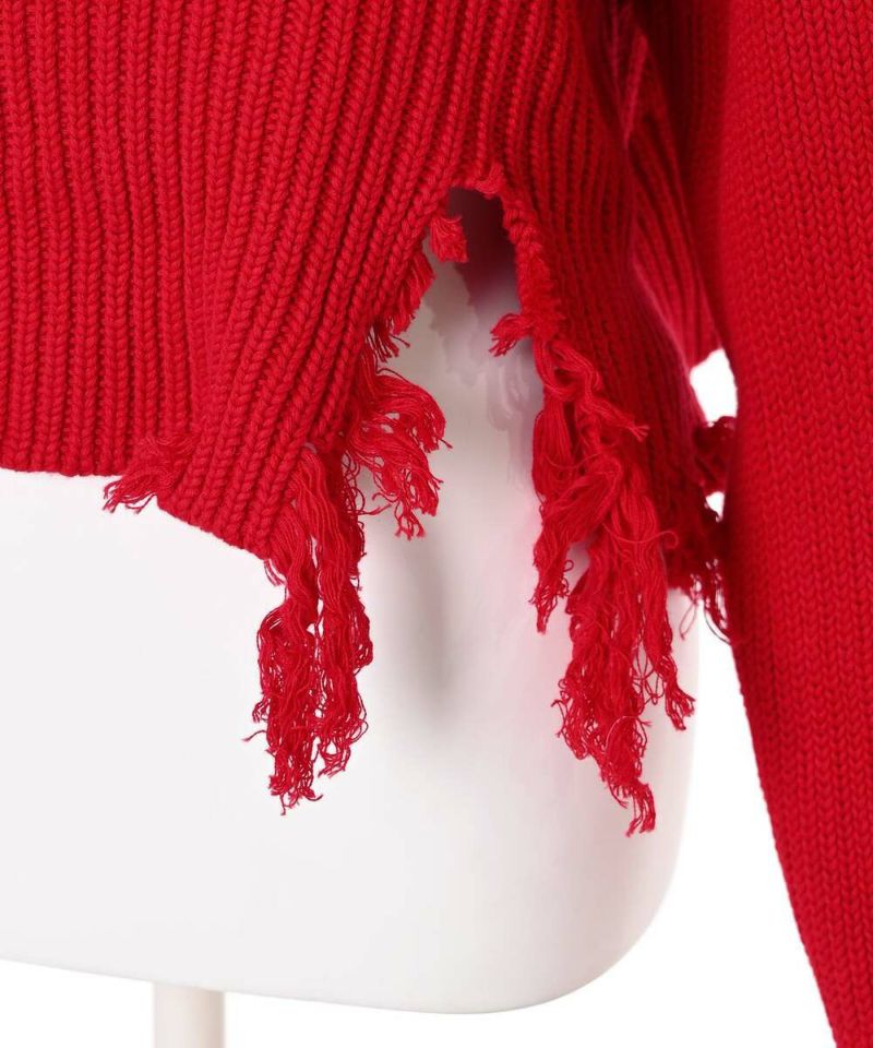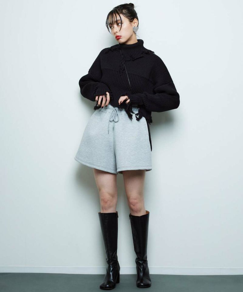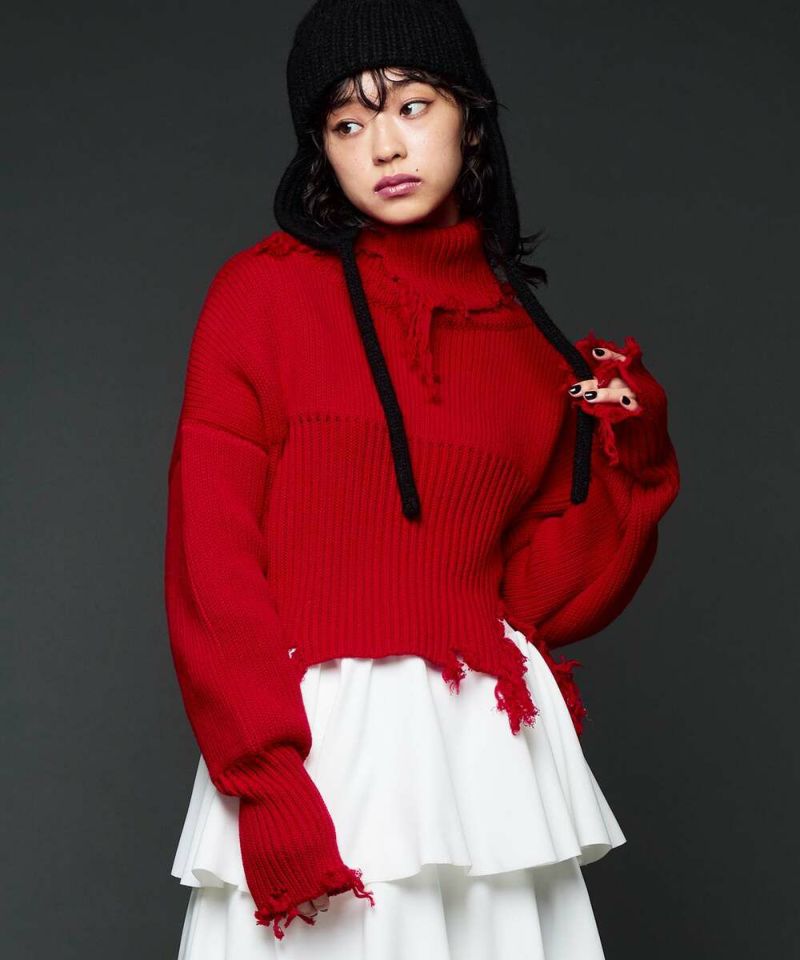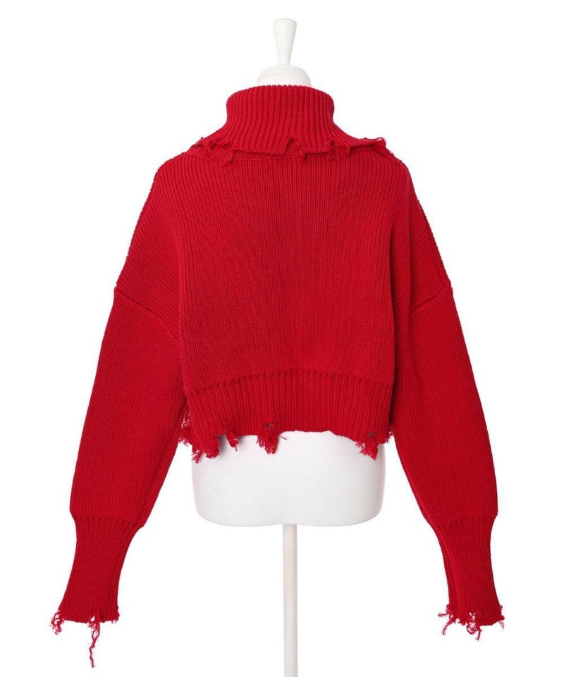 クラッシュ加工を裾・袖・ネック部分に施したニットトップス。バスト部分の切り替えが特徴的で、ボトムスとのバランスが取りやすいショート丈が普段使いしやすいポイント。モデル身長:165cm/155cm/163cm