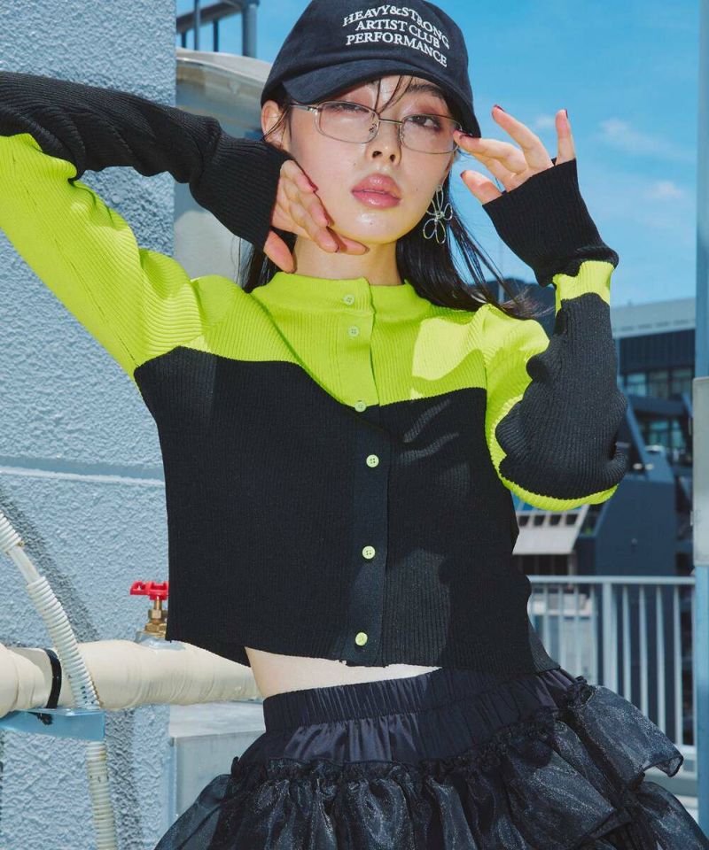バイカラーの配色が目を惹く一枚。様々なボトムスとバランスよくスタイリングしやすい丈感に拘りました。ビスチェをレイヤードしたような切り替えデザインや、袖口のラインなど細かい部分に遊び心をプラス。ボディラインにフィットするサイジングで、伸縮性があり肌触りの良いニット糸を採用することで、リラックスした着心地を叶えました。ボタンの開閉可能なのでインナーにキャミソールを入れて羽織として着用するのもオススメ。 【model】:H165 B78 H83 / H163 B78 H84
