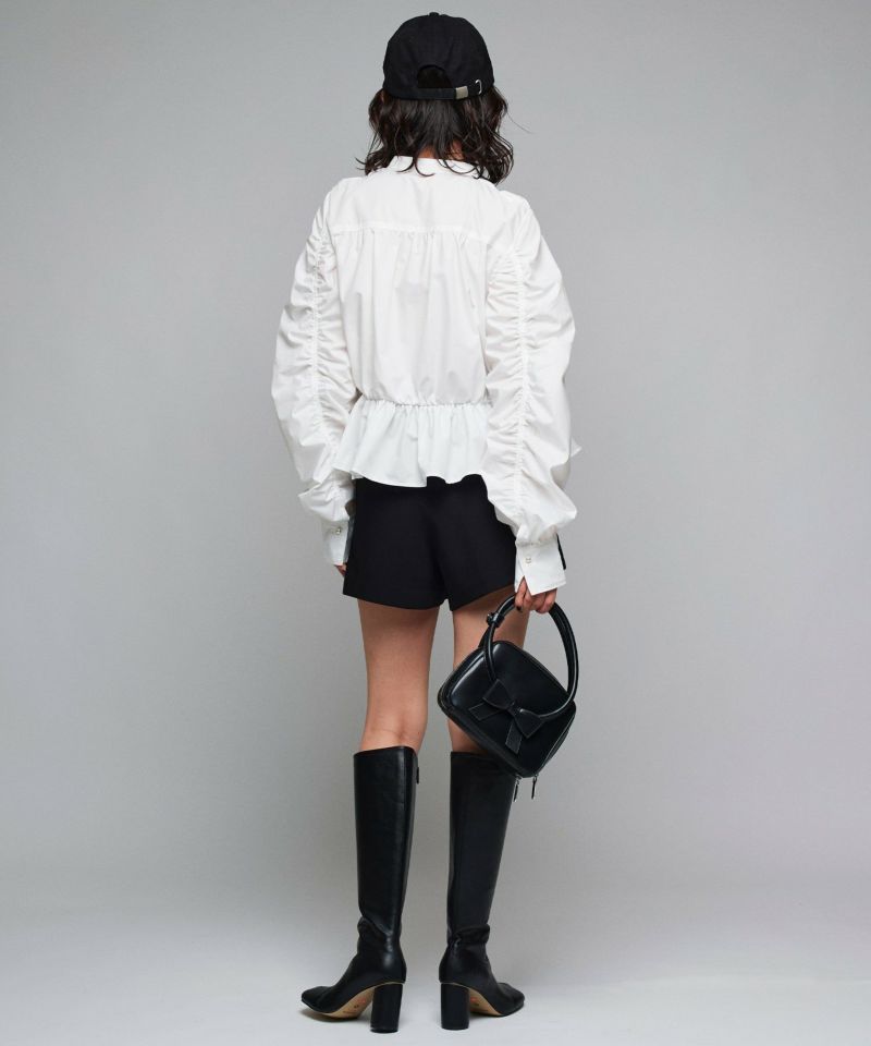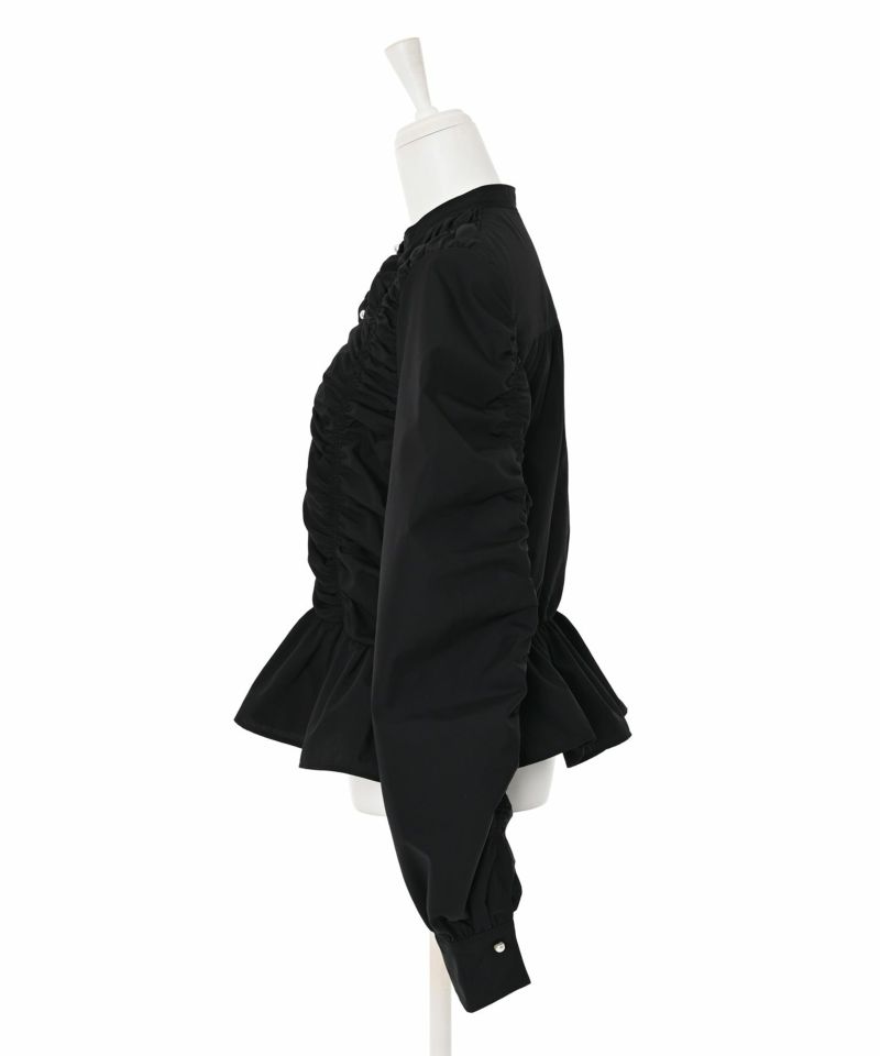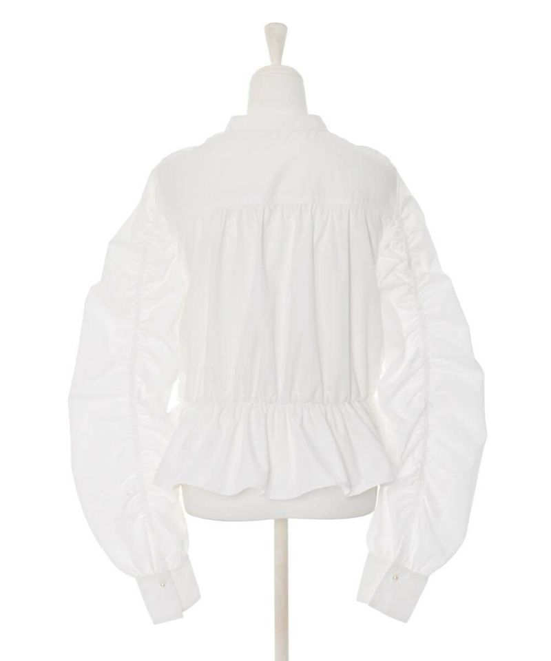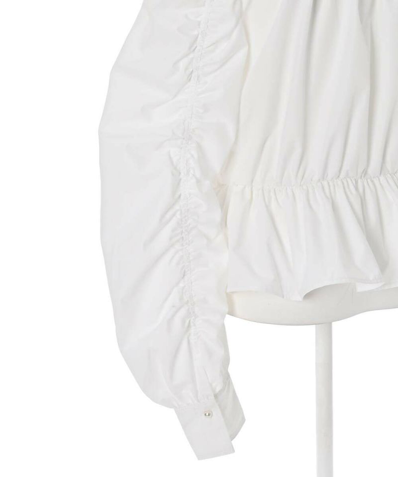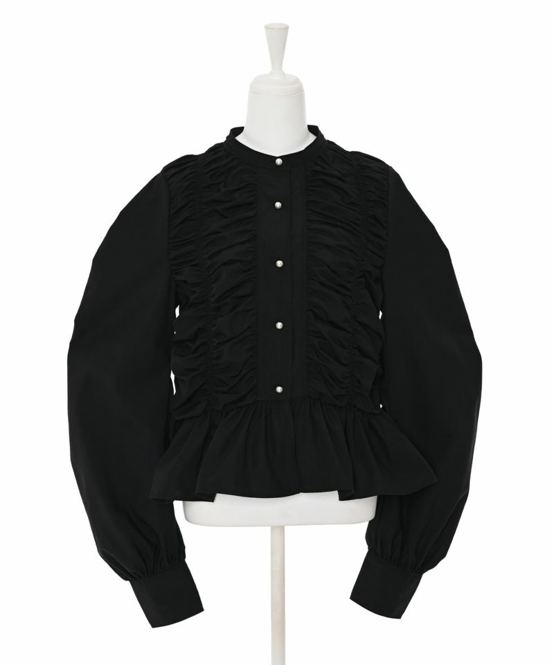 【PICCIN】心にフィットし、人を幸せにする洋服を。心まで作用するような洋服でありたいとPICCINは1990年に誕生以来、妥協せずこだわった洋服作りをしているブランド。 フロントと袖にたっぷりとギャザーが入った女性らしさ溢れるブラウス。裾のフリルとパールボタンがフェミニンな印象をプラス。ボリュームのあるシルエットながらも、ノーカラーで首回りをスッキリ見えさせることで、バランスの良いディティールに。【model】H163 B78 H84