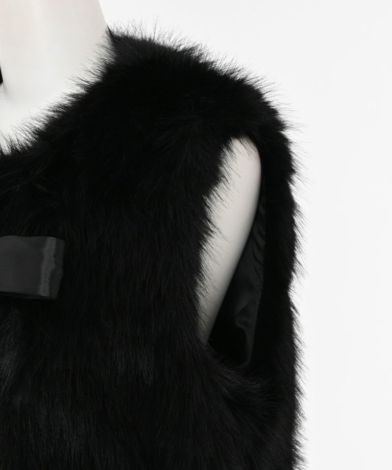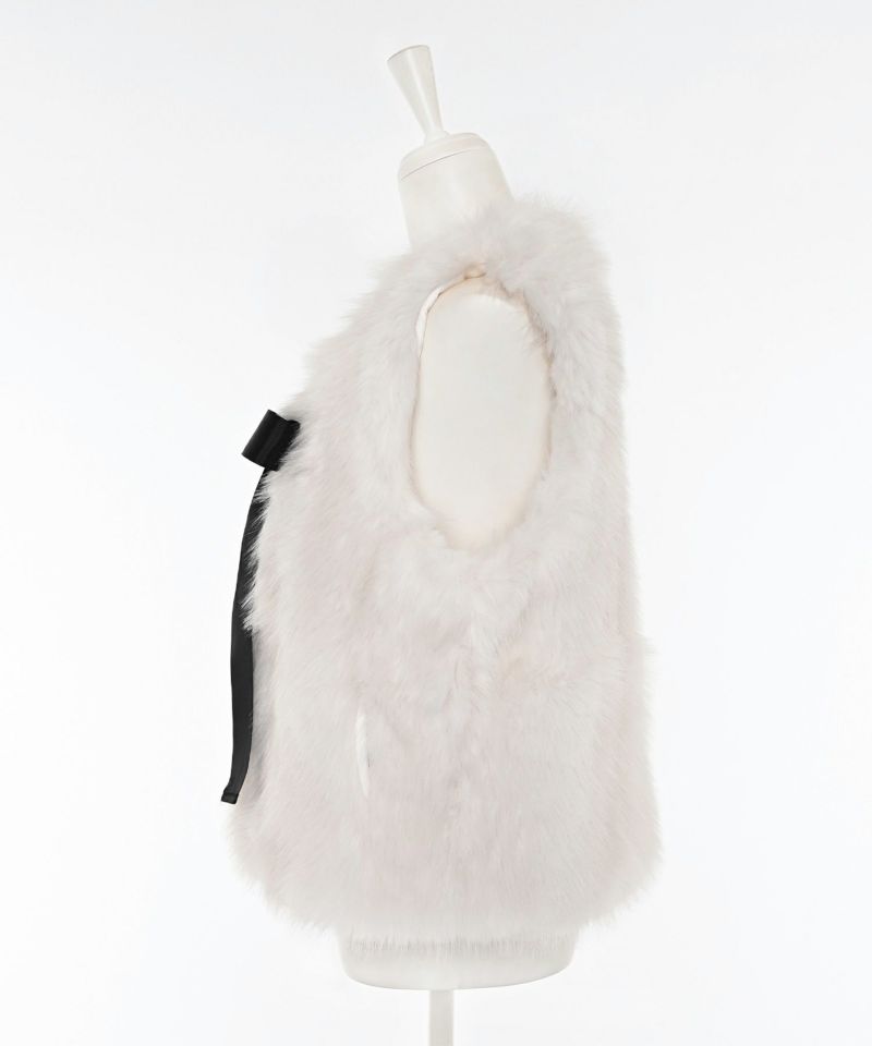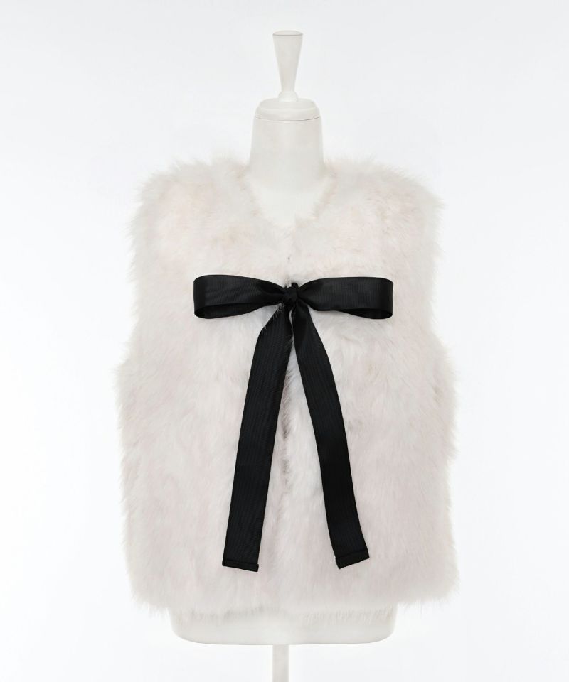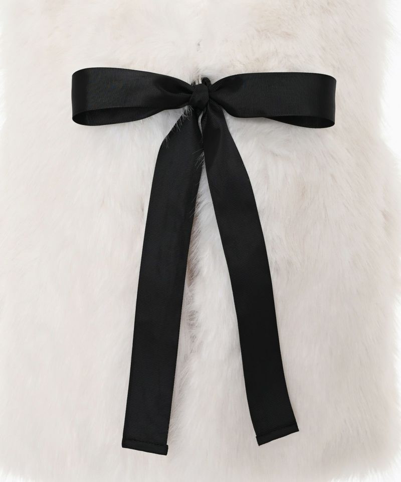 チュールスカートやワンピースでとことん甘くフェミニンスタイル。リボンを外して甘すぎないベーシックなファーベストとしても活用できます。リボンを通す部分が両サイドに設置されているので、サイドどちらかにリボンを付けることも可能です。着丈が短めなので、ハイウエストボトムとのバランスが取りやすいのが特徴。