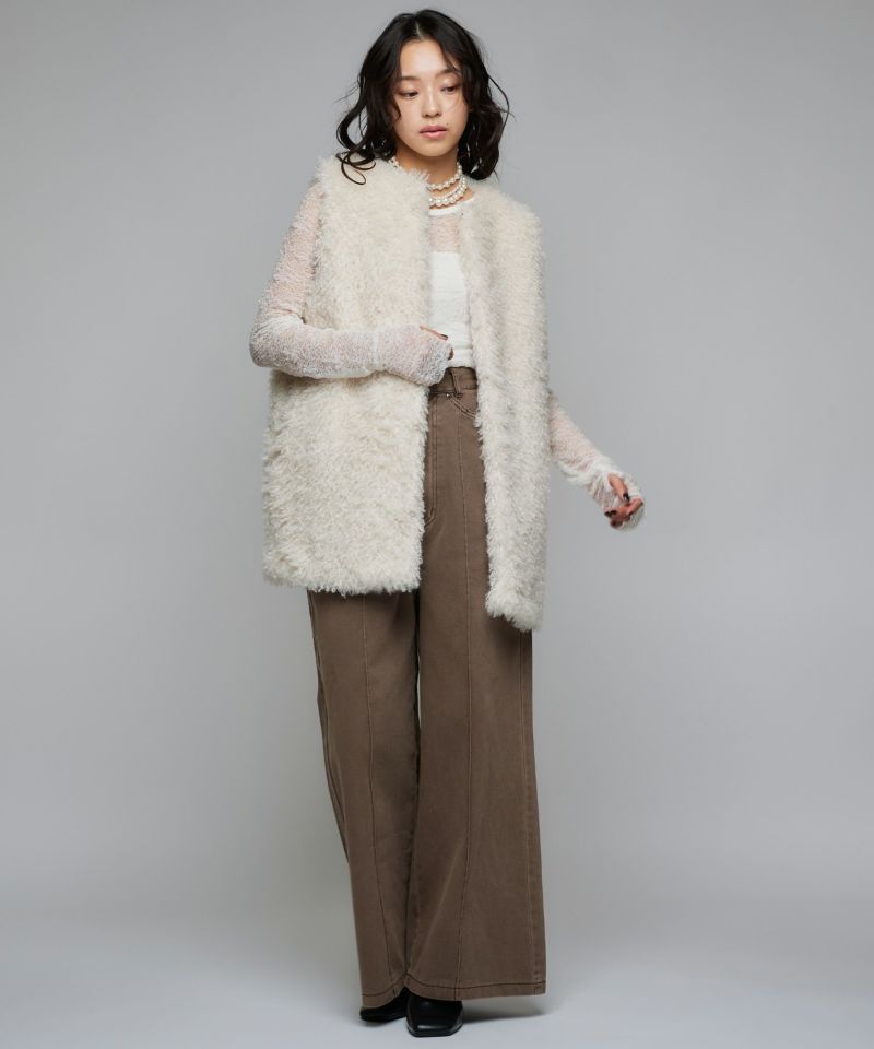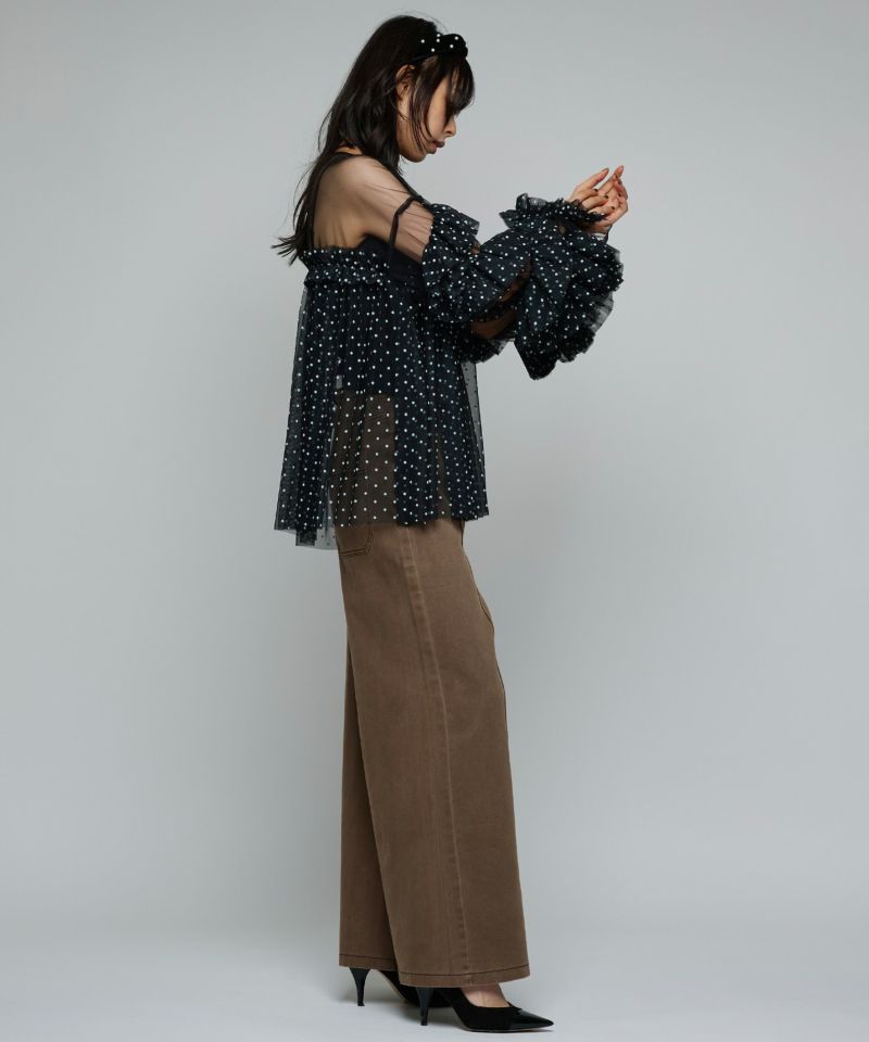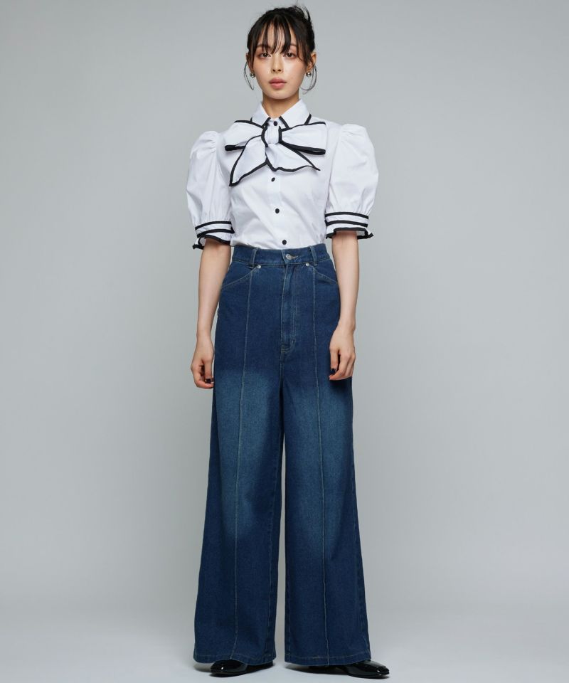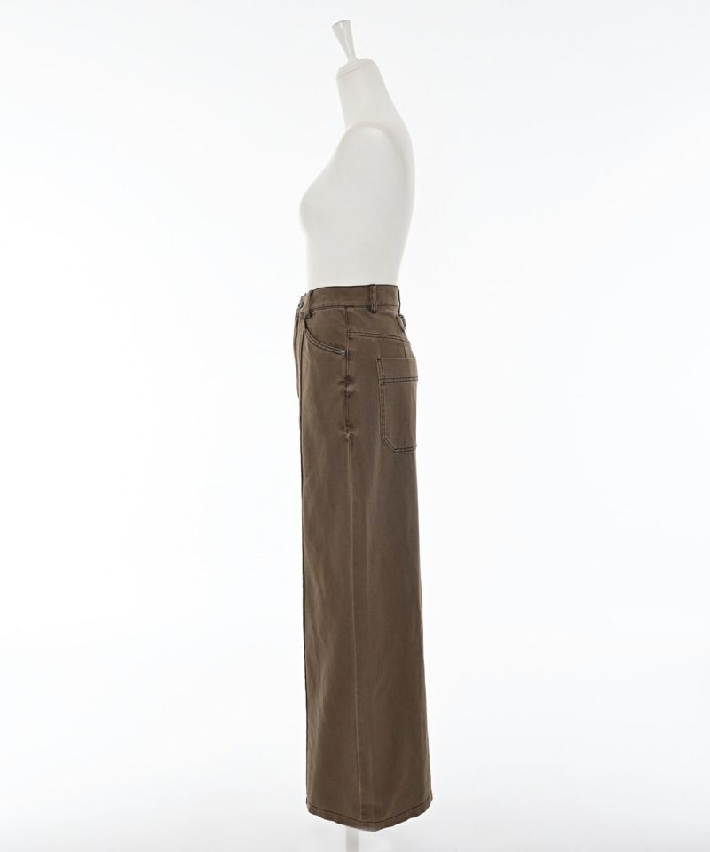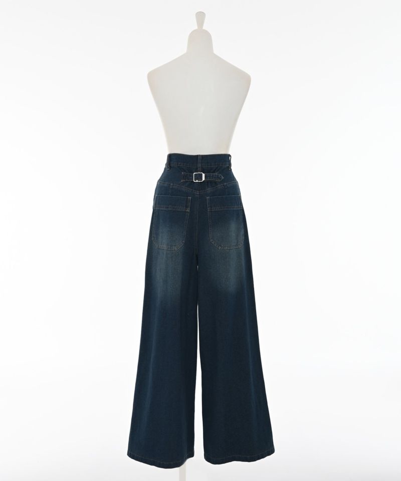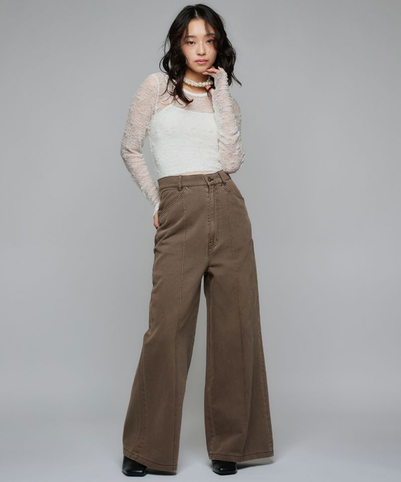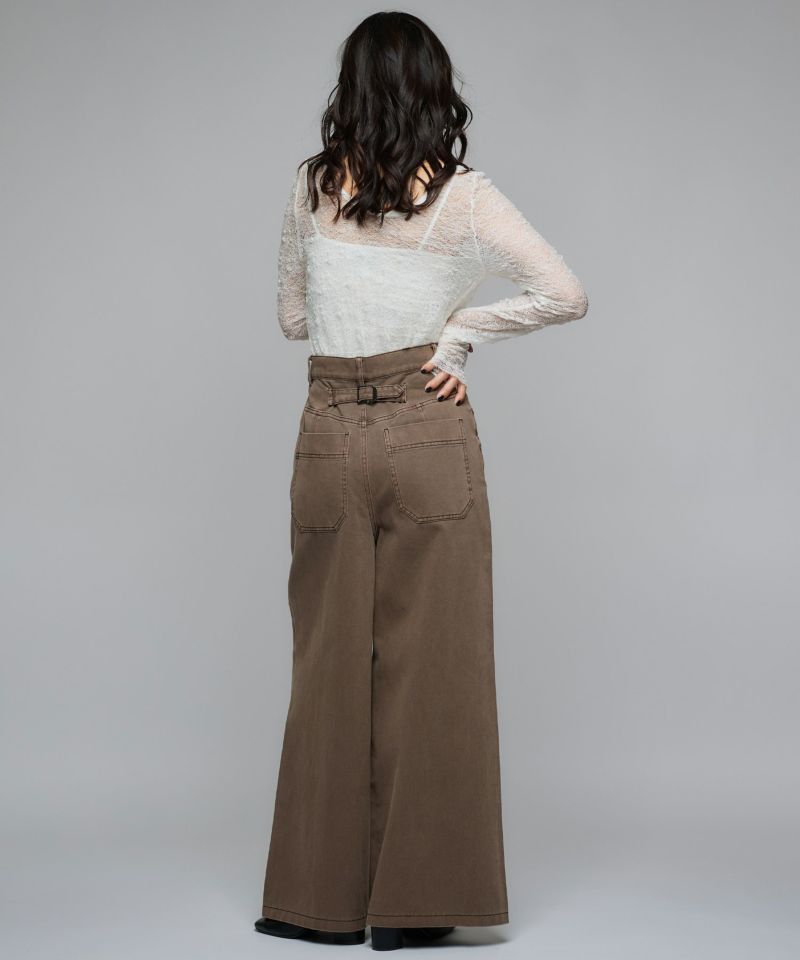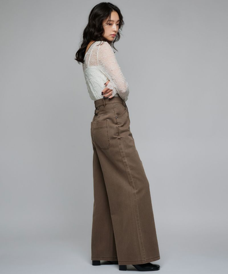 ハイウエストとセンタープレスで脚長効果を叶えるワイドシルエットパンツ。ヒップ部分にはアジャスターを備えており、ご自身の体型に合わせてフィット感を調整できます。ブルーはヴィンテージ加工を施しこなれ感のある仕上がりに、ブラウンは深みのある色合いに黒のステッチを効かせてシックにまとめています。