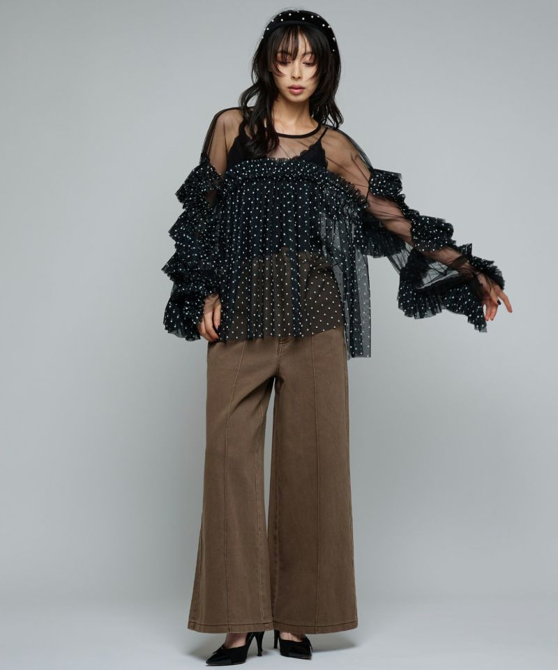 ハイウエストデザインとセンタープレスが美しいシルエットを描き、スタイルアップを叶えるワイドパンツ。落ち感のあるラインが脚をすらっと見せ、洗練された印象を与えます。