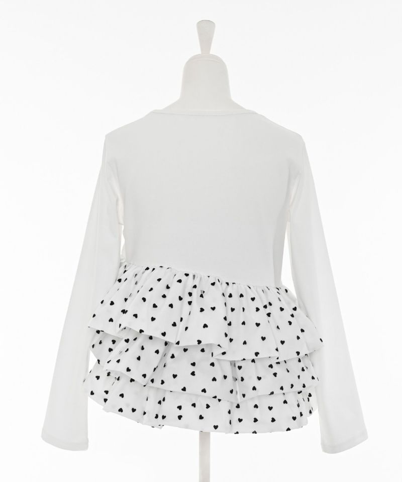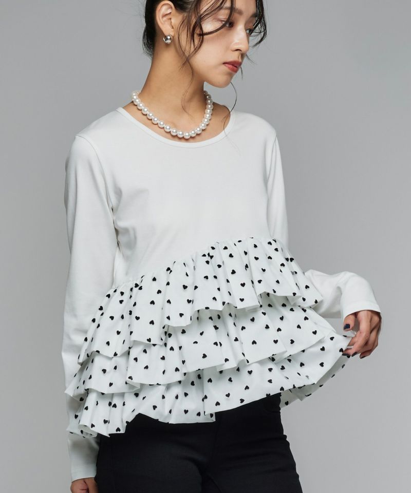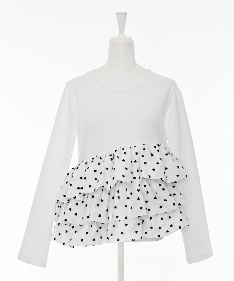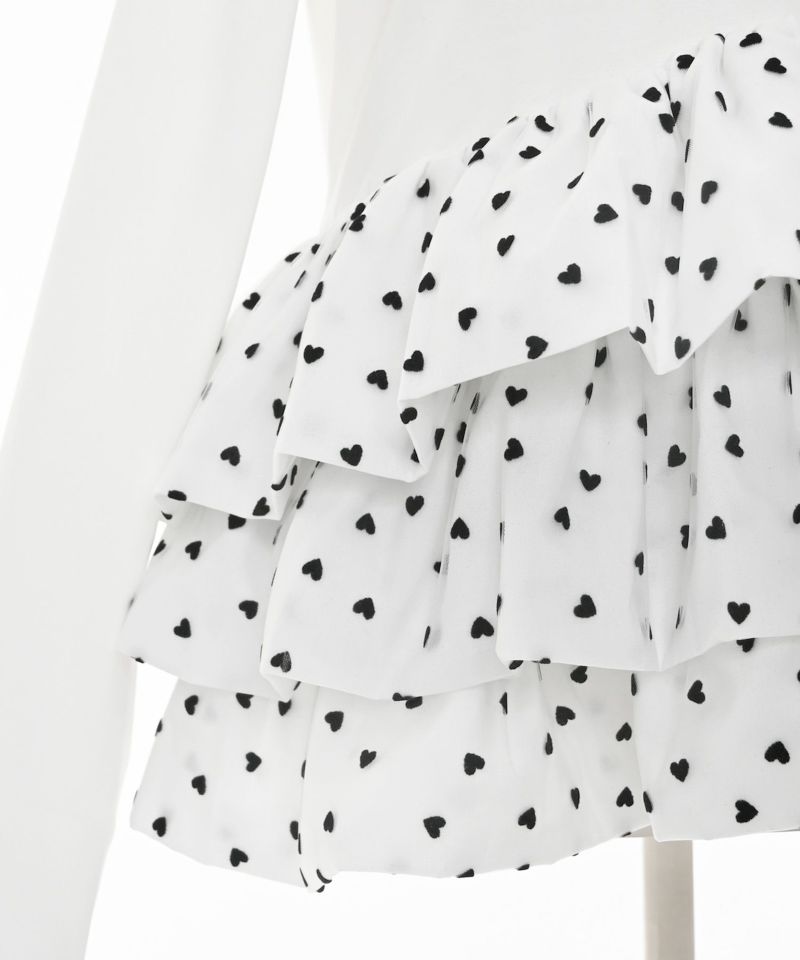 フリル部分が程よいボリューム感を出しつつ、チュールが重なっていることで軽やかな印象に。さりげないアシメデザインが個性をプラスし、フリルが全体的に広がっていることでどこから見ても女性らしいシルエットに仕上がります。シンプルな色味と可愛らしいハートモチーフが華やかさと着やすさを両立してくれる一枚。