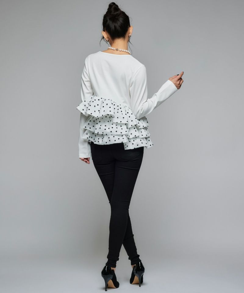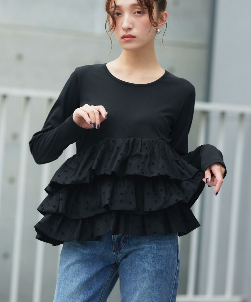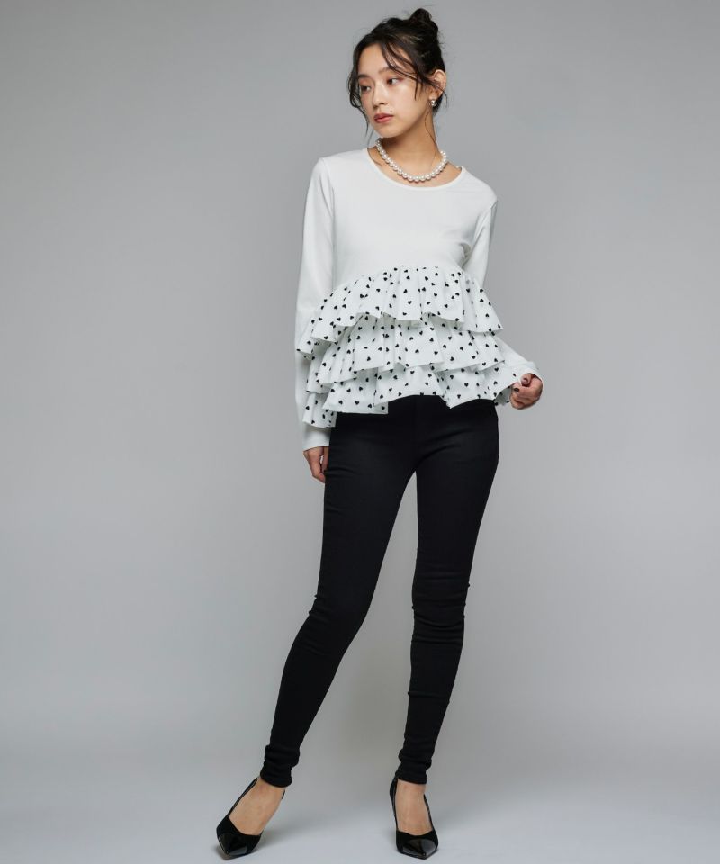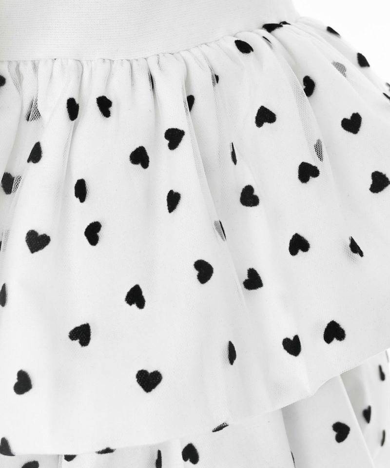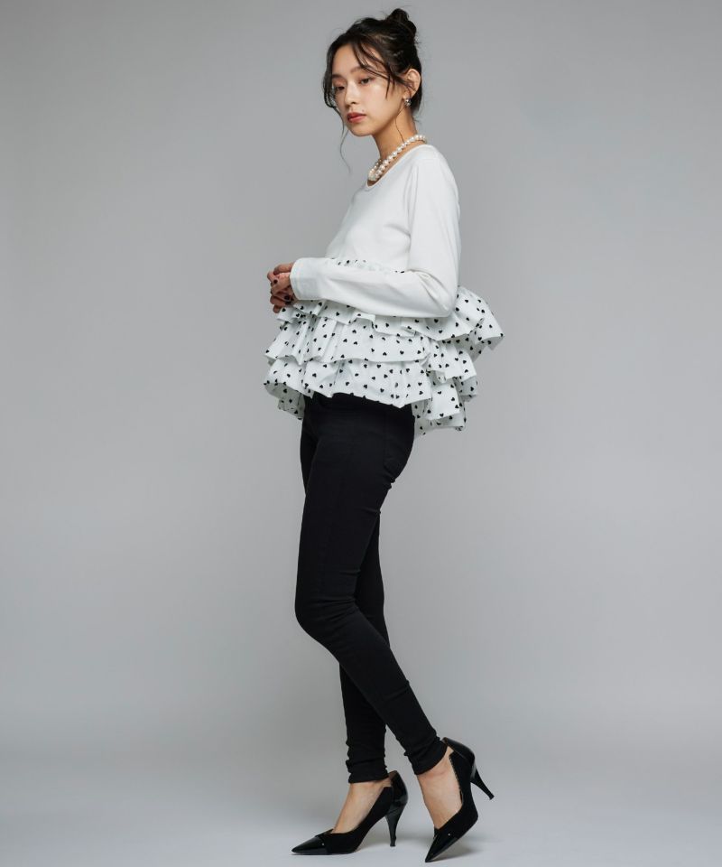 フリル部分が程よいボリューム感を出しつつ、チュールが重なっていることで軽やかな印象に。さりげないアシメデザインが個性をプラスし、フリルが全体的に広がっていることでどこから見ても女性らしいシルエットに仕上がります。シンプルな色味と可愛らしいハートモチーフが華やかさと着やすさを両立してくれる一枚。