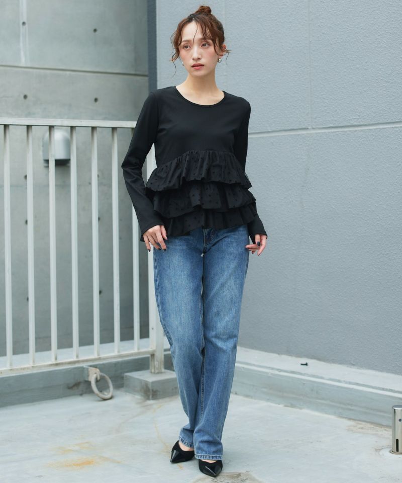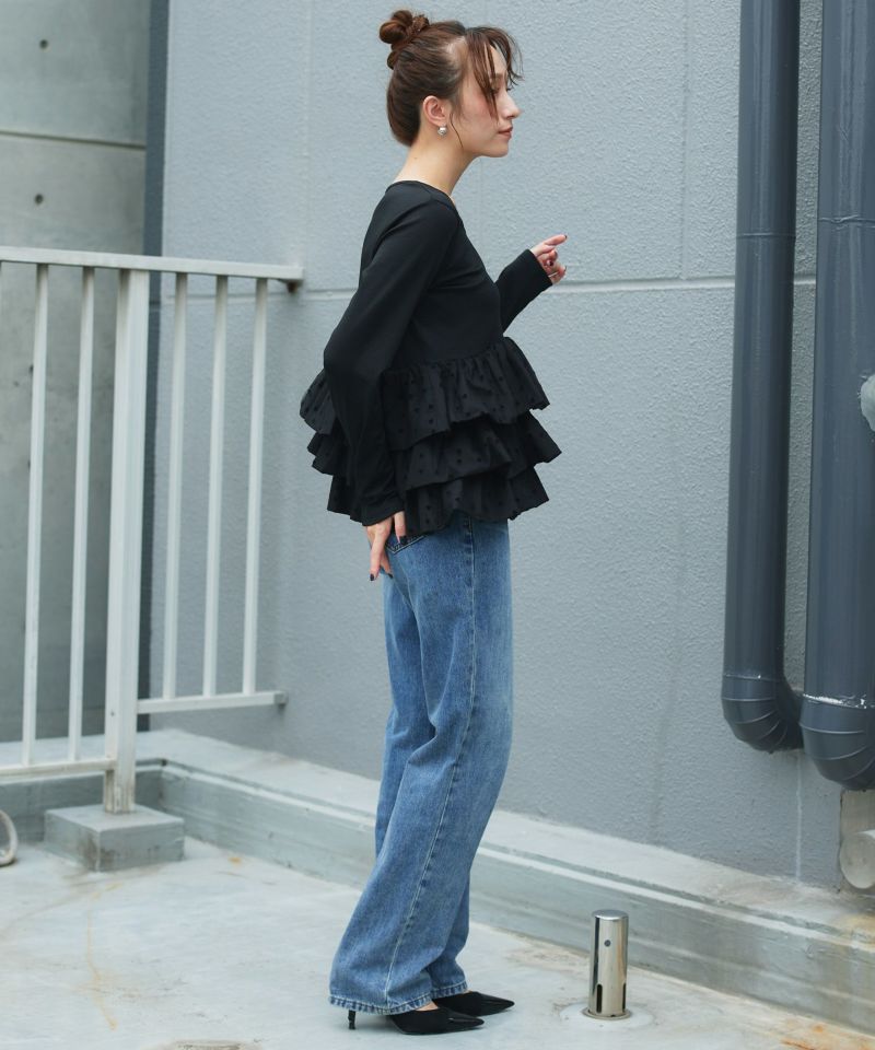 デニムと合わせることで大人カジュアルな印象になり、デイリー使いにもぴったり。タイトなスカートやパンツと合わせると、ボリューム感を活かしたスタイリングになり、メリハリのあるシルエットに。フリルが存在感を引き立ててくれるので、シンプルなボトムスと合わせるだけでもスタイリングのこなれ感を格上げしてくれます。