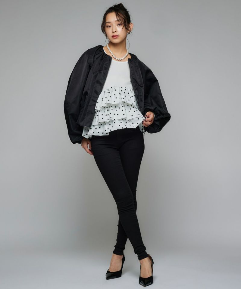 フェミニンで上品な雰囲気を格上げしてくれるハートモチーフとフリルの程よいボリューム感が華やかな立体感を演出。気になる部分をカバーしてくれるふんわりとしたシルエットをキープしつつ、女性らしいバランスをコーディネートにプラスしてくれるアイテム。