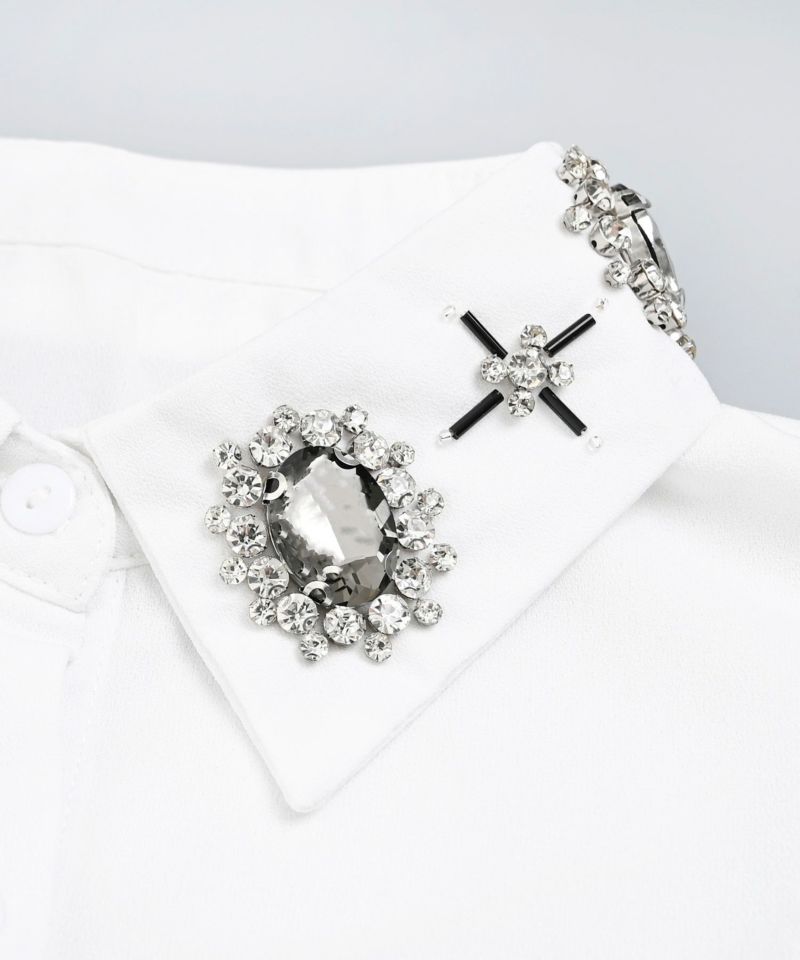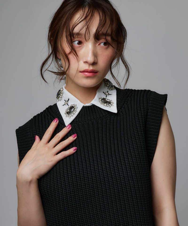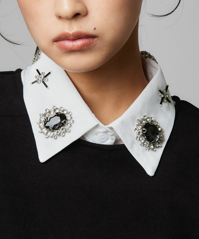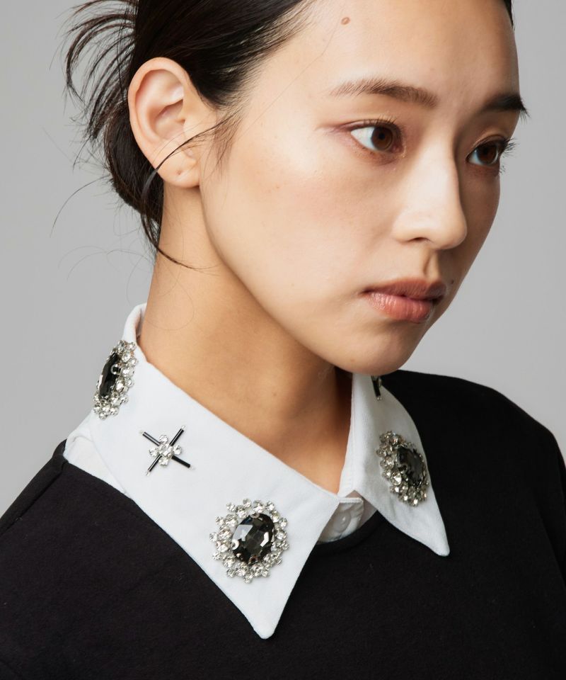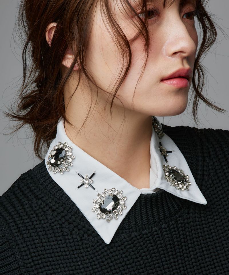 首元を一瞬で華やかに演出してくれるキュービックビジューのつけ襟。立体感のあるストーンが上品かつエッジの効いた印象に。普段のコーデにはもちろん、パーティーシーンや特別な日にもピッタリです。
