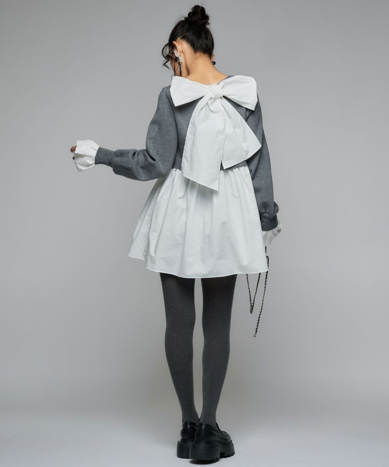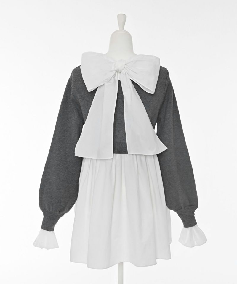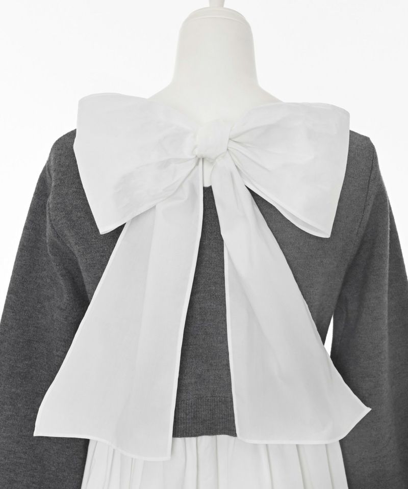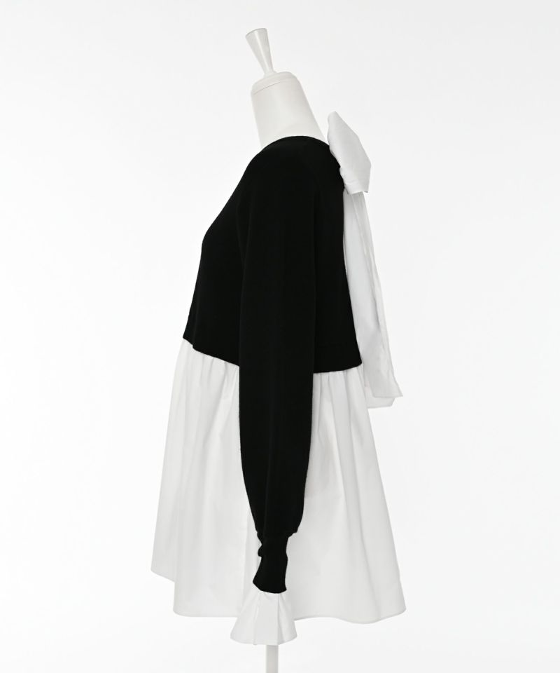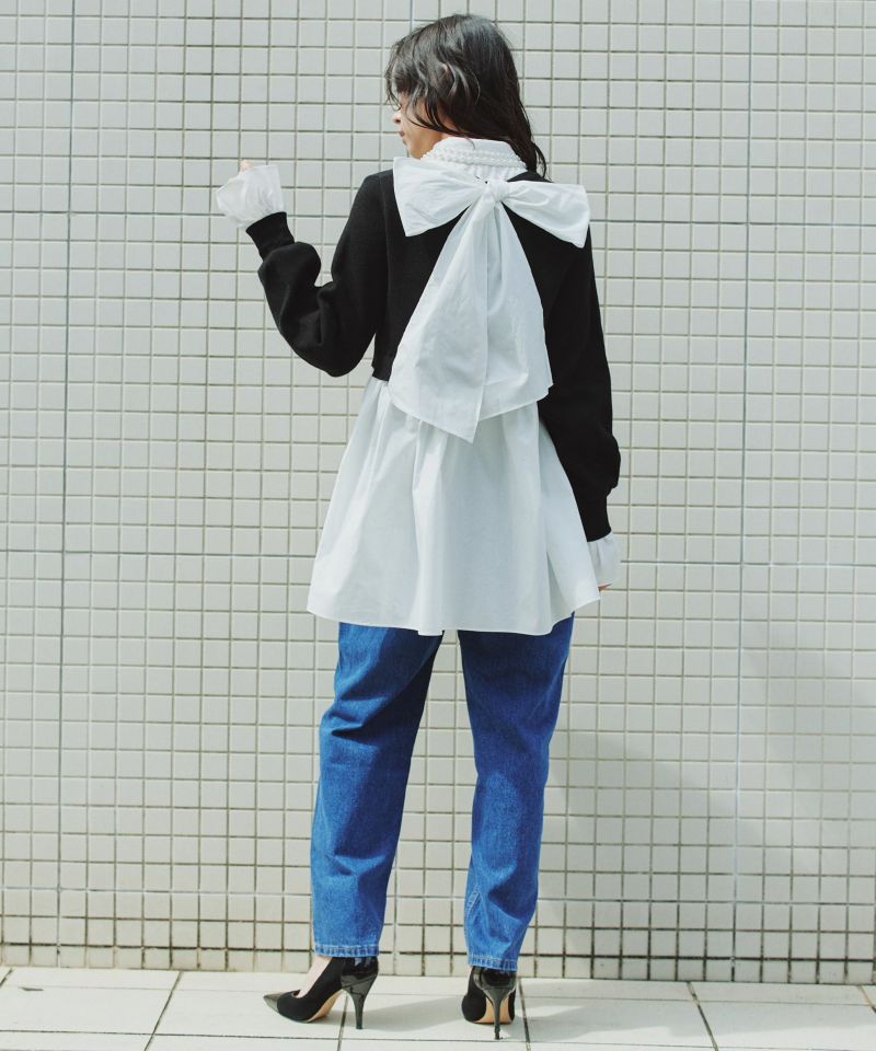 ペプラムシャツとニットトップスがドッキングしたデザインで、一枚で洗練されたレイヤードスタイルが完成します。リボンタイは前でも後ろでも結べる仕様で、アレンジ次第で印象を変えられるのが魅力。ニットの切り替え位置が高めに設定されているため、自然にスタイルアップが叶います。腰から下はペプラムデザインになっており、腰回りをさりげなくカバーしつつ女性らしいシルエットを演出。デイリーからお出かけまで幅広く活躍する、一枚でこなれ感を楽しめるアイテムです。