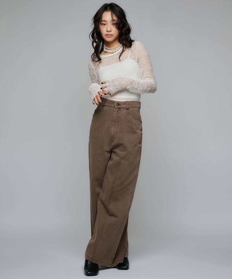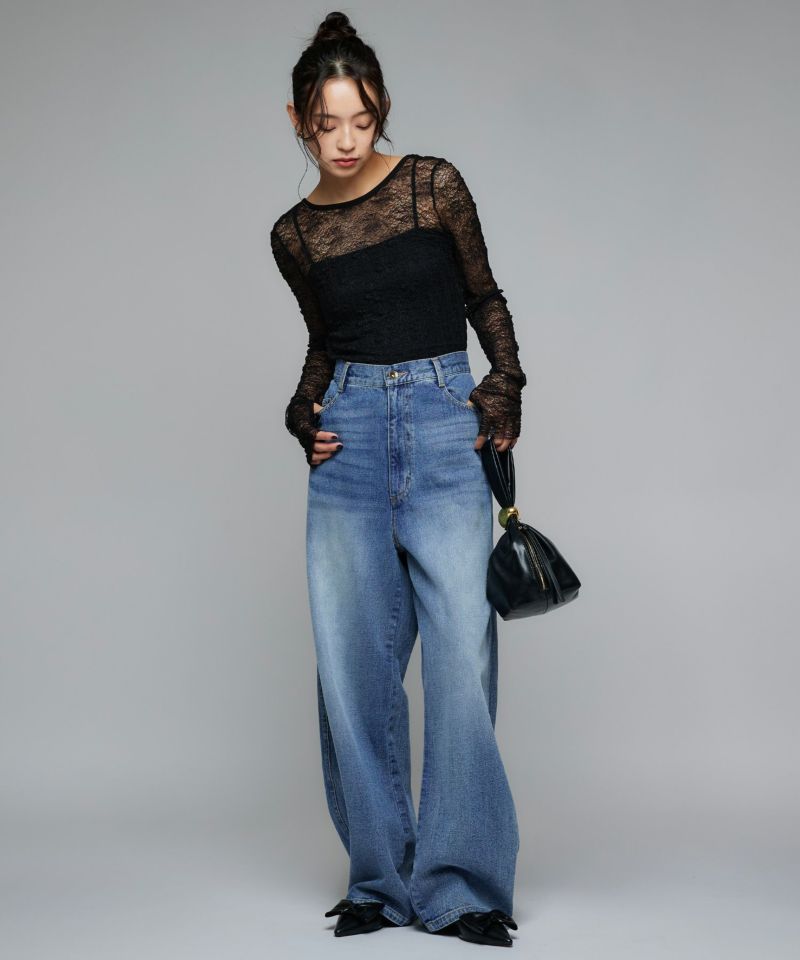 シンプルなデニムと合わせるだけでもレディライクに仕上がる一枚。スカートやパンツとも相性が良く、それぞれ形にこだわることなく、どんなアイテムにもはまります。ジャケットやカーディガン、ニットなどのインナーとして着用するのもおすすめです◎
