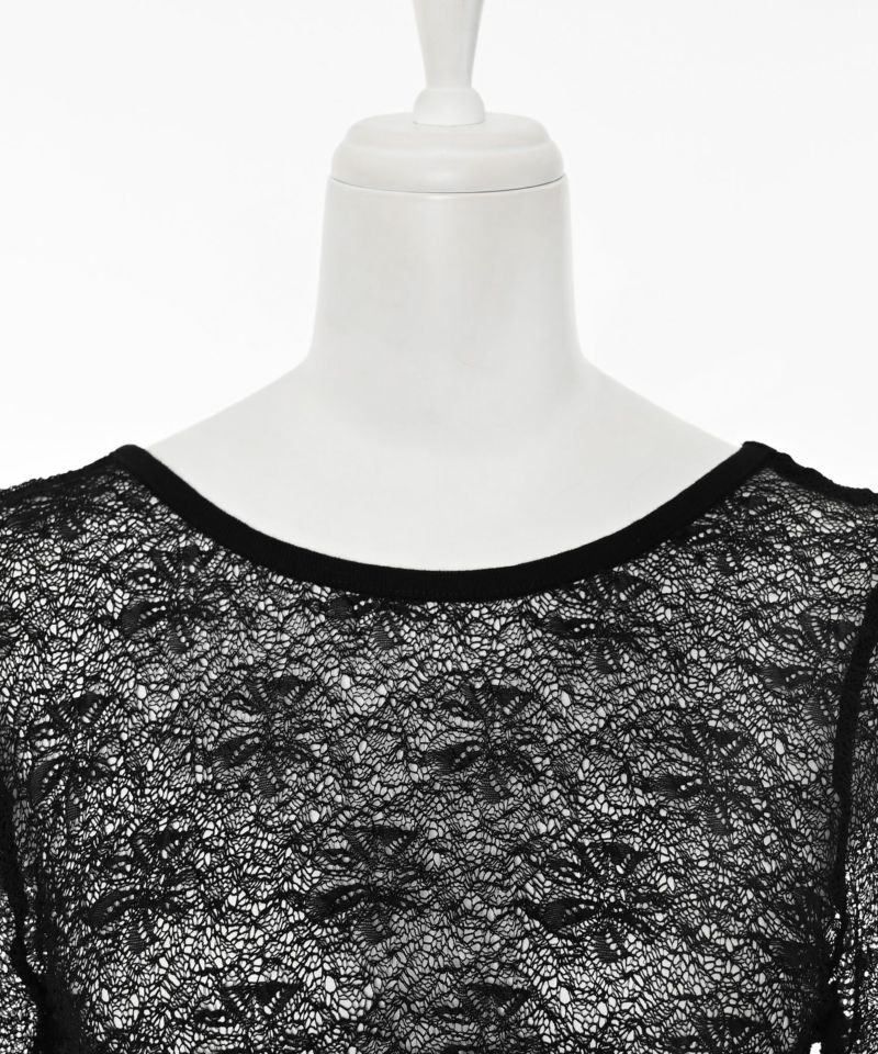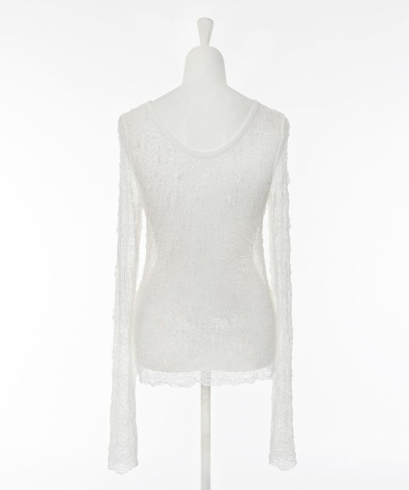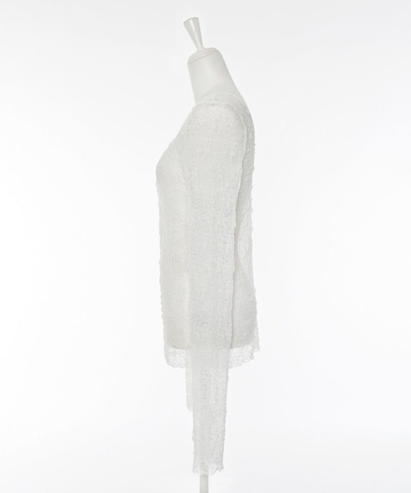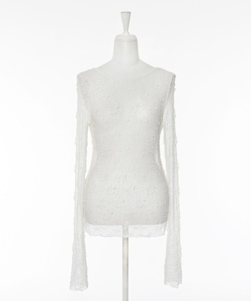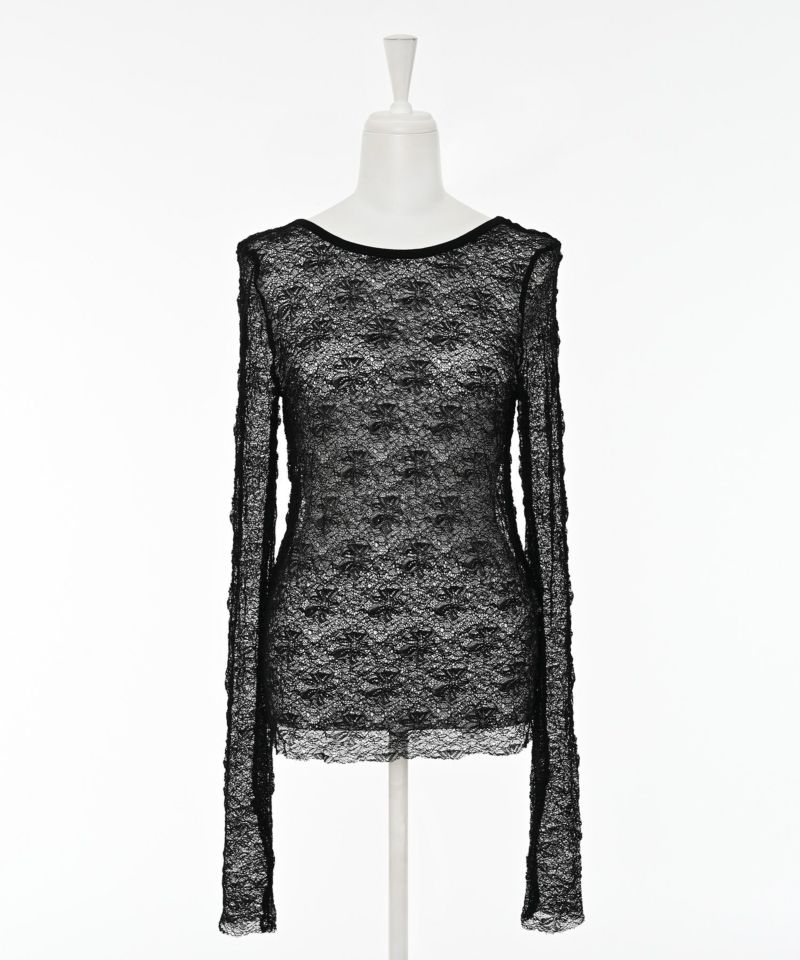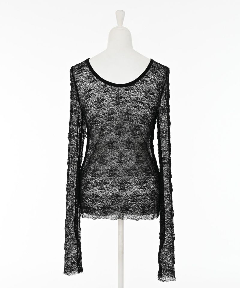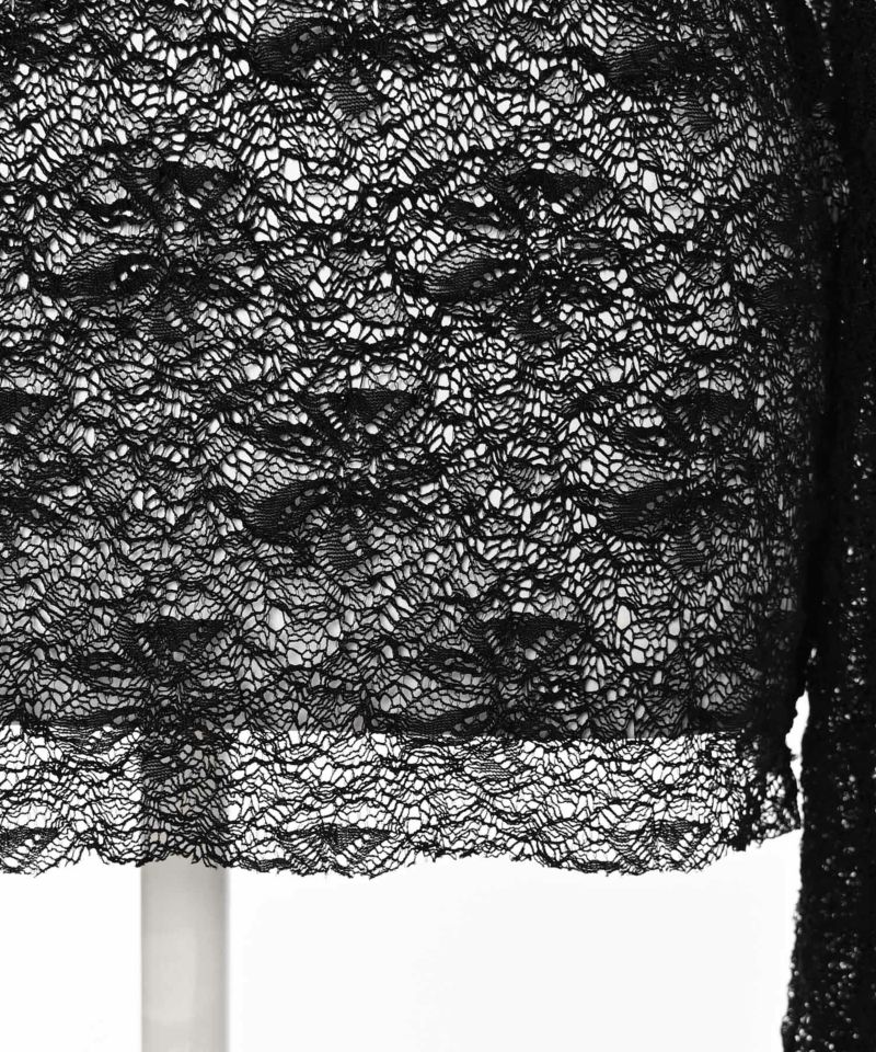 総レースに繊細な花柄をあしらい、上品さの中に華やかさを添えたトップス。長めのスリーブがエレガントなラインを描き、程よくフィットする身幅が女性らしいシルエットを引き立てます。袖口に施されたフィンガーホールはスタイリングにこなれたアクセントをプラスします。広めに開いたラウンドネックと、後ろの首元も深めに開いているデザインが抜け感を演出し、スタイルをすっきりと見せてくれる一枚です。