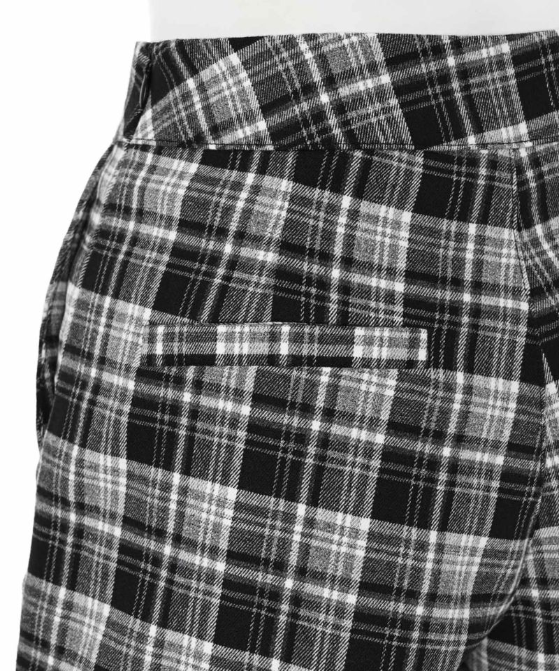 形自体はシンプルながらもチェック柄が特徴的なパンツ。バックはフェイクポケットでシンプルに仕上げつつ、フロントサイドには深めの実用ポケットを配置。見た目の美しさと機能性を両立したデザインです。ウエストは身体にフィットするサイズ感だが、裾に向かって若干広がるデザインが足のラインを拾わないのが嬉しいポイント。