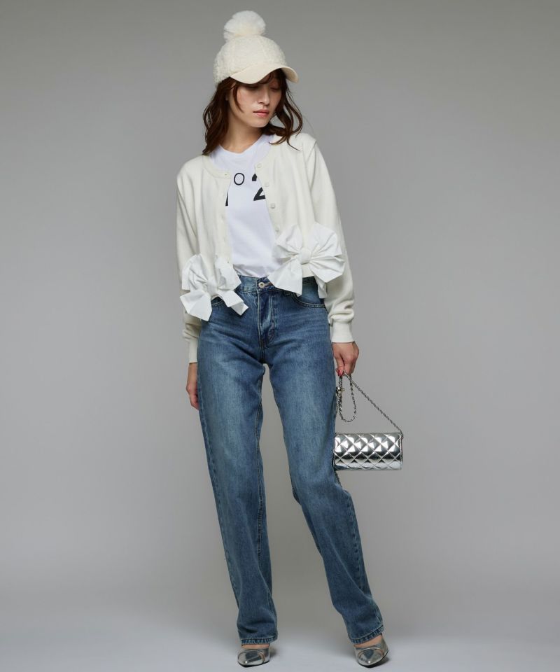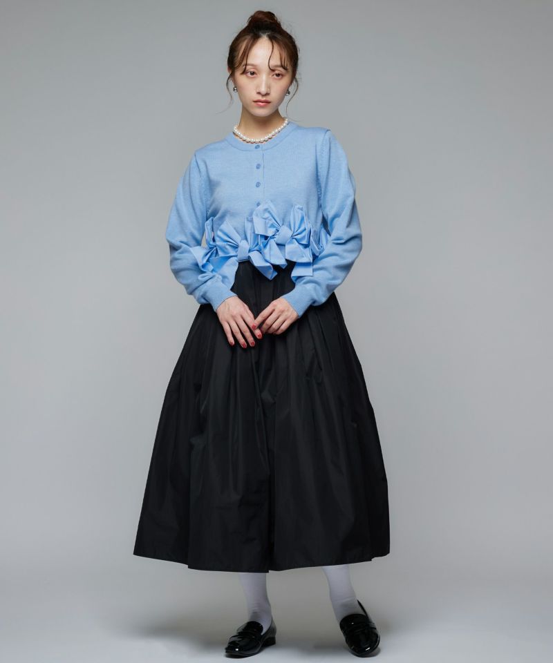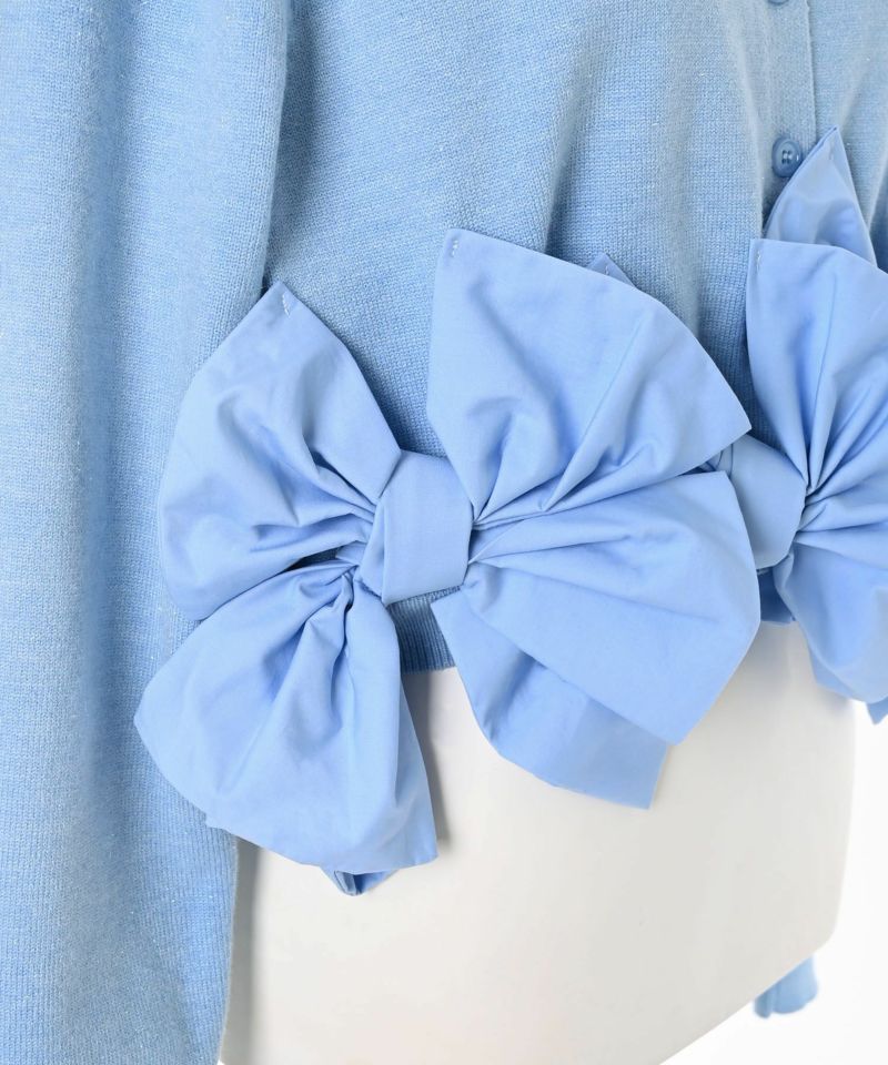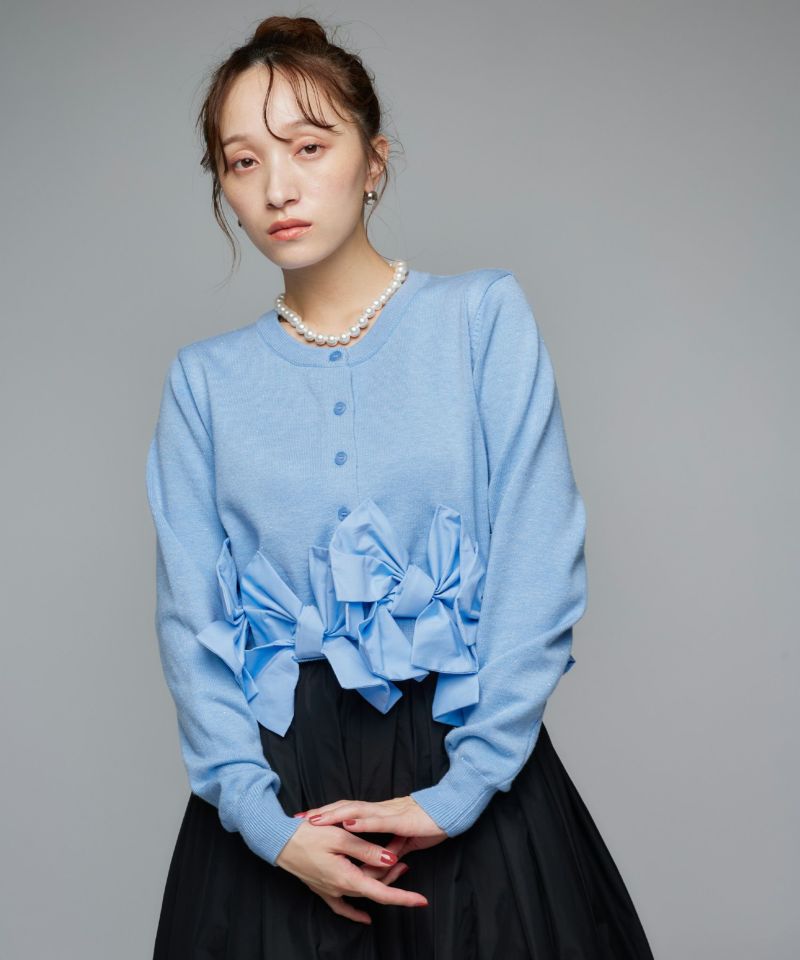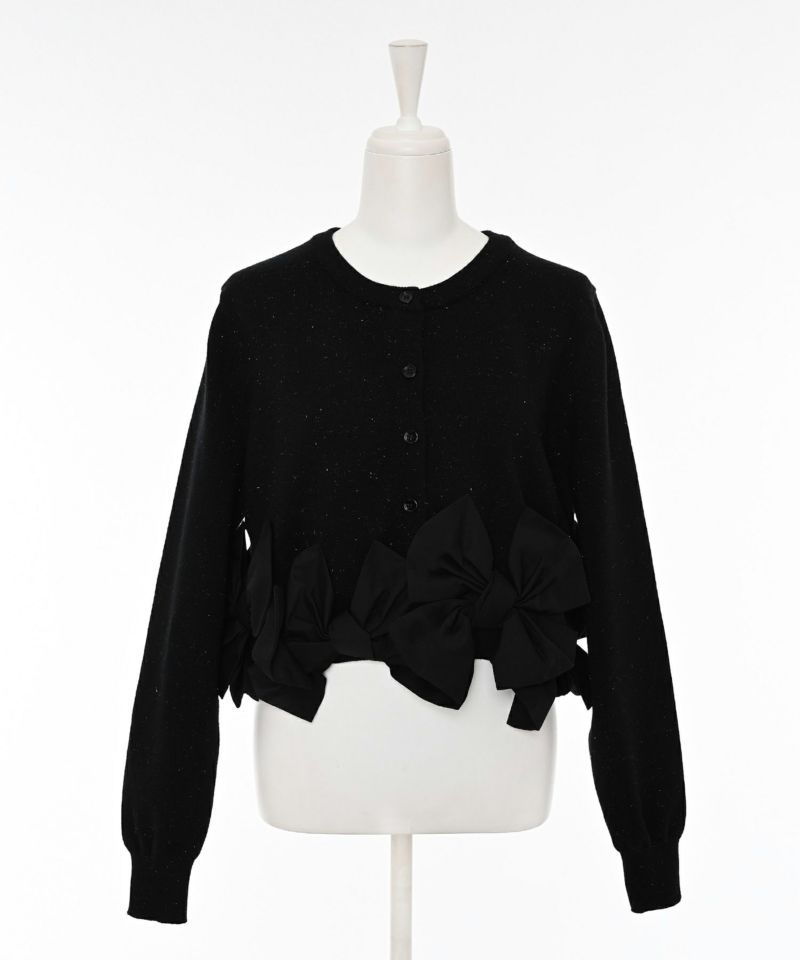 裾にあしらわれたリボンが印象的な、女性らしいシルエットのカーディガン。リボンのディテールがそのままデザインの主役となり、フェミニンな雰囲気を際立たせます。