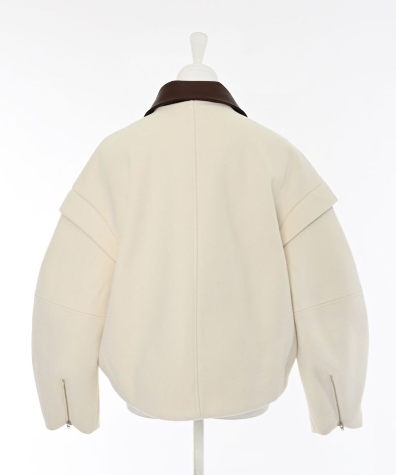 2WAY仕様のフェイクレザーカラーが目を惹くショートジャケット。袖口のファスナーでボリュームやシルエットのニュアンスを変えられる、デザイン性の高い一着です。