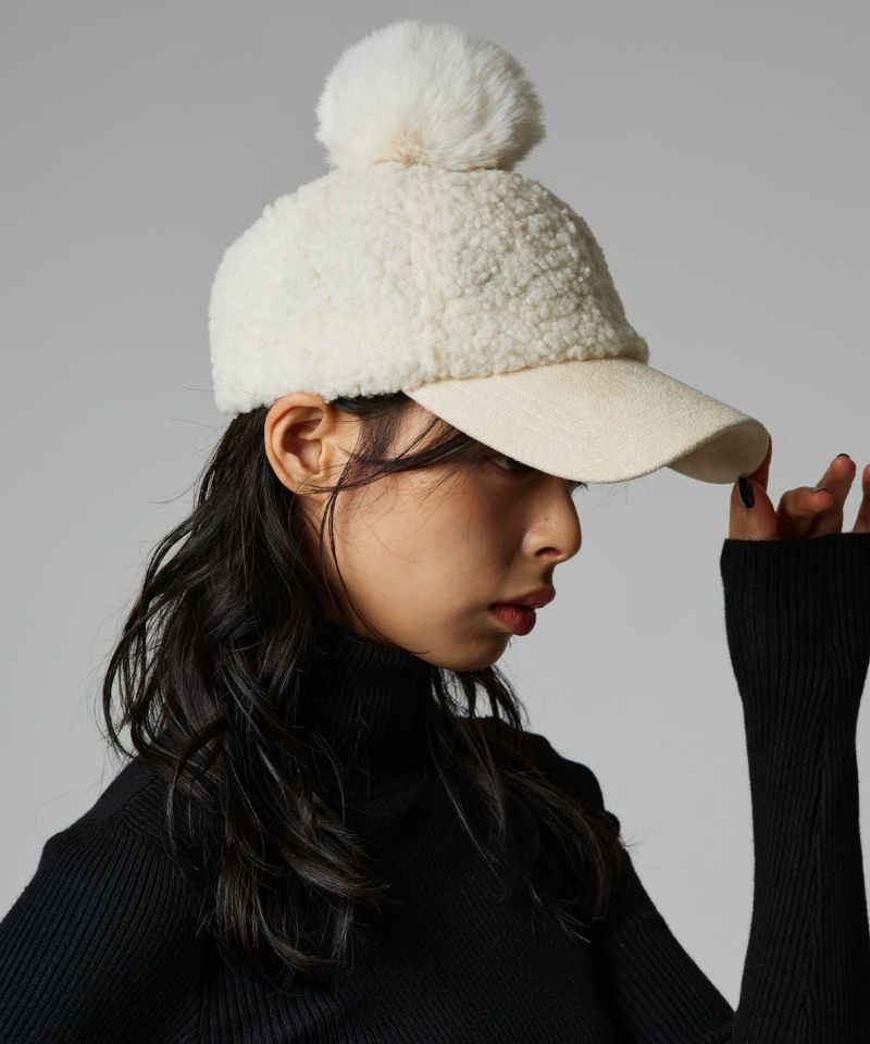 【ポイント】 もこもこのボア素材に大きなポンポンをあしらった、遊び心のあるキャップ。 可愛らしさとカジュアルさを両立し、冬のコーディネートに季節感と華やかさをプラスします。 【デザイン・シルエット】 ふんわりとしたボア素材がシーズンムードを高め、丸みのあるフォルムがやわらかな印象をプラス。甘すぎないカジュアルデザインでデイリーに取り入れやすく、後ろのアジャスターでサイズ調整も可能です。 【おすすめのスタイリング】 秋から冬にかけてどんなアイテムにも合わせやすく、カジュアルにもフェミニンにも季節のアクセントとして活躍するアイテムです。 【素材】 軽やかでふんわり柔らかなボア素材は保温性もありながらストレスフリー。ボリュームあるファーが女性らしさを引き立てます。