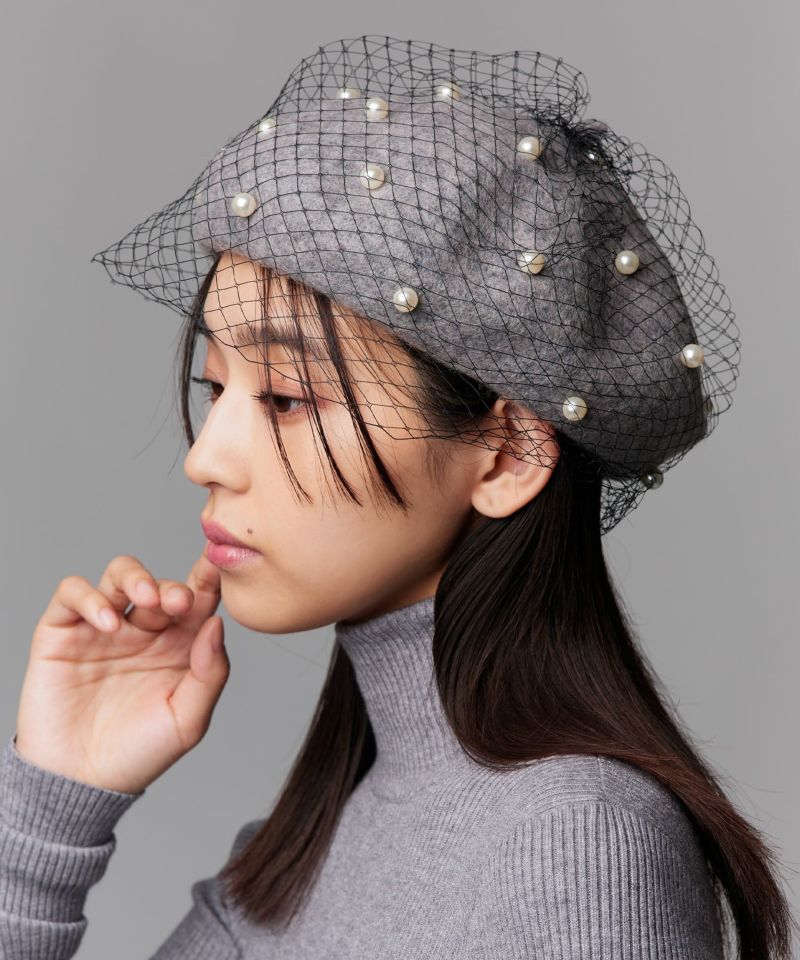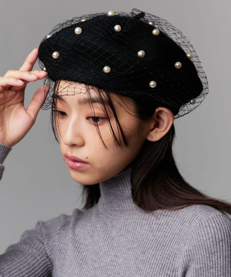 【ポイント】 全体をチュールで覆い、大粒のパールを散りばめた華やかなベレー帽。エレガントさの中にモードな雰囲気を纏い、コーディネートに洗練されたアクセントを添えてくれます。 【デザイン・シルエット】 大粒のパールを散りばめたデザインに、チュールを重ねた立体感のあるデザインが印象的なベレー帽。深めのシルエットが上品にまとまり、顔周りをすっきりと見せてくれます。サイズ調整が出来る仕様で、自分にフィットした美しい被り心地を叶えるアイテムです。 【おすすめのスタイリング】 ニットやカーディガン、と組み合わせればフェミニンに、ジャケットやモード感のあるワンピースにプラスすれば、一気に洗練された印象に。深めのシルエットが顔周りをすっきりと見せてくれるため、バランスの取れたスタイリングに。 【素材】 全体にほんのりと毛羽立ちのある生地感で、柔らかく温かみのある風合いが魅力。軽やかな被り心地で長時間着用しても快適なのもポイントです。