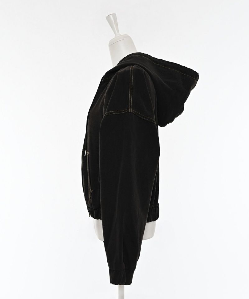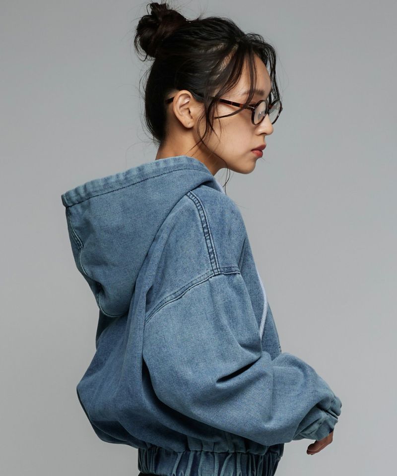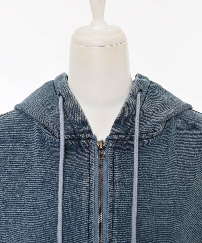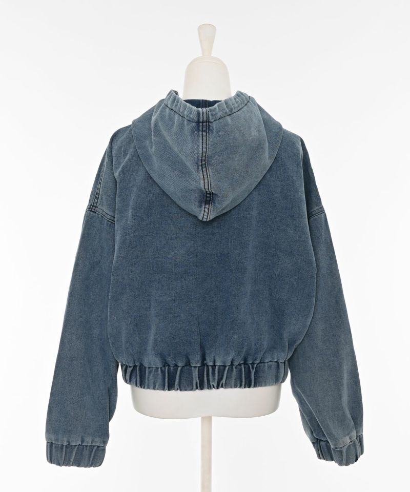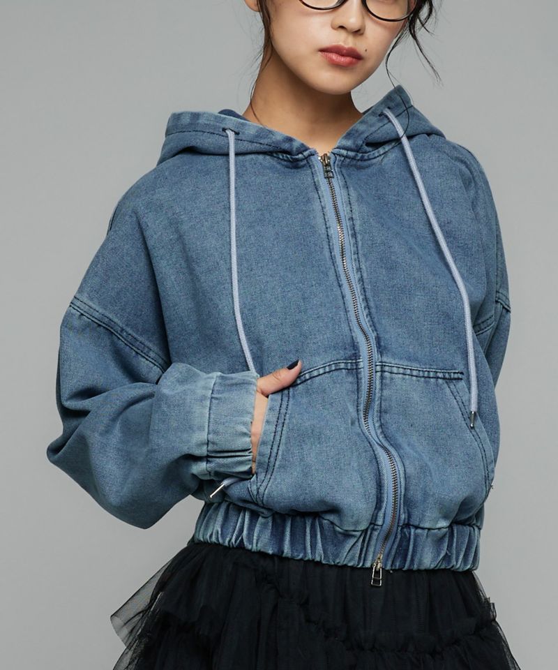 デニム素材で仕立てたジップアップパーカー。ドロップショルダーのゆったりとした袖と、裾に施されたギャザーが生み出す丸みのあるシルエットが魅力です。ショート丈のバランスが全体をコンパクトにまとめ、スタイルアップ効果を演出。フードとフロントジップのディテールがカジュアルな表情を添えつつ、ラフ過ぎない洗練された印象に。